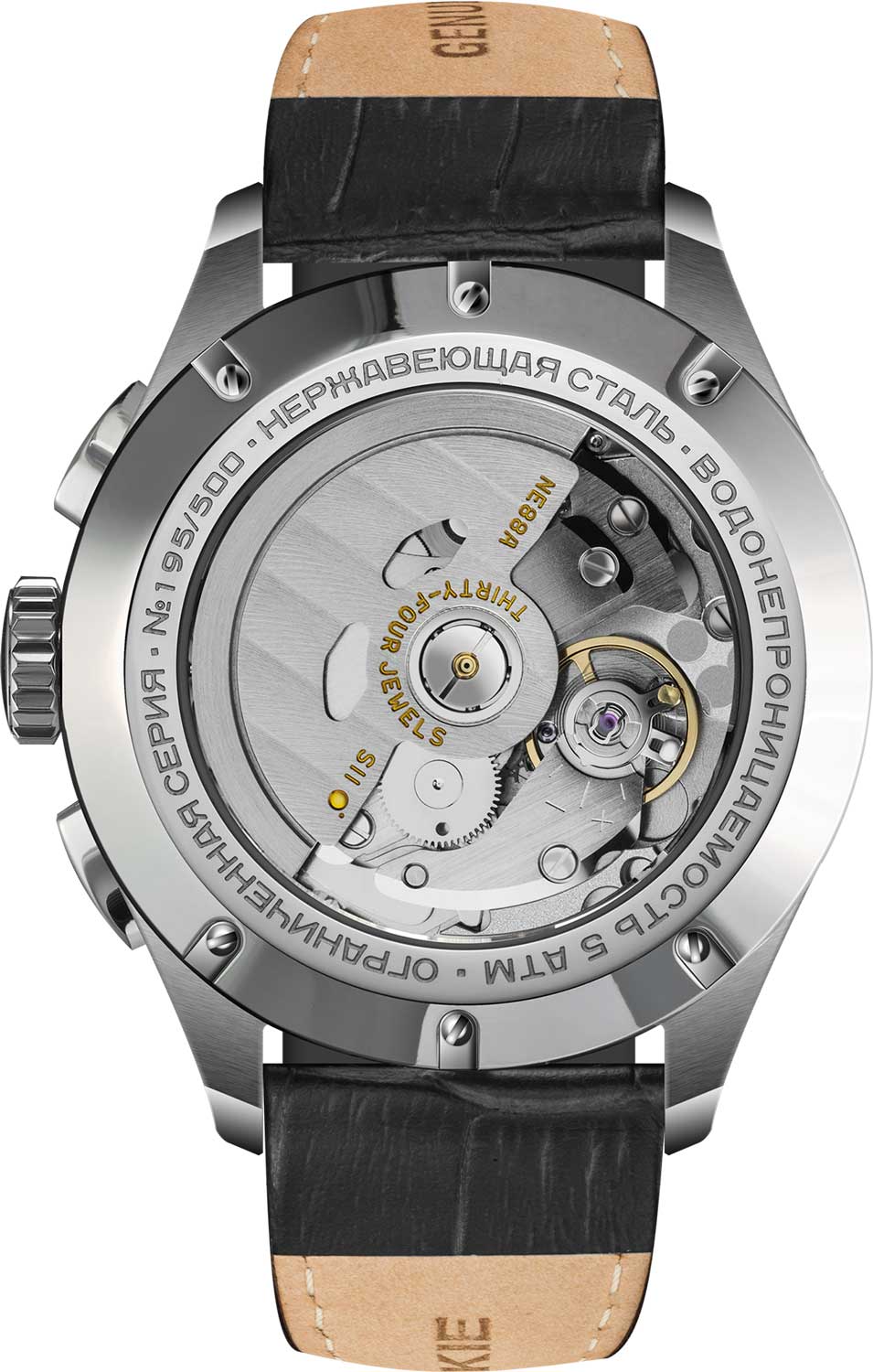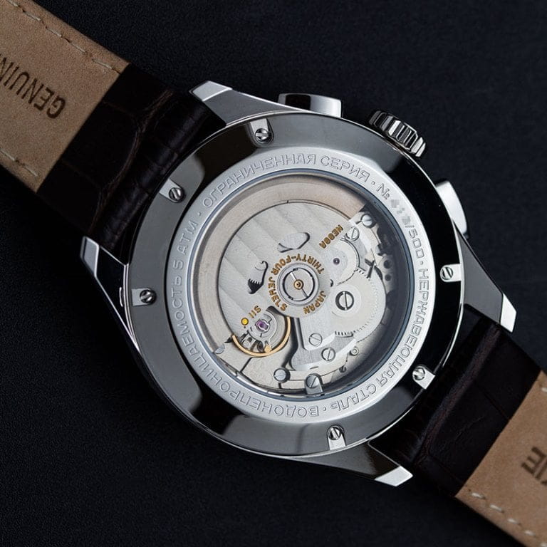 Лимитированные мужские российские механические часы-хронографХронографФункция позволяет измерять отрезки времени с особой точностью: часы, минуты, секунды. Верным признаком хронографа является наличие на циферблате 3 дополнительных окошек-счётчиков. с секундомеромСекундомерСекундоме́р — прибор, способный измерять интервалы времени с точностью до долей секунды. Штурманские Открытый Космос NE88/1855008, механический механизм (автоматический калибр) с высокой точностью. Лимитированная серия - 500 экземпляров, посвящена первому выходу человека в открытый космос. Индивидуальная нумерация. Сапфировое стеклоСапфировое стеклоПрочный и надёжный материал из кристалла сапфира синтетического происхождения, характеризующийся особой твёрдостью и устойчивостью к царапинам и повреждениям. устойчивое к появлению царапин, обладающее высокой прозрачностью. Класс водозащиты: 50 метров, позволит защитить корпус от случайных брызг или капель дождя. Корпус часов изготовлен из стали. Кожаный ремешок на стандартной застёжке. Стрелки и метки с люминесцентным покрытиемЛюминесцентное покрытиеПозволяет считывать показания времени в темноте. Производители наносят на стрелки, часовые индексы, безель или поверхность циферблата светонакопительный состав, дающий холодное свечение.. Стальной корпус надежно защищает от повреждений механический японский калибр Seiko NE88 на 34 камня с запасом хода 42 часа. Подзавод у часов автоматический.