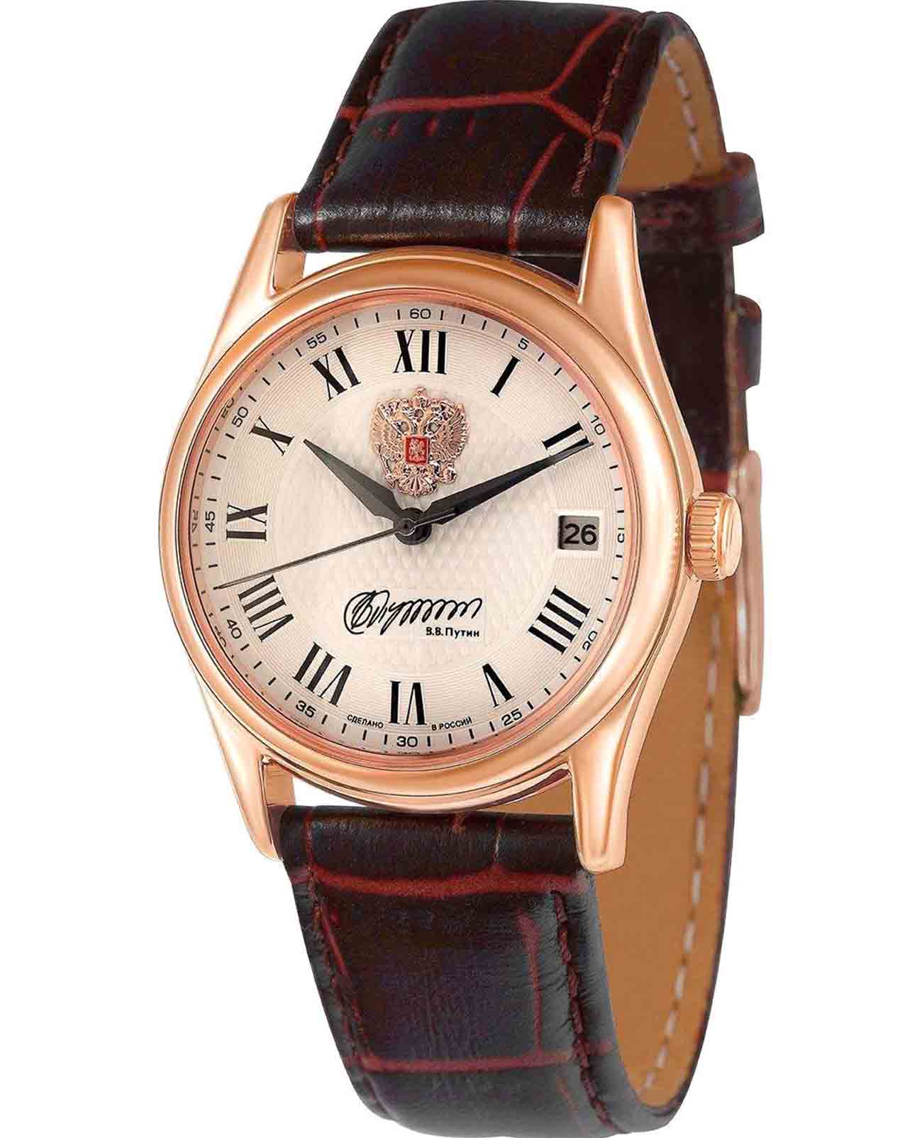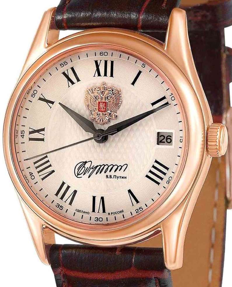 Российские механические наручные часы Слава 1503952/300-NH15, которые станут идеальным аксессуаром для повседневного ношения. Эти часы сочетают в себе элегантность и практичность, предлагая безупречный стиль и надежность. Оснащенные механизмом Seiko TMI NH15 с автоподзаводом, они обеспечивают точность и долговечность. Стальной корпус с IP-покрытиемIP-покрытиеМетод ионного напыления. Демонстрирует повышенную устойчивость к истиранию, окислению и химическим веществам. Под воздействием высокого давления и температуры около 1500°C молекулы металла надёжно соединяются с частицами корпуса часов. и сапфировым стекломСапфировое стеклоПрочный и надёжный материал из кристалла сапфира синтетического происхождения, характеризующийся особой твёрдостью и устойчивостью к царапинам и повреждениям. защищает белый циферблат с римскими цифрами. На циферблате изображены герб Российской Федерации и автограф В.В. Путина. Часы также имеют календарь с окошком даты на 3 часах и водозащиту до 50WR, что делает их надежными в различных условиях. Текстурированный кожаный ремешок с классической застежкой завершает этот изысканный образ.