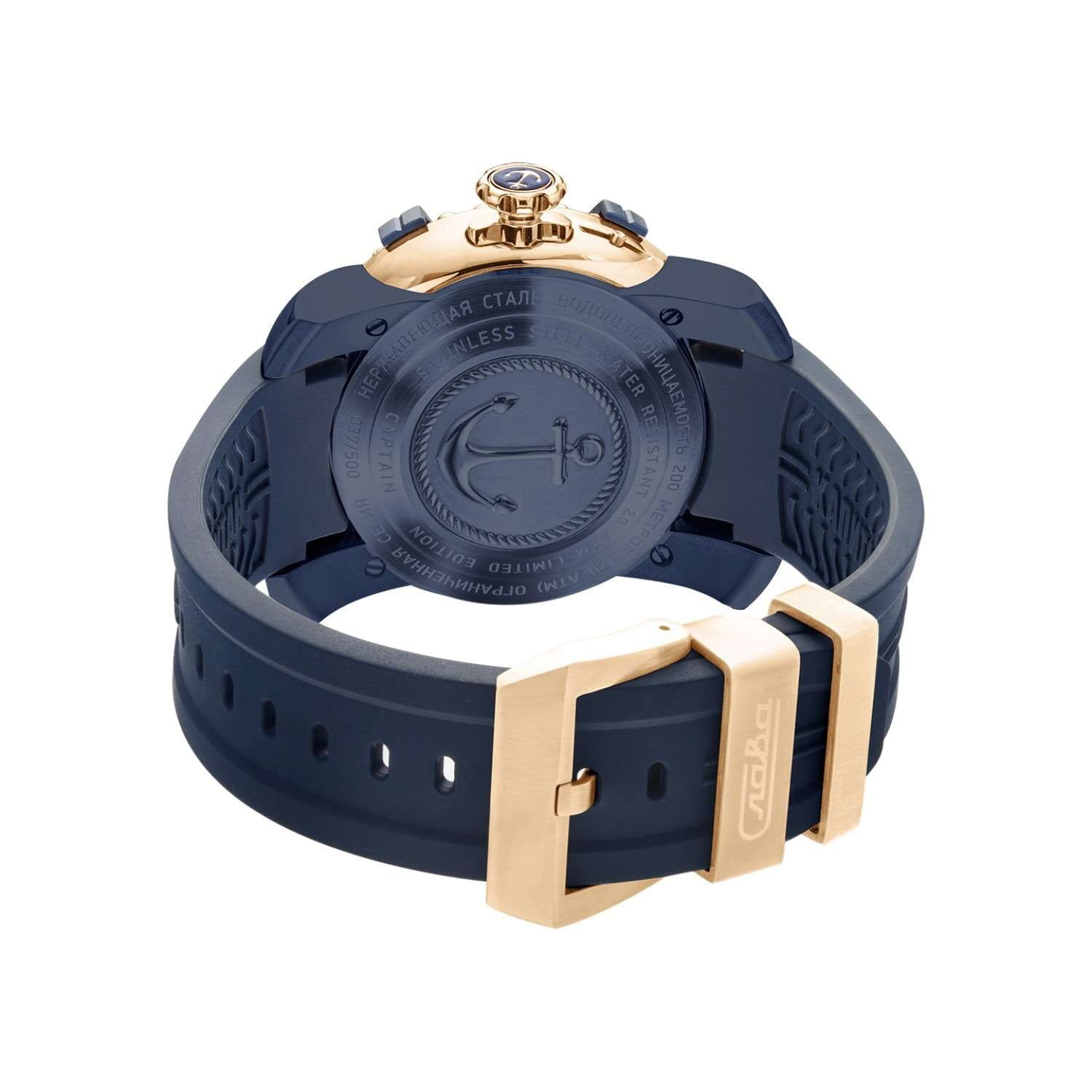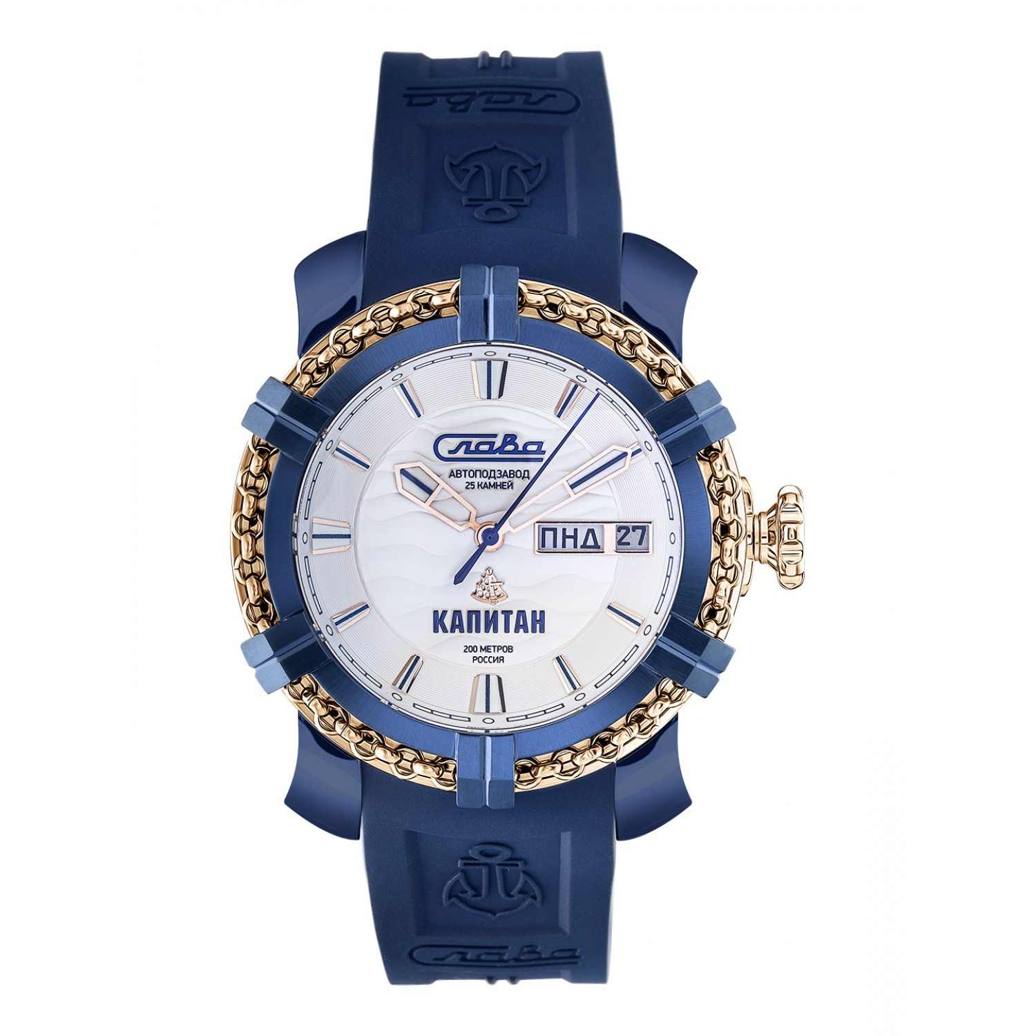 Российские механические наручные часы Слава Капитан 2473245/800-2427 — идеальный выбор для мужчин, ценящих стиль и надежность. Эта уникальная модель выпущена ограниченной серией в 500 экземпляров и сочетает в себе модный дизайн и высокое качество исполнения. Корпус часов выполнен из прочной стали с синим IP-покрытиемIP-покрытиеМетод ионного напыления. Демонстрирует повышенную устойчивость к истиранию, окислению и химическим веществам. Под воздействием высокого давления и температуры около 1500°C молекулы металла надёжно соединяются с частицами корпуса часов. и имеет диаметр 44 мм и толщину 16 мм, что придает им солидный и мужественный вид. БезельБезельВнешний ободок, закрепляющий стекло. В спортивных часах так называется поворотное кольцо с делениями на циферблате, выполняет роль таймера – замеряет отрезки времени на шкале. Неподвижный безель – элемент декора. Однонаправленно вращающийся безель на дайверских часах позволяет фиксировать моменты погружения и выныривания на поверхность. часов с IP-покрытиемIP-покрытиеМетод ионного напыления. Демонстрирует повышенную устойчивость к истиранию, окислению и химическим веществам. Под воздействием высокого давления и температуры около 1500°C молекулы металла надёжно соединяются с частицами корпуса часов. покрытием сине-золотого цвета, выполненный в форме штурвала под стать названию коллекции "Капитан", придаёт часам неповторимый морской характер и стиль. Водозащита до 20 ATM позволяет использовать часы даже при погружении в воду, что делает их отличным выбором для активных мужчин. Белый циферблат с метками и сапфировое стеклоСапфировое стеклоПрочный и надёжный материал из кристалла сапфира синтетического происхождения, характеризующийся особой твёрдостью и устойчивостью к царапинам и повреждениям. обеспечивают долговечность и устойчивость к царапинам. Механический механизм "Слава 2427" с автоподзаводом и возможностью ручного подзавода гарантирует точность и надежность, а двойной календарь добавляет функциональности. На 3 часах расположено окошко с указателем даты и дня недели. Часы комплектуются прочным силиконовым ремешком со стандартной застежкой, обеспечивающим комфорт и надежную фиксацию на запястье. Задняя крышка крепится на 4-х винтах и украшена объемным изображением якоря. Индивидуальный серийный номер. Упакованы в стильную подарочную коробку из экокожи, они станут отличным подарком для любого особого случая. С часами Слава из коллекции Капитан вы подчеркнете свой статус и вкус, оставаясь верным российским традициям качества и стиля.
