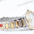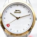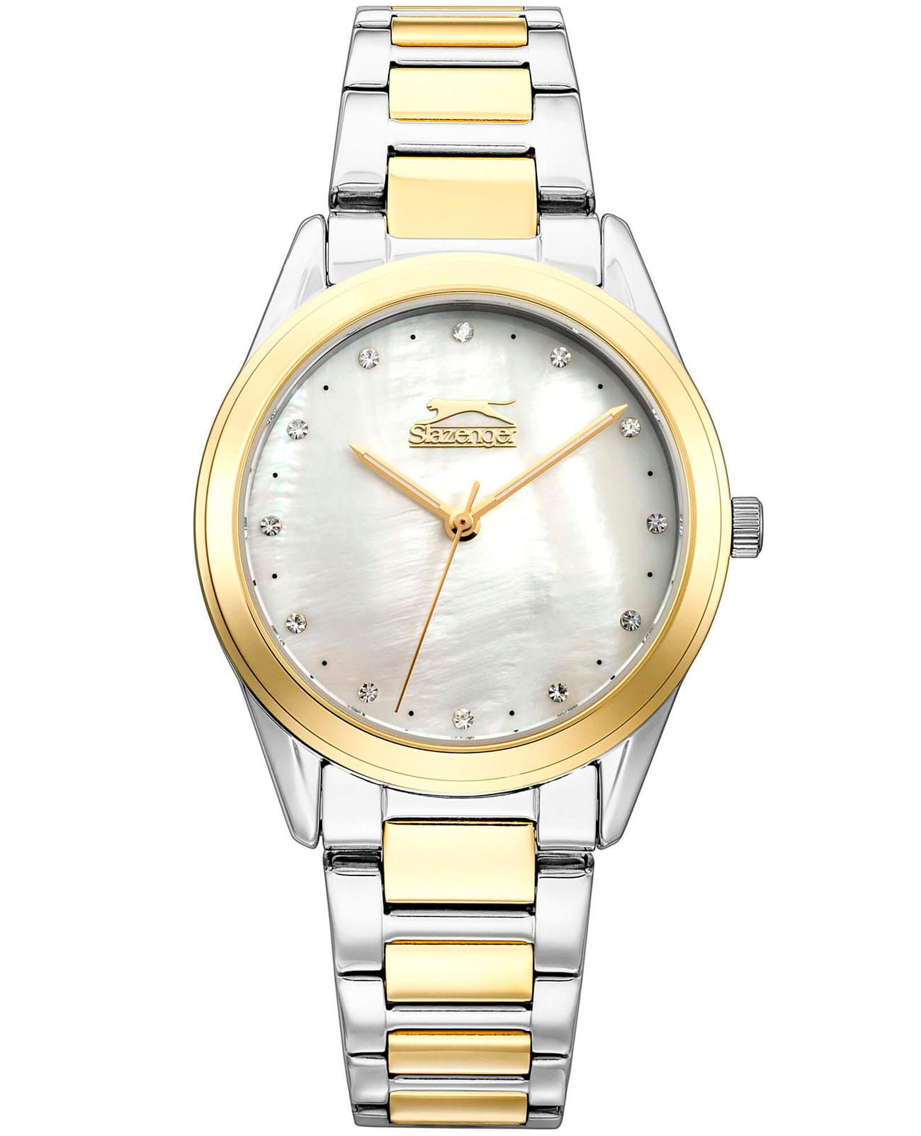 Женские наручные часы Slazenger SL.09.2013.3.04 из коллекции, сочетающей элегантность и практичность в классическом дизайне. Модель обладает круглым корпусом диаметром 35 мм, изготовленным из суперметалла, что обеспечивает высокую устойчивость к внешним воздействиям. БезельБезельВнешний ободок, закрепляющий стекло. В спортивных часах так называется поворотное кольцо с делениями на циферблате, выполняет роль таймера – замеряет отрезки времени на шкале. Неподвижный безель – элемент декора. Однонаправленно вращающийся безель на дайверских часах позволяет фиксировать моменты погружения и выныривания на поверхность. с IP-покрытиемIP-покрытиеМетод ионного напыления. Демонстрирует повышенную устойчивость к истиранию, окислению и химическим веществам. Под воздействием высокого давления и температуры около 1500°C молекулы металла надёжно соединяются с частицами корпуса часов.. Циферблат украшен кристаллами в виде фианитов, добавляя модели особую роскошь и шарм. Для защиты используется минеральное стеклоМинеральное стеклоМинеральное стекло представляет собой искусственно выращенный минерал кварца. Такое стекло отличается особой устойчивостью к повреждениям и царапинам. Уступает по некоторым качествам сапфировому стеклу., обеспечивающее надежную защиту от царапин. Часы комплектуются браслетом из нержавеющей стали с комбинированным цветом серебро с золотом и раскладной застежкойРаскладной замокДанный вариант застежки используется только на часах с металлическим браслетом. Отличительная особенность такого крепления в том, что длина браслета становится универсальной и вы можете самостоятельно отрегулировать нужный вам размер – застежка просто двигается по браслету часов., гарантирующей комфортное ношение. Модель работает на кварцевом механизме, что обеспечивает высокую точность хода времени. Водонепроницаемость часов составляет 3 атмосферы (30 метров), подходящую для ежедневного использования, но не рекомендуется для плавания или дайвинга.