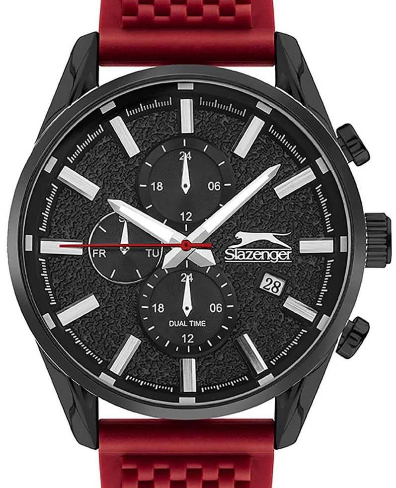 Часы Slazenger SL.09.2060.2.05 представляют собой стильное и функциональное дополнение к вашему образу. Их черный циферблат и корпус с безелемБезельВнешний ободок, закрепляющий стекло. В спортивных часах так называется поворотное кольцо с делениями на циферблате, выполняет роль таймера – замеряет отрезки времени на шкале. Неподвижный безель – элемент декора. Однонаправленно вращающийся безель на дайверских часах позволяет фиксировать моменты погружения и выныривания на поверхность. из суперметалла с IP-покрытиемIP-покрытиеМетод ионного напыления. Демонстрирует повышенную устойчивость к истиранию, окислению и химическим веществам. Под воздействием высокого давления и температуры около 1500°C молекулы металла надёжно соединяются с частицами корпуса часов. создают элегантный и современный вид, который подчеркнет вашу индивидуальность. Эти мужские часы оснащены кварцевым механизмом, обеспечивающим точность хода. Минеральное стеклоМинеральное стеклоМинеральное стекло представляет собой искусственно выращенный минерал кварца. Такое стекло отличается особой устойчивостью к повреждениям и царапинам. Уступает по некоторым качествам сапфировому стеклу. защищает циферблат от царапин, а люминесцентное покрытиеЛюминесцентное покрытиеПозволяет считывать показания времени в темноте. Производители наносят на стрелки, часовые индексы, безель или поверхность циферблата светонакопительный состав, дающий холодное свечение. на стрелках позволяет легко считывать время даже в темноте. Функциональность часов дополнена вторым часовым поясомВторой часовой поясФункция, позволяющая отображать время двух часовых поясов одновременно., 24-часовым указателем времени, календарем даты в районе 4 часа и дня недели. Красный браслет из силикона гармонично дополняет общий дизайн. Размер корпуса составляет 44 мм в диаметре и 12 мм в толщину, что делает их удобными для повседневного ношения. А водозащита уровня 5 ATM делает их надежными спутниками даже в условиях повышенной влажности.