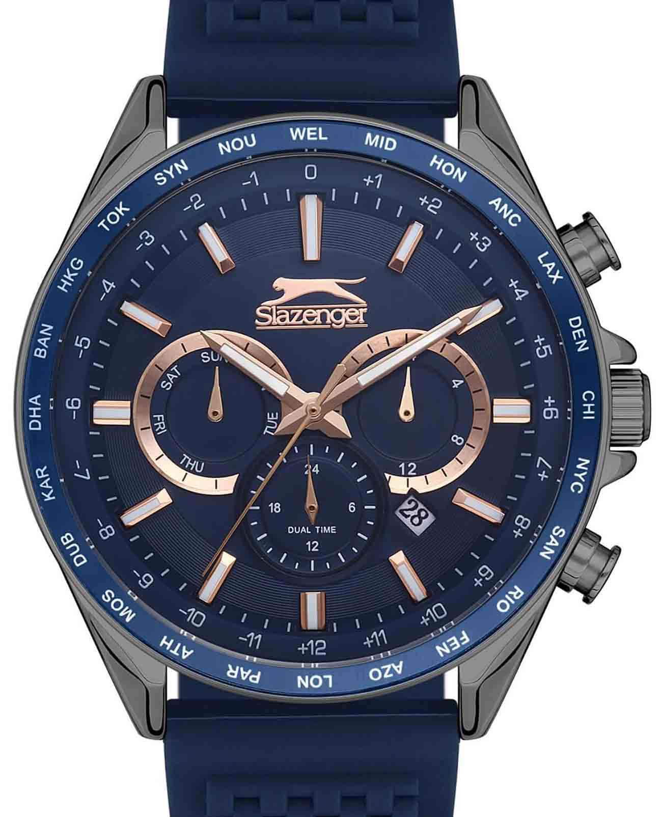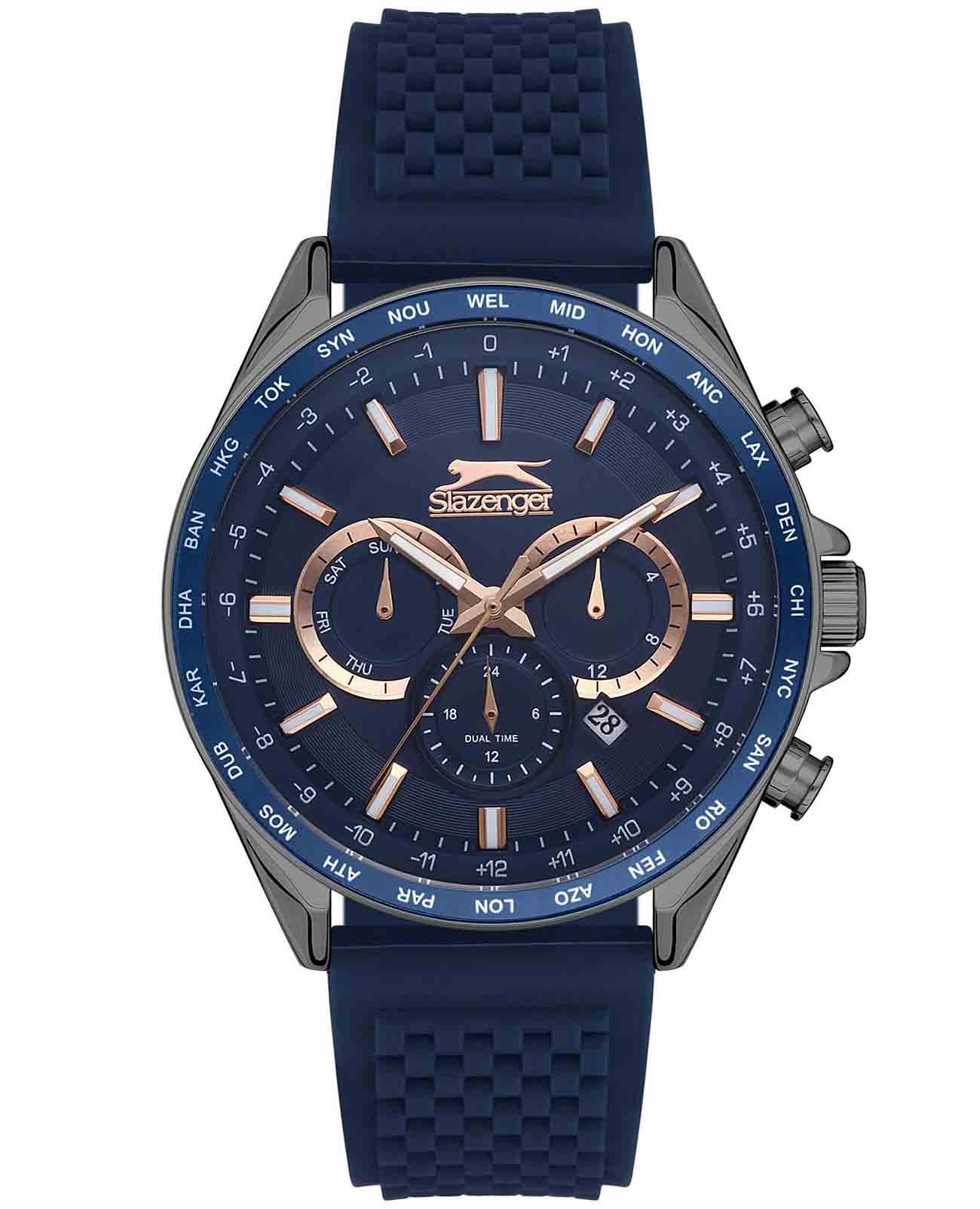 Мужские наручные часы Slazenger SL.09.2179.2.03 — стильный аксессуар с ярко выраженными спортивными чертами, который станет надежным спутником в повседневной жизни. Эти часы оснащены кварцевым механизмом, обеспечивающим высокую точность хода. Металлический корпус с серым IP-покрытиемIP-покрытиеМетод ионного напыления. Демонстрирует повышенную устойчивость к истиранию, окислению и химическим веществам. Под воздействием высокого давления и температуры около 1500°C молекулы металла надёжно соединяются с частицами корпуса часов. в сочетании с синим силиконовый ремешком на классической застежке шириной 22 мм создает гармоничный и современный образ. Диаметр корпуса составляет 45 мм, а толщина — 11 мм, что придает часам стильный и выразительный вид. БезельБезельВнешний ободок, закрепляющий стекло. В спортивных часах так называется поворотное кольцо с делениями на циферблате, выполняет роль таймера – замеряет отрезки времени на шкале. Неподвижный безель – элемент декора. Однонаправленно вращающийся безель на дайверских часах позволяет фиксировать моменты погружения и выныривания на поверхность. с синим IP-покрытиемIP-покрытиеМетод ионного напыления. Демонстрирует повышенную устойчивость к истиранию, окислению и химическим веществам. Под воздействием высокого давления и температуры около 1500°C молекулы металла надёжно соединяются с частицами корпуса часов., что придает ему дополнительную прочность и устойчивость к износу. Минеральное стеклоМинеральное стеклоМинеральное стекло представляет собой искусственно выращенный минерал кварца. Такое стекло отличается особой устойчивостью к повреждениям и царапинам. Уступает по некоторым качествам сапфировому стеклу. защищает циферблат от царапин и внешних воздействий, а водозащита уровня WR 50 позволяет не беспокоиться о случайных контактах с водой, будь то дождь или мытье рук. Особенностью данной модели является наличие календаря, отображающего дату и день недели, а также возможность следить за временем во втором часовом поясе. Люминесцентное покрытиеЛюминесцентное покрытиеПозволяет считывать показания времени в темноте. Производители наносят на стрелки, часовые индексы, безель или поверхность циферблата светонакопительный состав, дающий холодное свечение. на стрелках и метках обеспечивает отличную видимость в темноте.