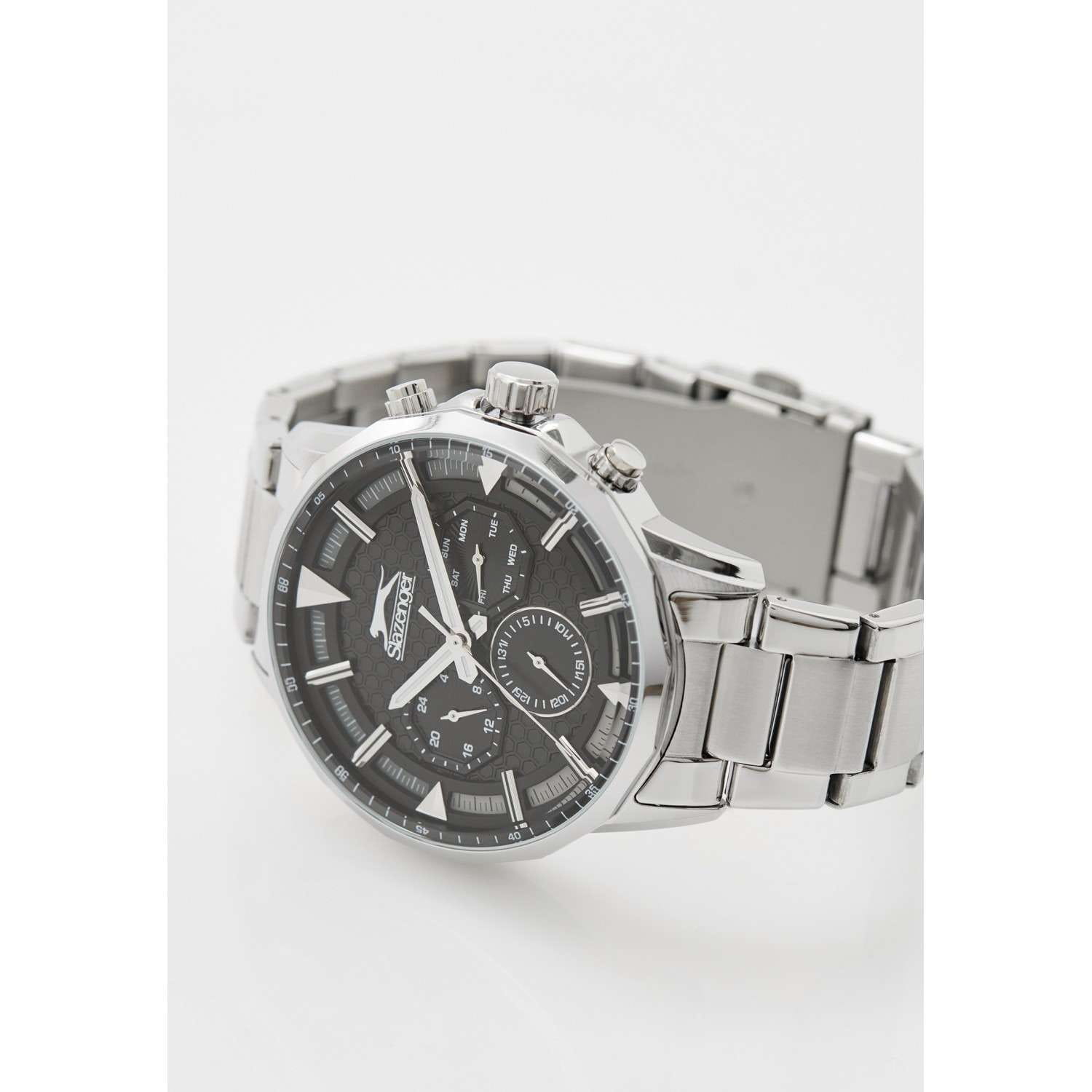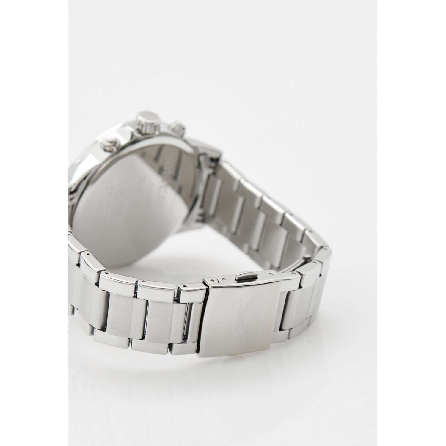 Стильные мужские наручные часы Slazenger SL.09.2216.2.01 станут идеальным аксессуаром для современного мужчины. Этот британский бренд славится своим качеством и надежностью, а данная модель не является исключением. Часы оснащены кварцевым механизмом, что обеспечивает точность хода и долговечность использования. Корпус часов выполнен из металла, а прочное  минеральное стеклоМинеральное стеклоМинеральное стекло представляет собой искусственно выращенный минерал кварца. Такое стекло отличается особой устойчивостью к повреждениям и царапинам. Уступает по некоторым качествам сапфировому стеклу. защищает циферблат от царапин и повреждений. Элегантный металлический браслет серебристого цвета снабжен удобной раскладной застёжкойРаскладная застёжкаТакой тип застёжки используется только на браслетах из металла. Она никогда не раскрывается полностью, происходит разделение на 2 и более частей. Раскладывающая застёжка снизит вероятность потери часов к минимуму., что гарантирует комфортное ношение на запястье. Ширина браслета составляет 22 мм, что придает часам солидный вид. Диаметр корпуса равен 45 мм, а толщина 12 мм, что делает эту модель заметной, но в то же время не громоздкой. Водозащита уровня WR 50 позволяет использовать часы в повседневной жизни, не беспокоясь о случайных попаданиях воды. Стрелки снабжены люминесцентным покрытиемЛюминесцентное покрытиеПозволяет считывать показания времени в темноте. Производители наносят на стрелки, часовые индексы, безель или поверхность циферблата светонакопительный состав, дающий холодное свечение., что позволяет легко считывать время в темноте. Функциональные возможности часов включают отображение даты, дня недели и времени в 24-часовом формате на дополнительных малых циферблатах. Это делает модель не только стильной, но и практичной в использовании.