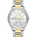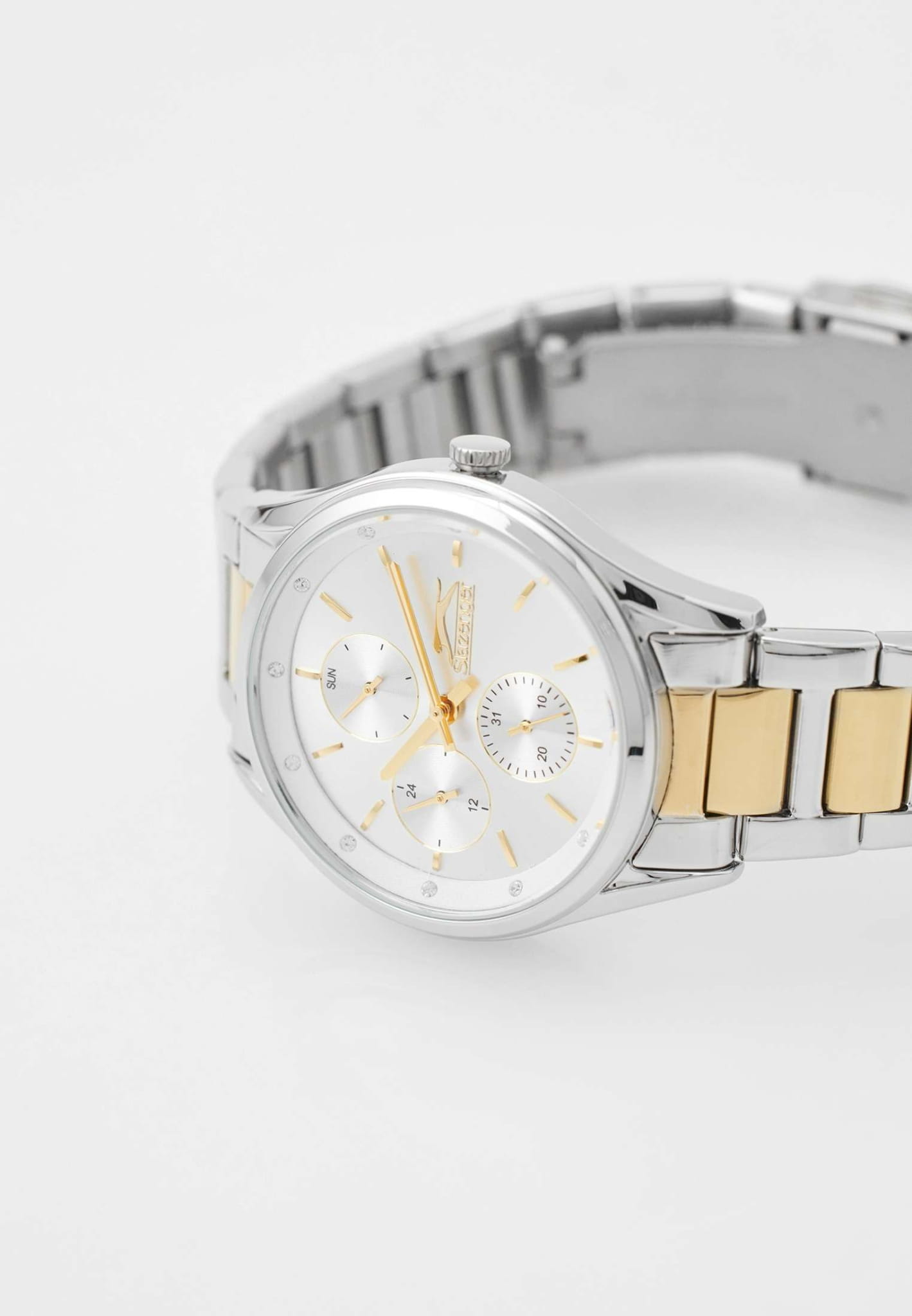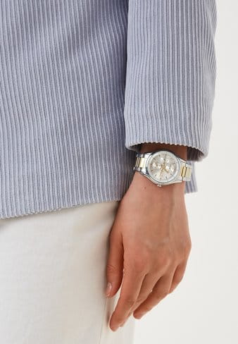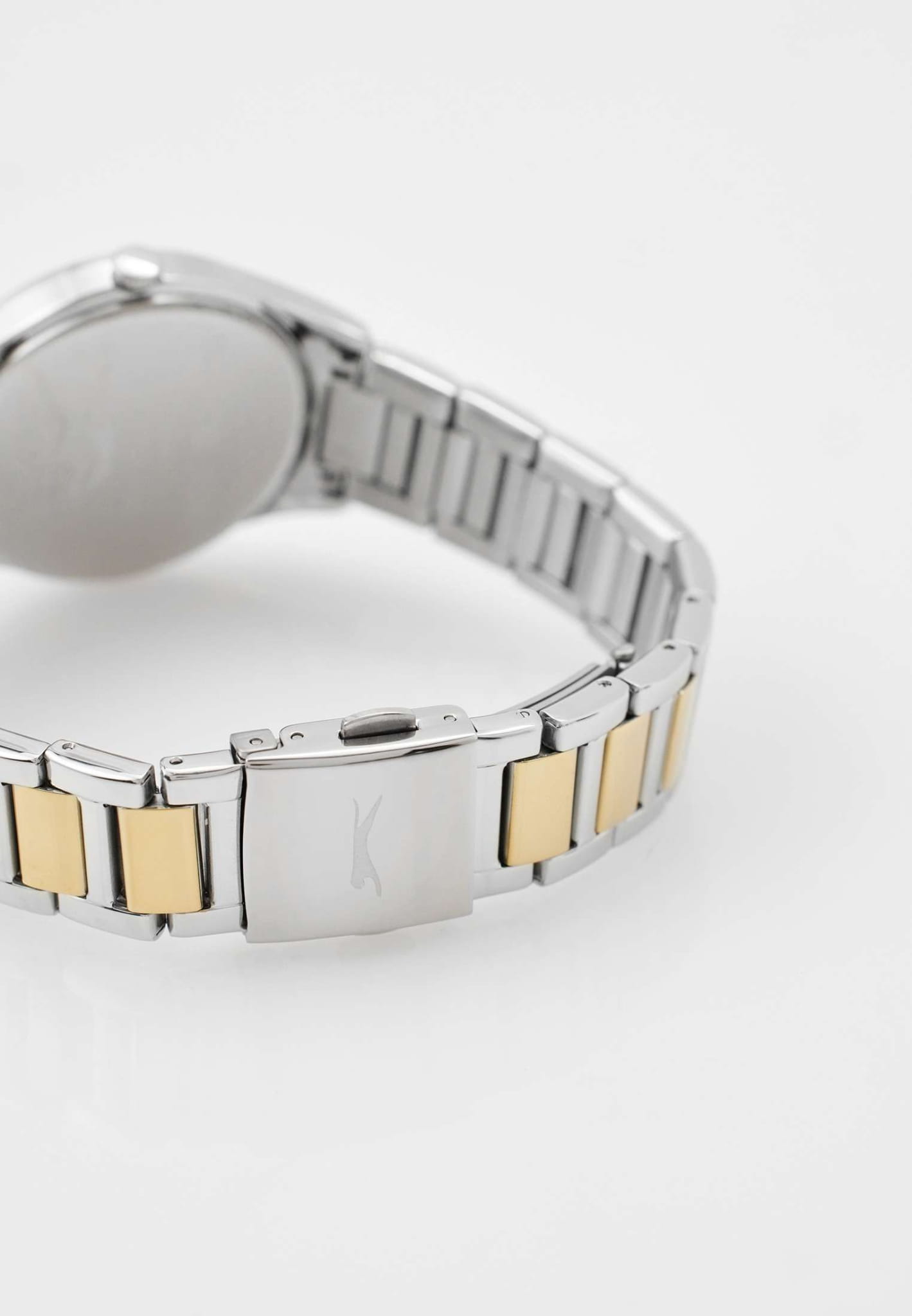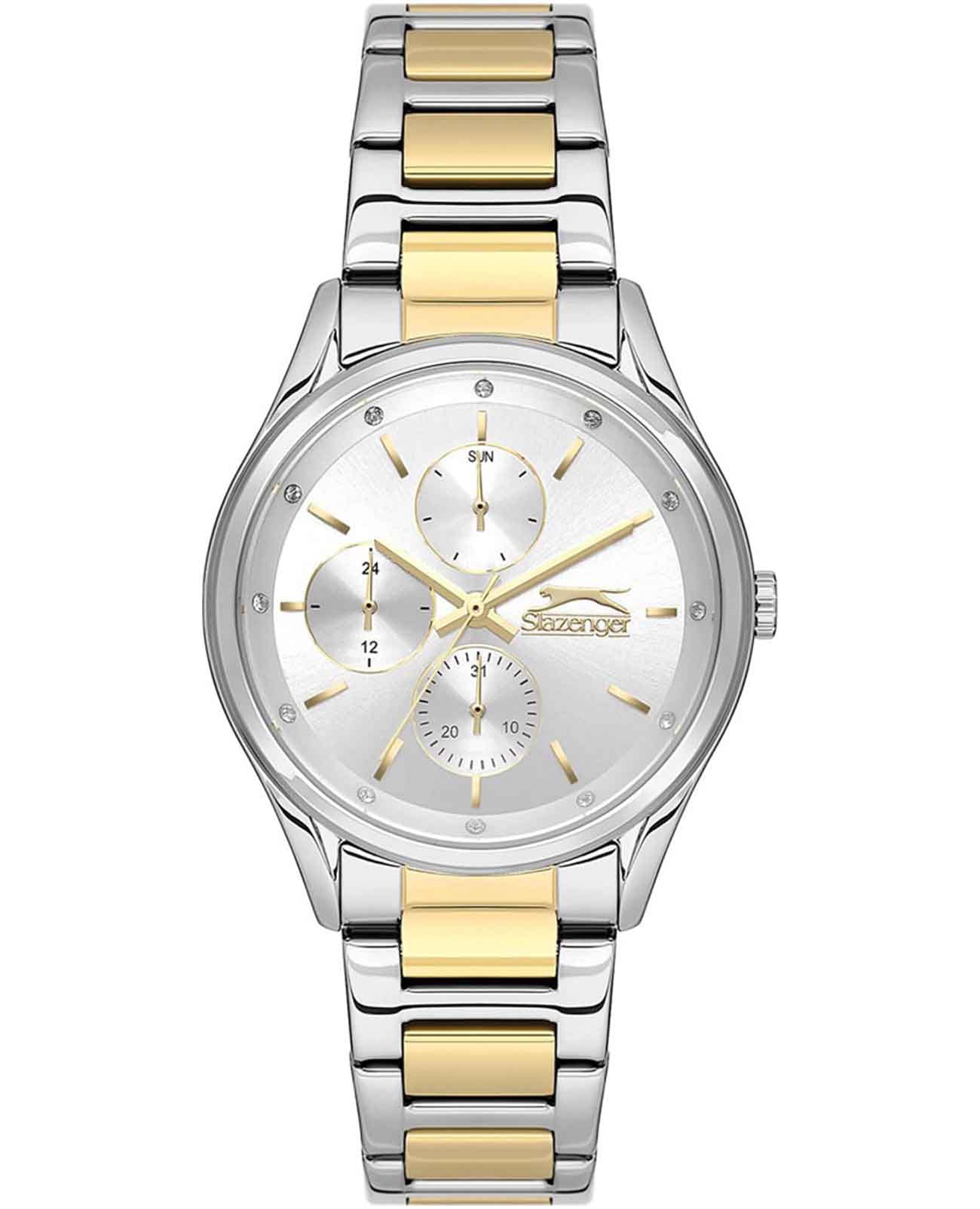 Часы Slazenger SL.09.2229.4.03 — это стильная и элегантная модель, созданная для современных женщин, ценящих изысканный дизайн и функциональность. Корпус выполнен из прочного металла серебристого цвета, что придает аксессуару особую утонченность. Циферблат украшен мерцающими кристаллами, а также оснащён дополнительными малыми циферблатами, которые отображают дату, день недели и время в 24-часовом формате. Минеральное стеклоМинеральное стеклоМинеральное стекло представляет собой искусственно выращенный минерал кварца. Такое стекло отличается особой устойчивостью к повреждениям и царапинам. Уступает по некоторым качествам сапфировому стеклу. надежно защищает часы от царапин, а водозащита уровня WR 30 позволяет не беспокоиться о случайном попадании влаги. Металлический браслет с частичным золотистым IP-покрытиемIP-покрытиеМетод ионного напыления. Демонстрирует повышенную устойчивость к истиранию, окислению и химическим веществам. Под воздействием высокого давления и температуры около 1500°C молекулы металла надёжно соединяются с частицами корпуса часов. снабжён удобной раскладной застёжкойРаскладная застёжкаТакой тип застёжки используется только на браслетах из металла. Она никогда не раскрывается полностью, происходит разделение на 2 и более частей. Раскладывающая застёжка снизит вероятность потери часов к минимуму.. Диаметр корпуса составляет 36 мм, толщина — 9 мм, а вес — 82 грамма, что обеспечивает комфортное ношение в течение всего дня. Часы оснащены кварцевым механизмом.