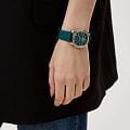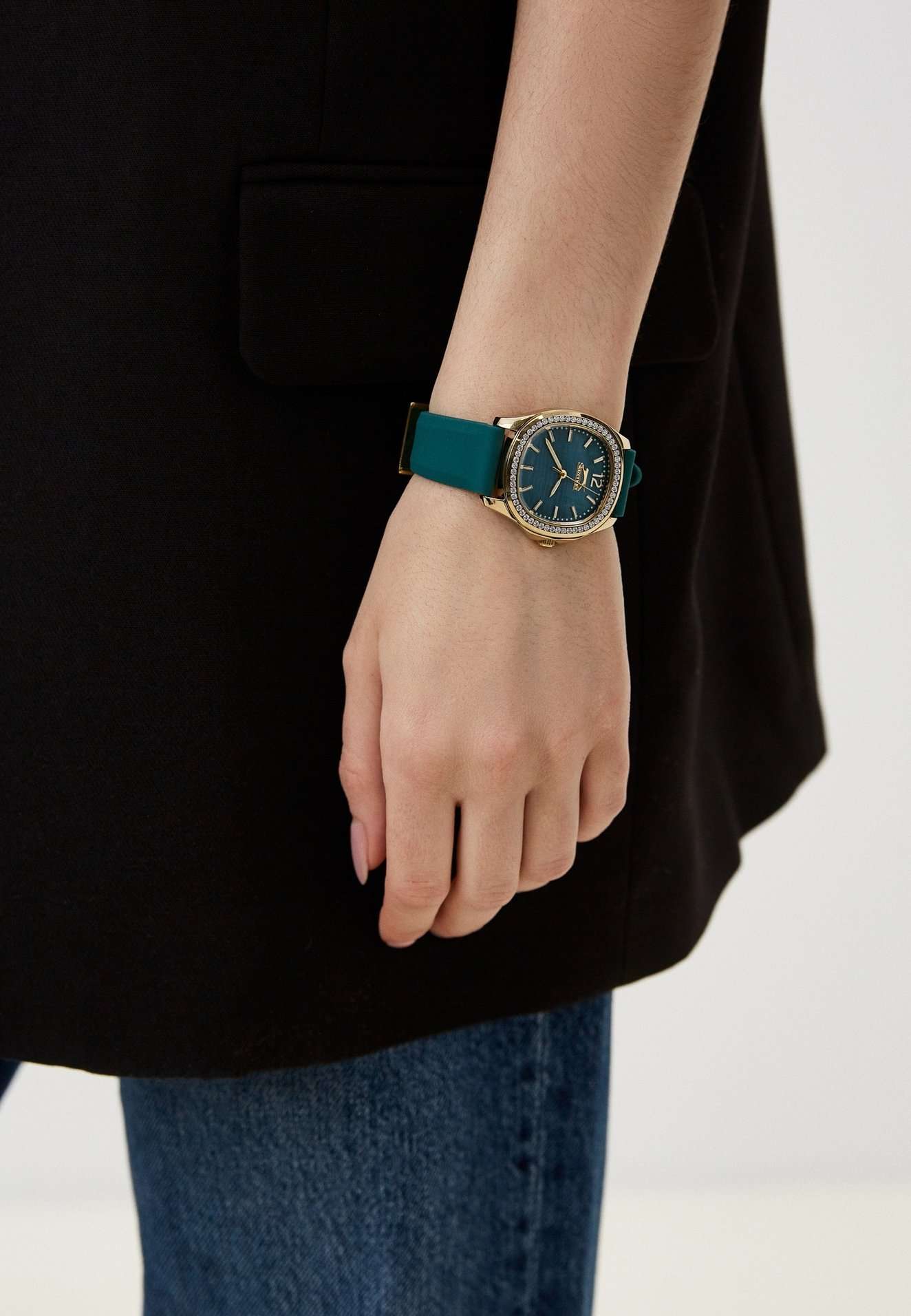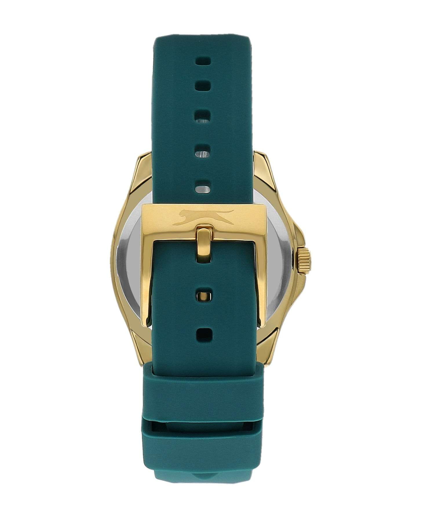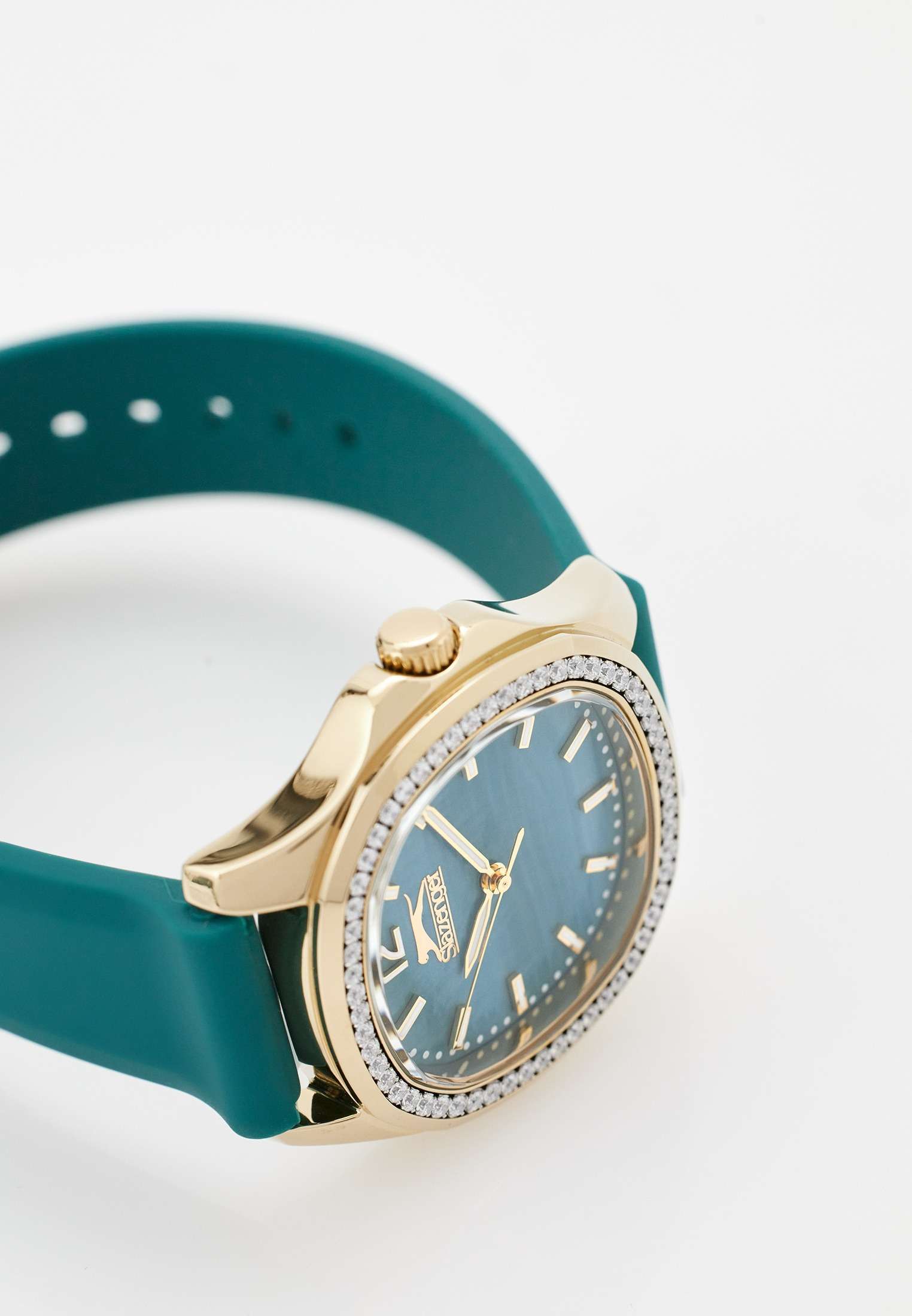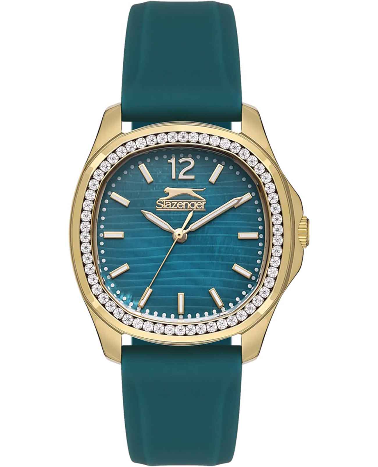 Часы Slazenger SL.09.2239.3.04 – это изысканный аксессуар, который станет стильным акцентом любого образа. Модель оснащена надежным кварцевым механизмом. Корпус из прочного металла с золотистым  IP-покрытиемIP-покрытиеМетод ионного напыления. Демонстрирует повышенную устойчивость к истиранию, окислению и химическим веществам. Под воздействием высокого давления и температуры около 1500°C молекулы металла надёжно соединяются с частицами корпуса часов. размером 34х34 мм украшен россыпью сверкающих фианитов по безелюБезельВнешний ободок, закрепляющий стекло. В спортивных часах так называется поворотное кольцо с делениями на циферблате, выполняет роль таймера – замеряет отрезки времени на шкале. Неподвижный безель – элемент декора. Однонаправленно вращающийся безель на дайверских часах позволяет фиксировать моменты погружения и выныривания на поверхность., что придает часам особое сияние и элегантность. Сине-зеленый циферблат с логотипом бренда защищен стойким к царапинам минеральным стекломМинеральное стеклоМинеральное стекло представляет собой искусственно выращенный минерал кварца. Такое стекло отличается особой устойчивостью к повреждениям и царапинам. Уступает по некоторым качествам сапфировому стеклу.. Четкие часовые метки в виде лаконичных штрихов и крупная арабская цифра 12 обеспечивают удобство чтения времени. Заводная головка с рифлением дополнена защитой для повышения долговечности. Резиновый сине-зеленый ремешок шириной 18 мм надежно фиксируется на запястье с помощью классической застежки. Для удобства использования в темное время суток предусмотрено люминесцентное покрытиеЛюминесцентное покрытиеПозволяет считывать показания времени в темноте. Производители наносят на стрелки, часовые индексы, безель или поверхность циферблата светонакопительный состав, дающий холодное свечение. стрелок. Водозащита 30WR позволяет не беспокоиться о случайных брызгах. Вес изделия составляет 43 грамма, что делает часы комфортными для ежедневного ношения. Эти часы идеально подойдут для тех, кто ценит гармонию стиля, качества и функциональности.
