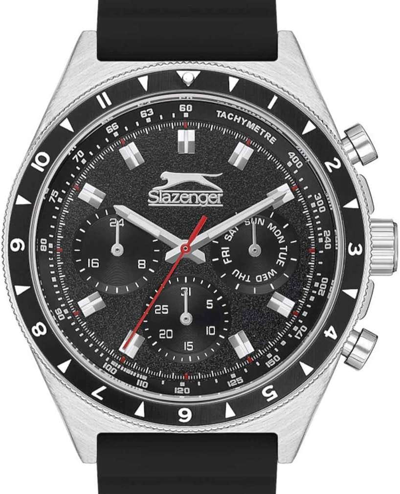 Часы Slazenger SL.09.2247.2.01 — это современная модель с выразительным спортивным характером, идеально подходящая для активного образа жизни. Корпус выполнен из прочного металла, черный циферблат защищён минеральным стекломМинеральное стеклоМинеральное стекло представляет собой искусственно выращенный минерал кварца. Такое стекло отличается особой устойчивостью к повреждениям и царапинам. Уступает по некоторым качествам сапфировому стеклу., устойчивым к царапинам. Часы также оснащены шкалой тахиметраТахиметрРазмеченная шкала, располагается на ободке или безеле часов. Тахиметр позволяет рассчитать скорость на определённом участке пути, расстояние измеряется в километрах или милях., что добавляет им функциональности и может быть полезно для измерения скорости. На безельБезельВнешний ободок, закрепляющий стекло. В спортивных часах так называется поворотное кольцо с делениями на циферблате, выполняет роль таймера – замеряет отрезки времени на шкале. Неподвижный безель – элемент декора. Однонаправленно вращающийся безель на дайверских часах позволяет фиксировать моменты погружения и выныривания на поверхность. нанесено черное IP-покрытиеIP-покрытиеМетод ионного напыления. Демонстрирует повышенную устойчивость к истиранию, окислению и химическим веществам. Под воздействием высокого давления и температуры около 1500°C молекулы металла надёжно соединяются с частицами корпуса часов.. Диаметр корпуса составляет 46 мм, толщина — 11 мм, а ширина ремешка — 22 мм. Лёгкий и комфортный чёрный резиновый ремешок оснащён классической застёжкой, благодаря чему часы удобно сидят на руке и не вызывают дискомфорта даже при длительном ношении. Вес модели составляет всего 79 грамм. Надёжный кварцевый механизм обеспечивает точность времени, а уровень водозащиты WR 50 позволяет использовать часы в повседневных условиях, не опасаясь случайных брызг или дождя. Для удобства использования в темное время суток предусмотрено люминесцентное покрытиеЛюминесцентное покрытиеПозволяет считывать показания времени в темноте. Производители наносят на стрелки, часовые индексы, безель или поверхность циферблата светонакопительный состав, дающий холодное свечение. стрелок и меток. Дополнительные малые циферблаты показывают дату, день недели и текущее время в 24-часовом формате, что делает использование часов ещё более удобным и функциональным.