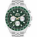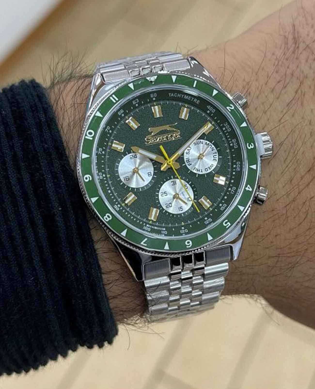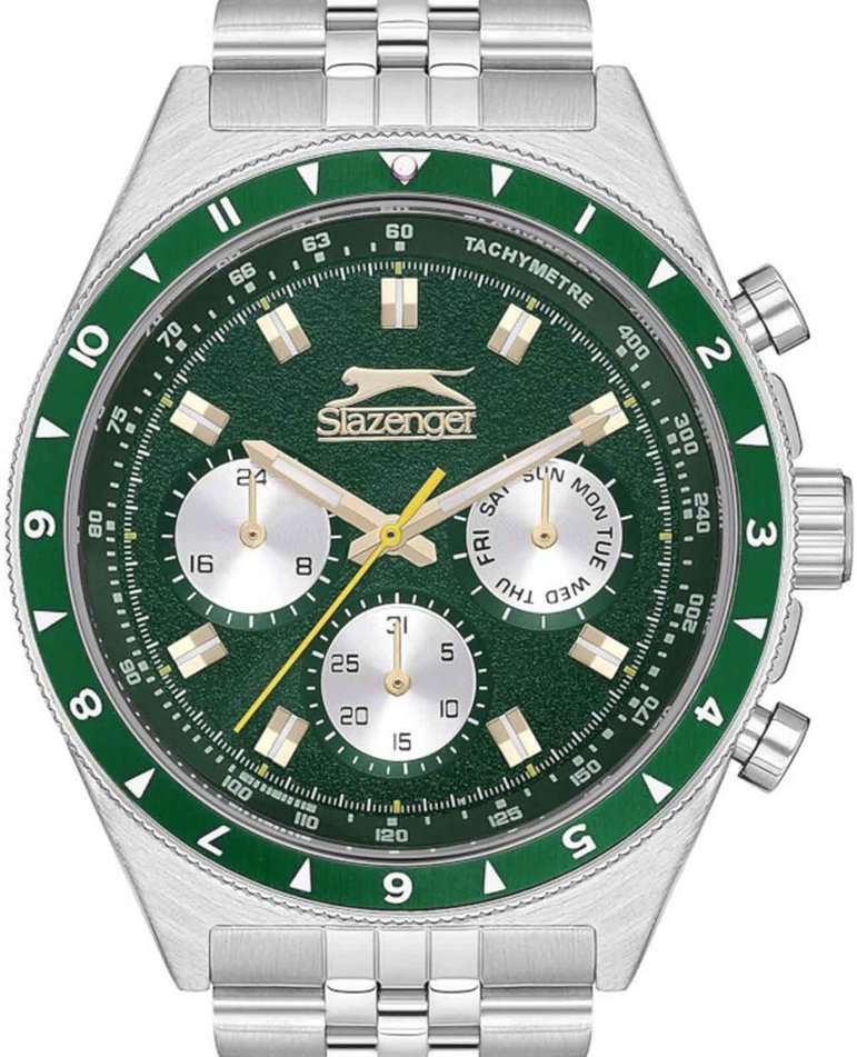 Часы Slazenger SL.09.2248.2.06 — это современная модель с выразительным спортивным характером, идеально подходящая для активного образа жизни. Корпус выполнен из прочного металла, зеленый циферблат защищён минеральным стекломМинеральное стеклоМинеральное стекло представляет собой искусственно выращенный минерал кварца. Такое стекло отличается особой устойчивостью к повреждениям и царапинам. Уступает по некоторым качествам сапфировому стеклу., устойчивым к царапинам. Часы также оснащены шкалой тахиметраТахиметрРазмеченная шкала, располагается на ободке или безеле часов. Тахиметр позволяет рассчитать скорость на определённом участке пути, расстояние измеряется в километрах или милях., что добавляет им функциональности и может быть полезно для измерения скорости. На безельБезельВнешний ободок, закрепляющий стекло. В спортивных часах так называется поворотное кольцо с делениями на циферблате, выполняет роль таймера – замеряет отрезки времени на шкале. Неподвижный безель – элемент декора. Однонаправленно вращающийся безель на дайверских часах позволяет фиксировать моменты погружения и выныривания на поверхность. нанесено зеленое IP-покрытиеIP-покрытиеМетод ионного напыления. Демонстрирует повышенную устойчивость к истиранию, окислению и химическим веществам. Под воздействием высокого давления и температуры около 1500°C молекулы металла надёжно соединяются с частицами корпуса часов.. Диаметр корпуса составляет 46 мм, толщина — 11 мм, а ширина браслета — 22 мм. Часы оснащены металлическим браслетом с надежной раскладной застёжкойРаскладная застёжкаТакой тип застёжки используется только на браслетах из металла. Она никогда не раскрывается полностью, происходит разделение на 2 и более частей. Раскладывающая застёжка снизит вероятность потери часов к минимуму., благодаря чему часы удобно сидят на руке и не вызывают дискомфорта даже при длительном ношении. Вес модели составляет 130 грамм. Надёжный кварцевый механизм обеспечивает точность времени, а уровень водозащиты WR 50 позволяет использовать часы в повседневных условиях, не опасаясь случайных брызг или дождя. Для удобства использования в темное время суток предусмотрено люминесцентное покрытиеЛюминесцентное покрытиеПозволяет считывать показания времени в темноте. Производители наносят на стрелки, часовые индексы, безель или поверхность циферблата светонакопительный состав, дающий холодное свечение. стрелок и меток. Дополнительные малые циферблаты показывают дату, день недели и текущее время в 24-часовом формате, что делает использование часов ещё более удобным и функциональным.