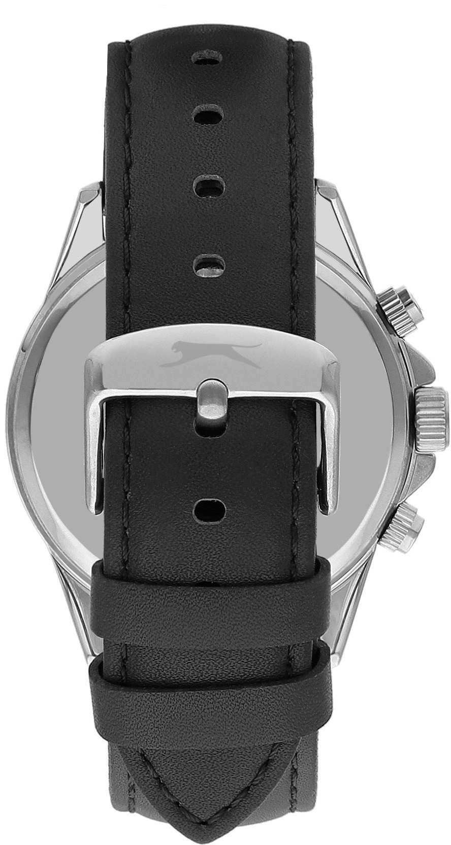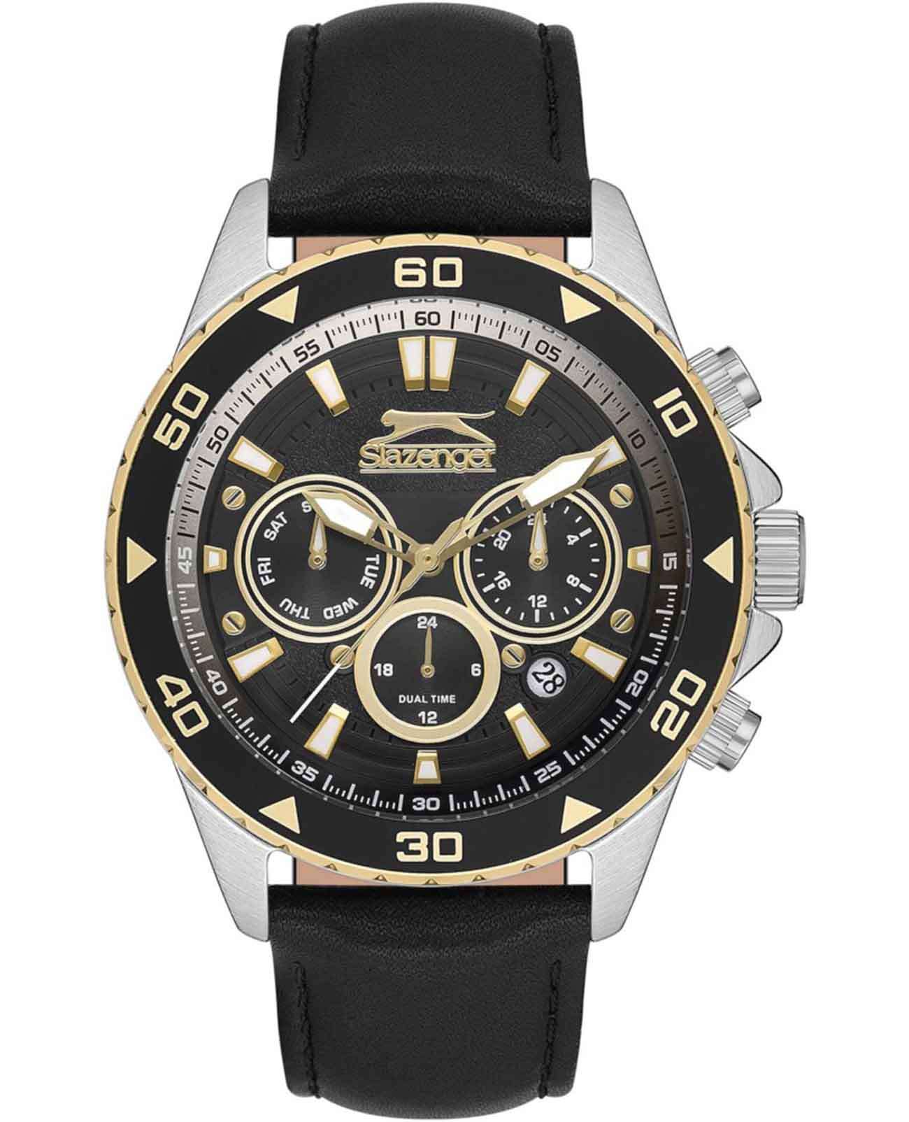 Часы Slazenger SL.09.2251.2.05 — это стильная и практичная модель, выполненная в элегантном серебристом цвете. Корпус изготовлен из металла, что обеспечивает прочность и долговечность. На золотистый безельБезельВнешний ободок, закрепляющий стекло. В спортивных часах так называется поворотное кольцо с делениями на циферблате, выполняет роль таймера – замеряет отрезки времени на шкале. Неподвижный безель – элемент декора. Однонаправленно вращающийся безель на дайверских часах позволяет фиксировать моменты погружения и выныривания на поверхность. нанесено черное IP-покрытиеIP-покрытиеМетод ионного напыления. Демонстрирует повышенную устойчивость к истиранию, окислению и химическим веществам. Под воздействием высокого давления и температуры около 1500°C молекулы металла надёжно соединяются с частицами корпуса часов.. Минеральное стеклоМинеральное стеклоМинеральное стекло представляет собой искусственно выращенный минерал кварца. Такое стекло отличается особой устойчивостью к повреждениям и царапинам. Уступает по некоторым качествам сапфировому стеклу. надежно защищает черный циферблат от царапин и повреждений. Классический кожаный ремешок черного цвета шириной 22 мм удобно фиксируется на запястье с помощью классической застежки. Диаметр корпуса составляет 44 мм, а толщина — 12 мм, благодаря чему часы смотрятся солидно и современно. Модель оснащена кварцевым механизмом, отличающимся точностью и надежностью. На циферблате представлены дополнительные малые циферблаты для отображения второго часового поясаВторой часовой поясФункция, позволяющая отображать время двух часовых поясов одновременно., дня недели и времени в 24-часовом формате, а также имеется отдельное окошко даты. Для удобства использования в темное время суток предусмотрено люминесцентное покрытиеЛюминесцентное покрытиеПозволяет считывать показания времени в темноте. Производители наносят на стрелки, часовые индексы, безель или поверхность циферблата светонакопительный состав, дающий холодное свечение. стрелок и меток. Заводная головка оснащена защитой. Водозащита уровня WR 50 позволяет не снимать часы при мытье рук или попадании под дождь. Вес модели составляет 70 грамм.