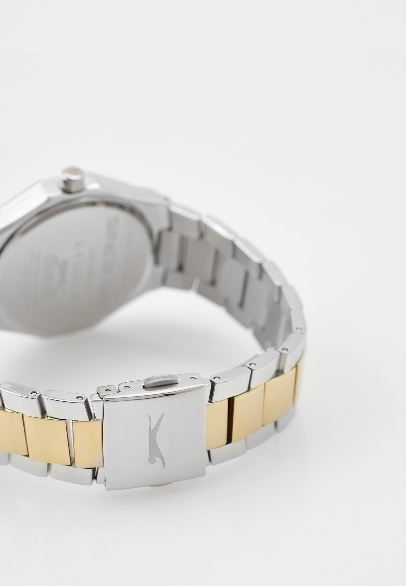 Часы Slazenger SL.09.2258.3.03 — это изысканный аксессуар, который гармонично подчеркнёт ваш индивидуальный стиль. Корпус и браслет выполнены из инновационного суперметалла — сплава на основе меди с пониженным содержанием цинка и никеля, обладающего специальным защитным покрытием, а циферблат украшен 4 кристаллами. Надёжный кварцевый механизм обеспечивает точный ход, а прочное минеральное стеклоМинеральное стеклоМинеральное стекло представляет собой искусственно выращенный минерал кварца. Такое стекло отличается особой устойчивостью к повреждениям и царапинам. Уступает по некоторым качествам сапфировому стеклу. устойчиво к царапинам и защищает перламутровый циферблат от внешних воздействий. Диаметр корпуса составляет 38 мм, толщина — всего 8 мм, что делает модель элегантной и удобной для ежедневного ношения. Водонепроницаемость до 3 бар позволяет не беспокоиться о случайных брызгах или каплях дождя. Стрелки с люминесцентным покрытиемЛюминесцентное покрытиеПозволяет считывать показания времени в темноте. Производители наносят на стрелки, часовые индексы, безель или поверхность циферблата светонакопительный состав, дающий холодное свечение. удобно подсвечиваются в темноте после зарядки на свету. Стальной браслет с частичным золотистым IP-покрытиемIP-покрытиеМетод ионного напыления. Демонстрирует повышенную устойчивость к истиранию, окислению и химическим веществам. Под воздействием высокого давления и температуры около 1500°C молекулы металла надёжно соединяются с частицами корпуса часов. и раскладной застёжкойРаскладная застёжкаТакой тип застёжки используется только на браслетах из металла. Она никогда не раскрывается полностью, происходит разделение на 2 и более частей. Раскладывающая застёжка снизит вероятность потери часов к минимуму. обеспечивает комфортную посадку. Часы станут отличным выбором как для повседневной жизни, так и для особых случаев, а также послужат прекрасным подарком на любой праздник.