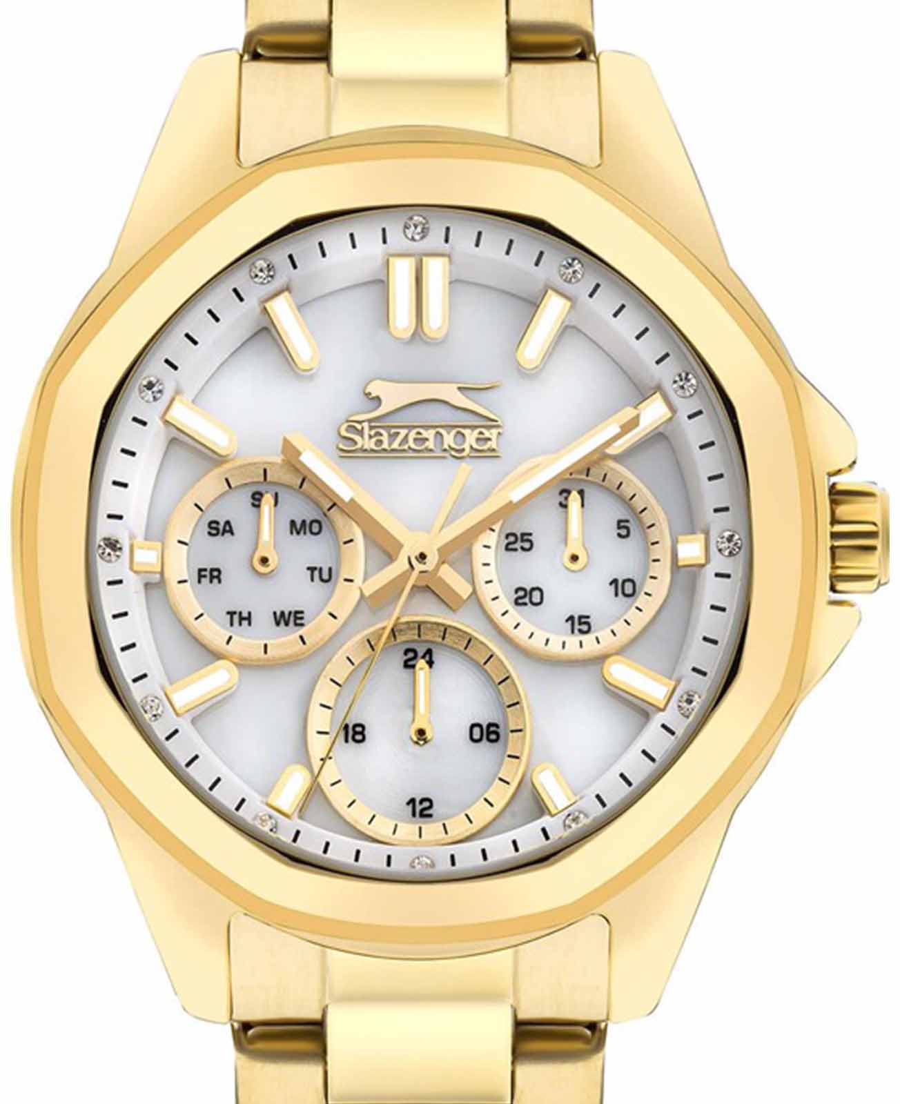 Часы Slazenger SL.09.2290.4.08 — это сочетание современного дизайна и функциональности, идеально подходящее для тех, кто ценит стиль и элегантность. Корпус и браслет выполнены из прочного суперметалла с золотистым IP-покрытиемIP-покрытиеМетод ионного напыления. Демонстрирует повышенную устойчивость к истиранию, окислению и химическим веществам. Под воздействием высокого давления и температуры около 1500°C молекулы металла надёжно соединяются с частицами корпуса часов., что придаёт модели солидный и эффектный вид. Белый циферблат с лаконичными отметками, кристаллами и фирменным логотипом защищён устойчивым к царапинам минеральным стекломМинеральное стеклоМинеральное стекло представляет собой искусственно выращенный минерал кварца. Такое стекло отличается особой устойчивостью к повреждениям и царапинам. Уступает по некоторым качествам сапфировому стеклу.. Дополнительные функции включают отображение даты и дня недели, а также 12- и 24-часовой формат времени на отдельных мини-циферблатах, что делает использование часов максимально удобным. Заводная головка оснащена защитой, а надёжная раскладная застёжкаРаскладная застёжкаТакой тип застёжки используется только на браслетах из металла. Она никогда не раскрывается полностью, происходит разделение на 2 и более частей. Раскладывающая застёжка снизит вероятность потери часов к минимуму. обеспечивает комфортную посадку на запястье. Особое внимание привлекает восьмигранный безельБезельВнешний ободок, закрепляющий стекло. В спортивных часах так называется поворотное кольцо с делениями на циферблате, выполняет роль таймера – замеряет отрезки времени на шкале. Неподвижный безель – элемент декора. Однонаправленно вращающийся безель на дайверских часах позволяет фиксировать моменты погружения и выныривания на поверхность.. Циферблат оснащён люминесцентным покрытиемЛюминесцентное покрытиеПозволяет считывать показания времени в темноте. Производители наносят на стрелки, часовые индексы, безель или поверхность циферблата светонакопительный состав, дающий холодное свечение. стрелок и меток, что позволяет легко определять время даже в условиях плохой освещенности. Водозащита 30WR позволяет не беспокоиться о случайных брызгах и дождевых каплях. Диаметр корпуса составляет 36 мм, толщина — 12 мм, вес — 97 г, благодаря чему часы выглядят внушительно и подчёркивают индивидуальный стиль владельца. Эта модель станет отличным акцентом в вашем образе и подчеркнёт вашу уверенность в любой ситуации.