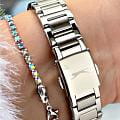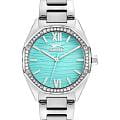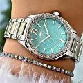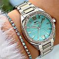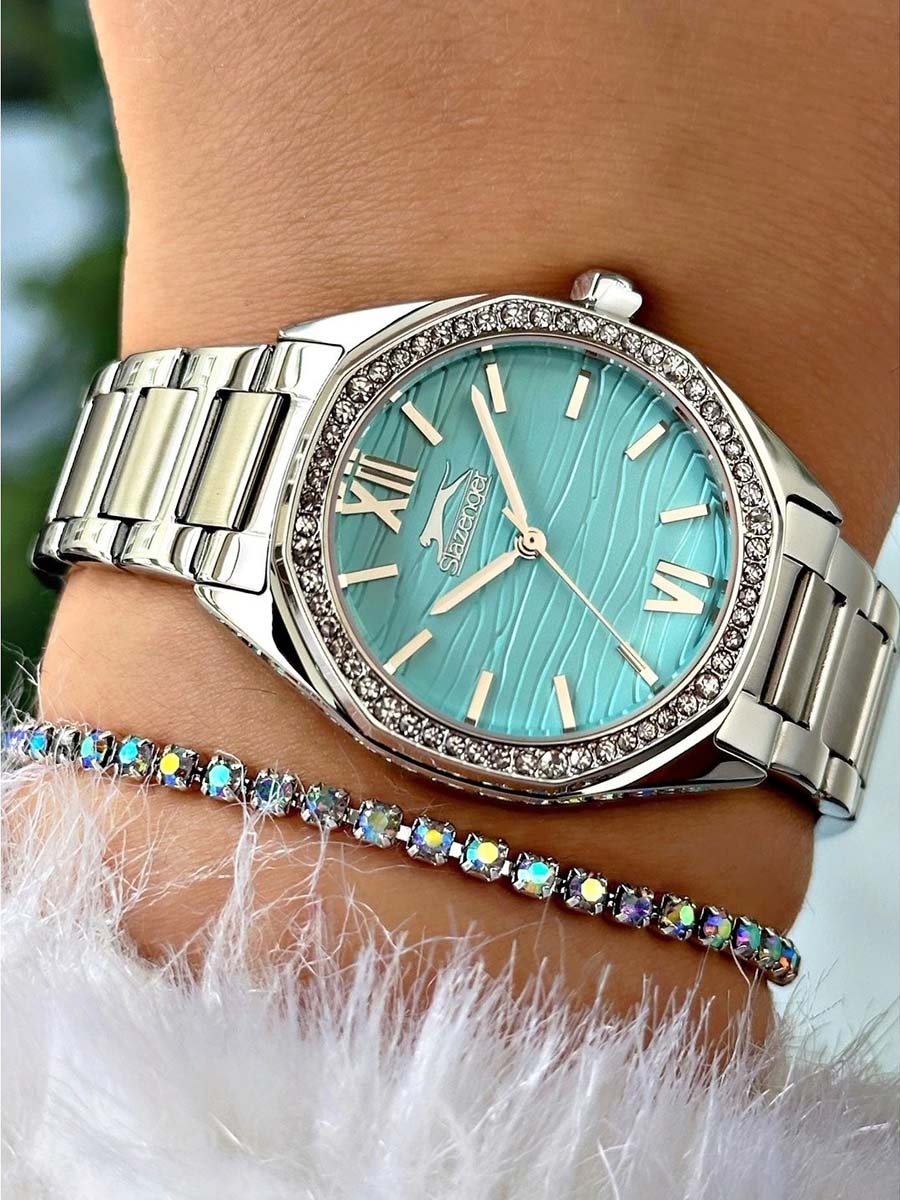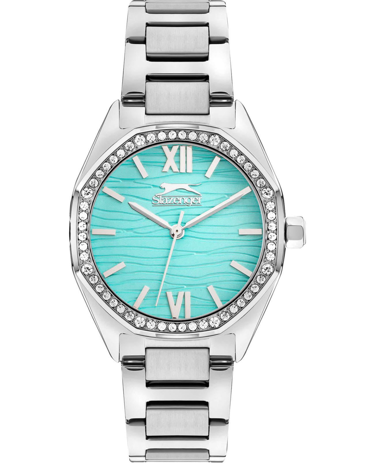 Женские кварцевые часы Slazenger SL.09.2301.3.01 — это элегантный и изысканный аксессуар, подчеркивающий стиль и утончённость. Корпус и браслет выполнены из суперметалла, защищён минеральным стекломМинеральное стеклоМинеральное стекло представляет собой искусственно выращенный минерал кварца. Такое стекло отличается особой устойчивостью к повреждениям и царапинам. Уступает по некоторым качествам сапфировому стеклу.. Циферблат мятного цвета с волнистым рельефным рисунком оформлен штриховыми метками и римскими цифрами VI и XII, дополнен логотипом бренда. Безель гранёный, украшен паве из фианитов, придающих модели изысканное сияние. Заводная головка — граненая, добавляющая детали дизайна. Браслет из суперметалла фиксируется на раскладной застёжкеРаскладная застёжкаТакой тип застёжки используется только на браслетах из металла. Она никогда не раскрывается полностью, происходит разделение на 2 и более частей. Раскладывающая застёжка снизит вероятность потери часов к минимуму., обеспечивая надёжность и комфорт ношения. Водонепроницаемость 30 м позволяет использовать часы в повседневных условиях, защищая от случайных брызг и капель дождя. Модель идеально подходит как для повседневного, так и для торжественного образа.