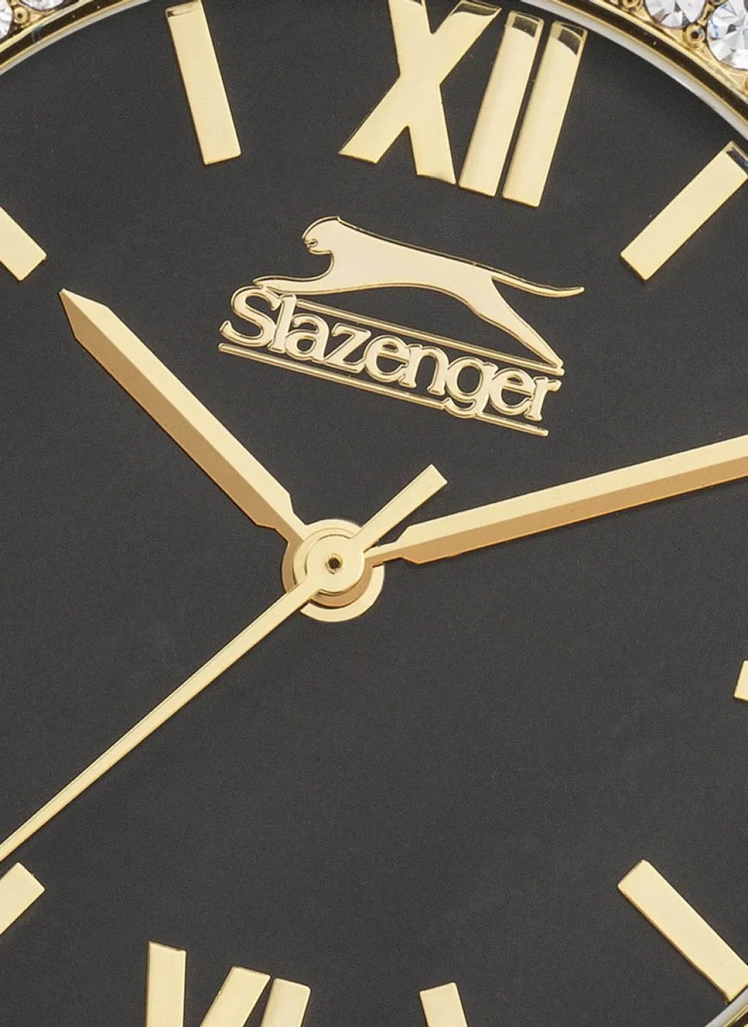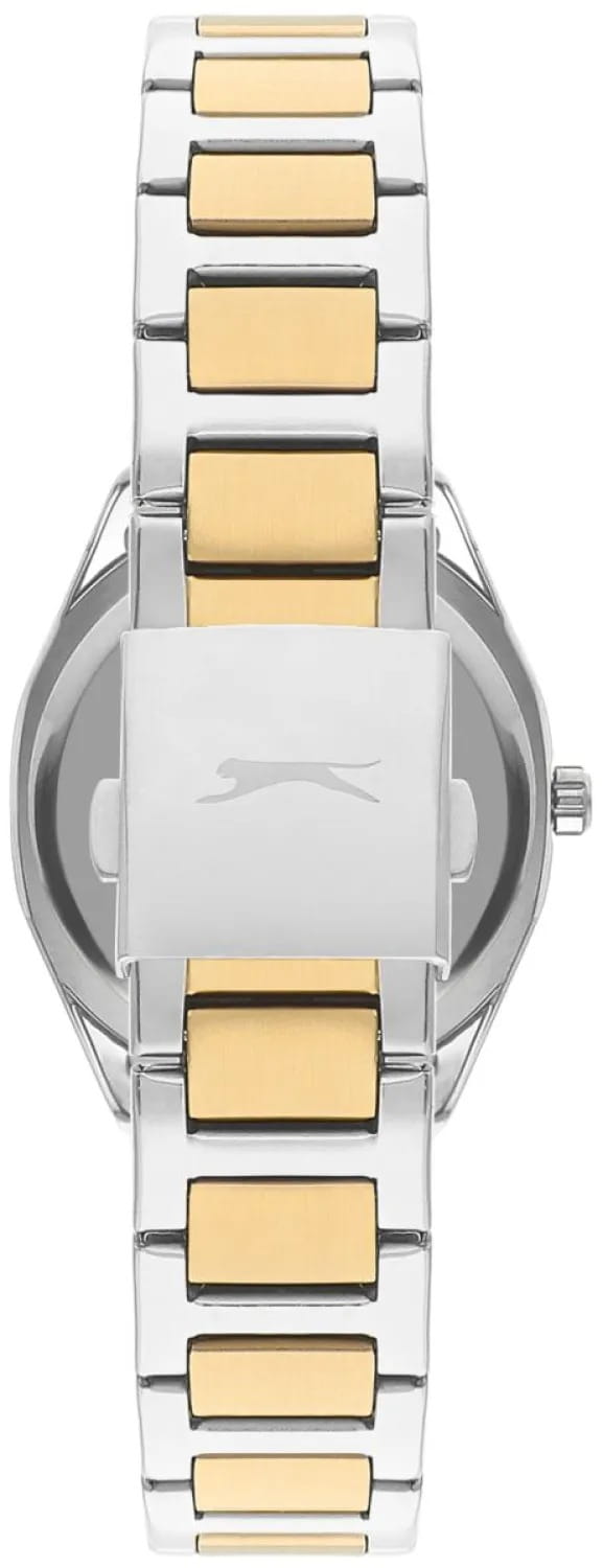 Женские кварцевые часы Slazenger SL.09.2301.3.06 — это элегантный и изысканный аксессуар, подчеркивающий стиль и утончённость. Безель и браслет выполнены из суперметалла с IP-покрытиемIP-покрытиеМетод ионного напыления. Демонстрирует повышенную устойчивость к истиранию, окислению и химическим веществам. Под воздействием высокого давления и температуры около 1500°C молекулы металла надёжно соединяются с частицами корпуса часов., защищён минеральным стекломМинеральное стеклоМинеральное стекло представляет собой искусственно выращенный минерал кварца. Такое стекло отличается особой устойчивостью к повреждениям и царапинам. Уступает по некоторым качествам сапфировому стеклу.. Циферблат чёрного цвета с волнистым рельефным рисунком оформлен штриховыми метками и римскими цифрами VI и XII, дополнен логотипом бренда. Безель гранёный, украшен паве из фианитов, придающих модели изысканное сияние. Заводная головка — граненая, добавляющая детали дизайна. Браслет из суперметалла фиксируется на раскладной застёжкеРаскладная застёжкаТакой тип застёжки используется только на браслетах из металла. Она никогда не раскрывается полностью, происходит разделение на 2 и более частей. Раскладывающая застёжка снизит вероятность потери часов к минимуму., обеспечивая надёжность и комфорт ношения. Водонепроницаемость 30 м позволяет использовать часы в повседневных условиях, защищая от случайных брызг и капель дождя. Модель идеально подходит как для повседневного, так и для торжественного образа.