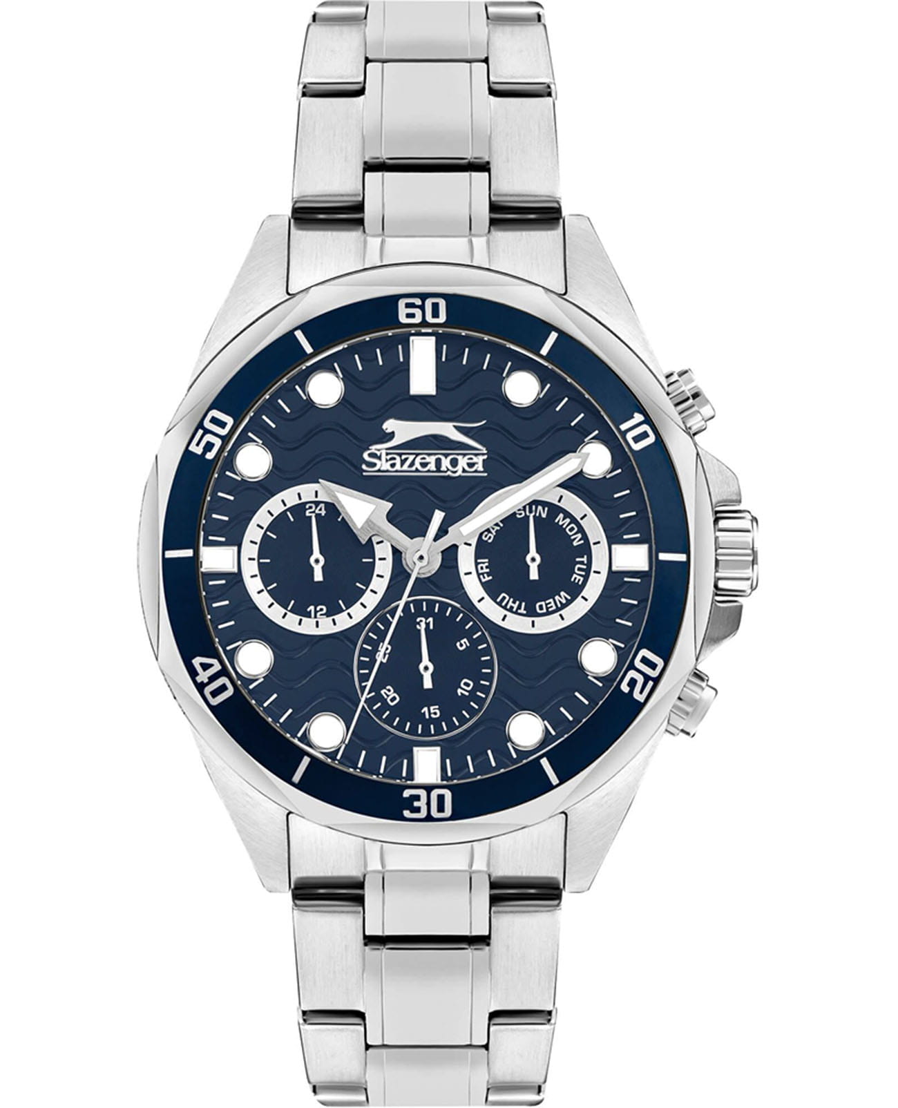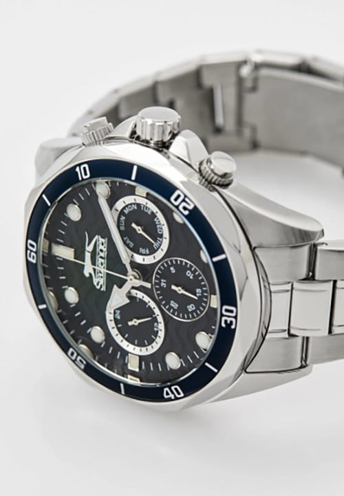 Мужские кварцевые часы Slazenger SL.09.2309.2.03 — это выразительный и функциональный аксессуар, сочетающий прочность, стиль и насыщенную комплектацию. Корпус и браслет выполнены из суперметалла, защищён минеральным стекломМинеральное стеклоМинеральное стекло представляет собой искусственно выращенный минерал кварца. Такое стекло отличается особой устойчивостью к повреждениям и царапинам. Уступает по некоторым качествам сапфировому стеклу.. Циферблат синего цвета оформлен с вынесенными малыми циферблатами для индикации дня недели, даты и времени в 24-часовом формате. Стрелки и метки оснащены люминесцентным покрытиемЛюминесцентное покрытиеПозволяет считывать показания времени в темноте. Производители наносят на стрелки, часовые индексы, безель или поверхность циферблата светонакопительный состав, дающий холодное свечение., обеспечивающим хорошую читаемость в темноте. Заводная головка снабжена защитой, а задняя крышка — завинчивающаяся, что повышает надёжность конструкции. Браслет фиксируется на раскладной застёжкеРаскладная застёжкаТакой тип застёжки используется только на браслетах из металла. Она никогда не раскрывается полностью, происходит разделение на 2 и более частей. Раскладывающая застёжка снизит вероятность потери часов к минимуму., обеспечивая удобство и безопасность ношения. Водонепроницаемость 50 м позволяет использовать часы в повседневных условиях, защищая от случайных брызг и капель дождя. Модель подчёркивает индивидуальность владельца и идеально подходит как для повседневного, так и для делового образа.