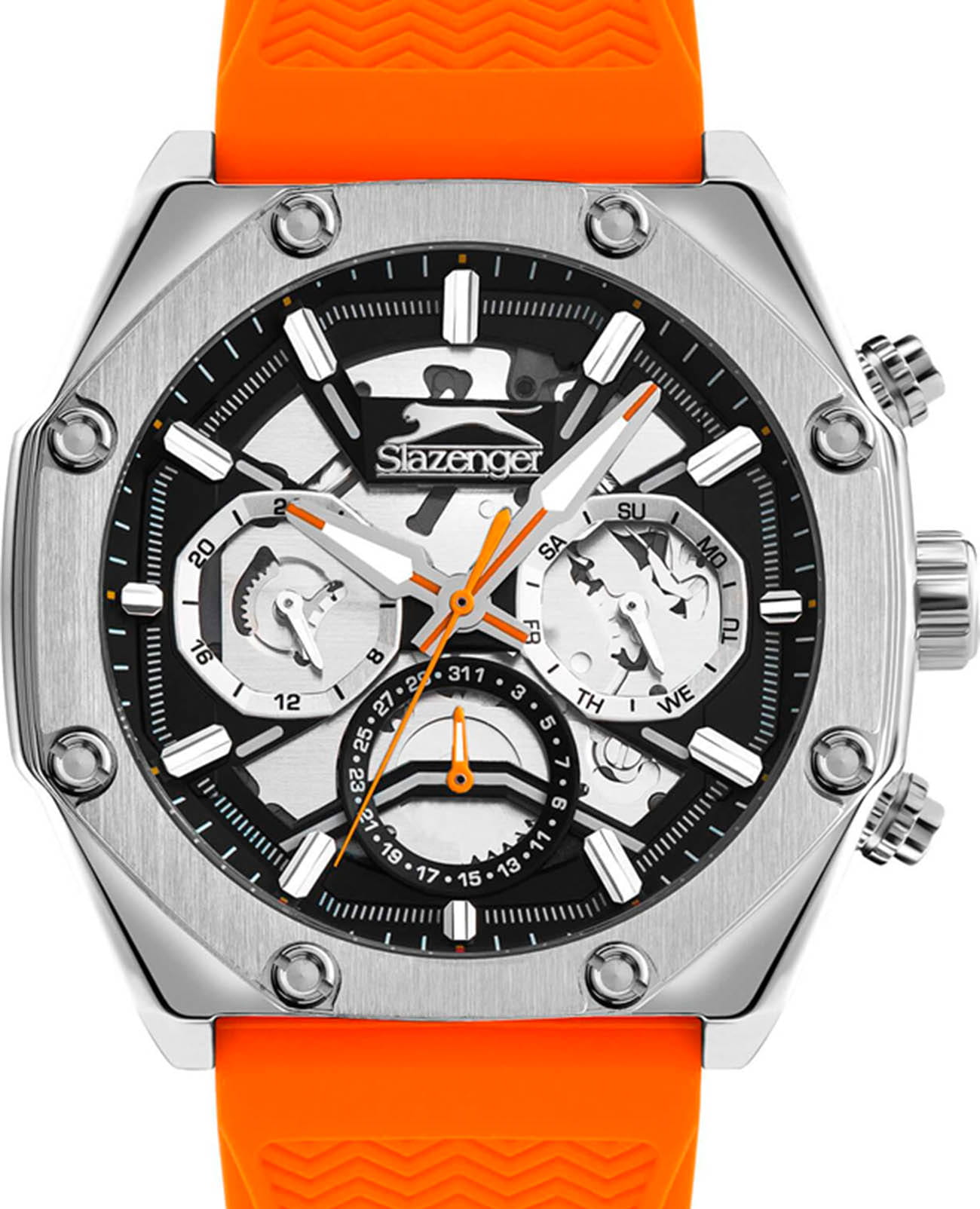 Мужские кварцевые часы Slazenger SL.09.2319.2.07 — это выразительный и функциональный аксессуар, сочетающий стиль, технологичность и насыщенную комплектацию. Корпус выполнен из суперметалла, а циферблат частично скелетонизирован и выполнен в серебристо-чёрных тонах, что позволяет наблюдать за работой механизма. Циферблат защищён минеральным стекломМинеральное стеклоМинеральное стекло представляет собой искусственно выращенный минерал кварца. Такое стекло отличается особой устойчивостью к повреждениям и царапинам. Уступает по некоторым качествам сапфировому стеклу. и дополнен вынесенными малыми циферблатами для индикации дня недели, даты и времени в 24-часовом формате. Стрелки и метки оснащены люминесцентным покрытиемЛюминесцентное покрытиеПозволяет считывать показания времени в темноте. Производители наносят на стрелки, часовые индексы, безель или поверхность циферблата светонакопительный состав, дающий холодное свечение., обеспечивающим хорошую читаемость в темноте. Удобный силиконовый ремешок оранжевого цвета фиксируется на классической пряжке. Водонепроницаемость 50 м позволяет использовать часы в повседневных условиях, защищая от случайных брызг и капель дождя. Модель подчёркивает индивидуальность владельца и идеально подходит как для повседневного, так и для спортивного образа.