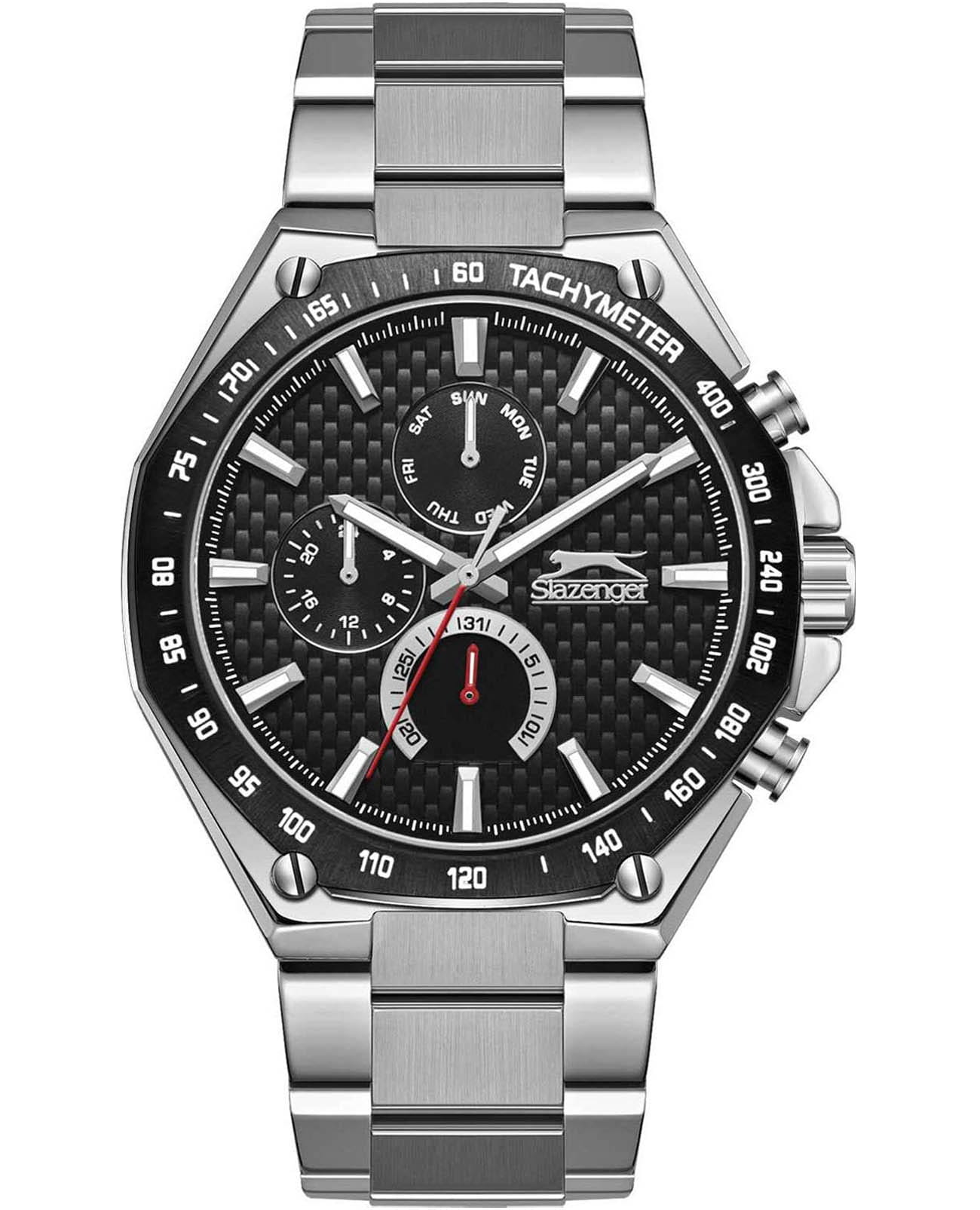 Мужские кварцевые часы Slazenger SL.09.2325.2.01 — это выразительный и функциональный аксессуар, сочетающий стиль, прочность и насыщенную комплектацию. Корпус и браслет выполнены из суперметалла, а циферблат оформлен в черных тонах. Циферблат защищён минеральным стекломМинеральное стеклоМинеральное стекло представляет собой искусственно выращенный минерал кварца. Такое стекло отличается особой устойчивостью к повреждениям и царапинам. Уступает по некоторым качествам сапфировому стеклу. и дополнен вынесенными малыми циферблатами для индикации дня недели, даты и времени в 24-часовом формате. БезельБезельВнешний ободок, закрепляющий стекло. В спортивных часах так называется поворотное кольцо с делениями на циферблате, выполняет роль таймера – замеряет отрезки времени на шкале. Неподвижный безель – элемент декора. Однонаправленно вращающийся безель на дайверских часах позволяет фиксировать моменты погружения и выныривания на поверхность. с IP-покрытиемIP-покрытиеМетод ионного напыления. Демонстрирует повышенную устойчивость к истиранию, окислению и химическим веществам. Под воздействием высокого давления и температуры около 1500°C молекулы металла надёжно соединяются с частицами корпуса часов. дополнен тахиметромТахиметрРазмеченная шкала, располагается на ободке или безеле часов. Тахиметр позволяет рассчитать скорость на определённом участке пути, расстояние измеряется в километрах или милях.. Стрелки и метки оснащены люминесцентным покрытиемЛюминесцентное покрытиеПозволяет считывать показания времени в темноте. Производители наносят на стрелки, часовые индексы, безель или поверхность циферблата светонакопительный состав, дающий холодное свечение., обеспечивающим хорошую читаемость в темноте. Браслет из суперметалла фиксируется на раскладной застёжкеРаскладная застёжкаТакой тип застёжки используется только на браслетах из металла. Она никогда не раскрывается полностью, происходит разделение на 2 и более частей. Раскладывающая застёжка снизит вероятность потери часов к минимуму., обеспечивая удобство и безопасность ношения. Водонепроницаемость 50 м позволяет использовать часы в повседневных условиях, защищая от случайных брызг и капель дождя. Модель подчёркивает индивидуальность владельца и идеально подходит как для повседневного, так и для делового образа.