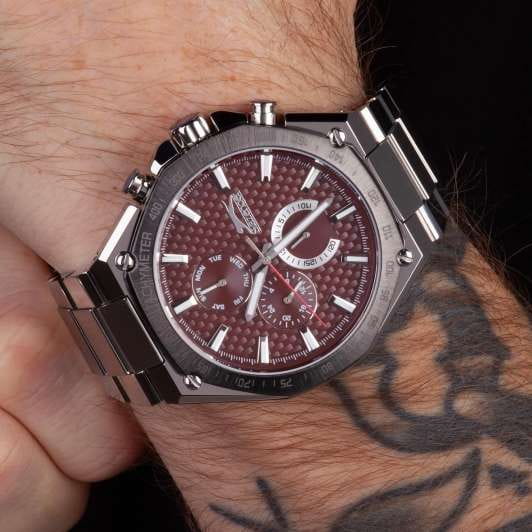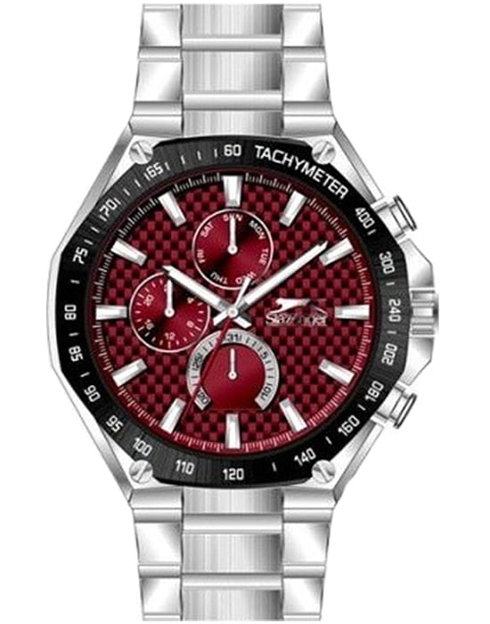 Мужские кварцевые часы Slazenger SL.09.2325.2.05 — это выразительный и функциональный аксессуар, сочетающий стиль, прочность и насыщенную комплектацию. Корпус и браслет выполнены из суперметалла, а циферблат оформлен в бордовых тонах. Циферблат защищён минеральным стекломМинеральное стеклоМинеральное стекло представляет собой искусственно выращенный минерал кварца. Такое стекло отличается особой устойчивостью к повреждениям и царапинам. Уступает по некоторым качествам сапфировому стеклу. и дополнен вынесенными малыми циферблатами для индикации дня недели, даты и времени в 24-часовом формате. БезельБезельВнешний ободок, закрепляющий стекло. В спортивных часах так называется поворотное кольцо с делениями на циферблате, выполняет роль таймера – замеряет отрезки времени на шкале. Неподвижный безель – элемент декора. Однонаправленно вращающийся безель на дайверских часах позволяет фиксировать моменты погружения и выныривания на поверхность. с IP-покрытиемIP-покрытиеМетод ионного напыления. Демонстрирует повышенную устойчивость к истиранию, окислению и химическим веществам. Под воздействием высокого давления и температуры около 1500°C молекулы металла надёжно соединяются с частицами корпуса часов. дополнен тахиметромТахиметрРазмеченная шкала, располагается на ободке или безеле часов. Тахиметр позволяет рассчитать скорость на определённом участке пути, расстояние измеряется в километрах или милях.. Стрелки и метки оснащены люминесцентным покрытиемЛюминесцентное покрытиеПозволяет считывать показания времени в темноте. Производители наносят на стрелки, часовые индексы, безель или поверхность циферблата светонакопительный состав, дающий холодное свечение., обеспечивающим хорошую читаемость в темноте. Браслет из суперметалла фиксируется на раскладной застёжкеРаскладная застёжкаТакой тип застёжки используется только на браслетах из металла. Она никогда не раскрывается полностью, происходит разделение на 2 и более частей. Раскладывающая застёжка снизит вероятность потери часов к минимуму., обеспечивая удобство и безопасность ношения. Водонепроницаемость 50 м позволяет использовать часы в повседневных условиях, защищая от случайных брызг и капель дождя. Модель подчёркивает индивидуальность владельца и идеально подходит как для повседневного, так и для делового образа.