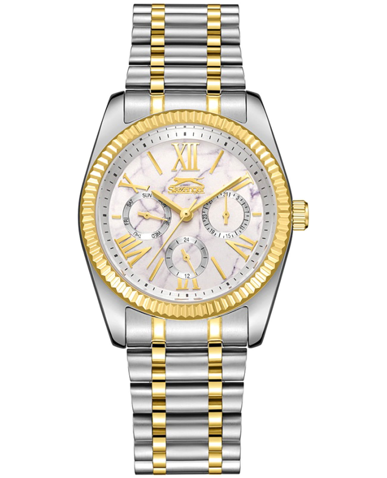 Женские кварцевые часы Slazenger SL.09.2343.4.03 – это сочетание элегантности, современного стиля и надёжности. Изящный корпус из суперметалла серебристого цвета, диаметром 36 мм и толщиной 10.5 мм, подчёркивает утончённость модели и делает их идеальным аксессуаром для любой ситуации – будь то деловая встреча, романтический вечер или повседневные выходы. Циферблат надёжно защищён минеральным стекломМинеральное стеклоМинеральное стекло представляет собой искусственно выращенный минерал кварца. Такое стекло отличается особой устойчивостью к повреждениям и царапинам. Уступает по некоторым качествам сапфировому стеклу., которое устойчиво к механическим повреждениям и сохраняет кристальную прозрачность. Рифленый неподвижный безельБезельВнешний ободок, закрепляющий стекло. В спортивных часах так называется поворотное кольцо с делениями на циферблате, выполняет роль таймера – замеряет отрезки времени на шкале. Неподвижный безель – элемент декора. Однонаправленно вращающийся безель на дайверских часах позволяет фиксировать моменты погружения и выныривания на поверхность. с IP-покрытиемIP-покрытиеМетод ионного напыления. Демонстрирует повышенную устойчивость к истиранию, окислению и химическим веществам. Под воздействием высокого давления и температуры около 1500°C молекулы металла надёжно соединяются с частицами корпуса часов. золотистого цвета. Браслет из суперметалла с частичным IP-покрытиемIP-покрытиеМетод ионного напыления. Демонстрирует повышенную устойчивость к истиранию, окислению и химическим веществам. Под воздействием высокого давления и температуры около 1500°C молекулы металла надёжно соединяются с частицами корпуса часов. удобно облегает запястье и фиксируется с помощью раскладной застёжкиРаскладная застёжкаТакой тип застёжки используется только на браслетах из металла. Она никогда не раскрывается полностью, происходит разделение на 2 и более частей. Раскладывающая застёжка снизит вероятность потери часов к минимуму., обеспечивая надёжность и комфорт в повседневном ношении. Утончённый стиль, внимание к деталям и практичность делают эту модель идеальным выбором для современных женщин, ценящих эстетику и функциональность. Вынесенный циферблат с 24-х часовым указателем времени. Водозащита до 30 метров позволит защитить корпус от случайных брызг или капель дождя.