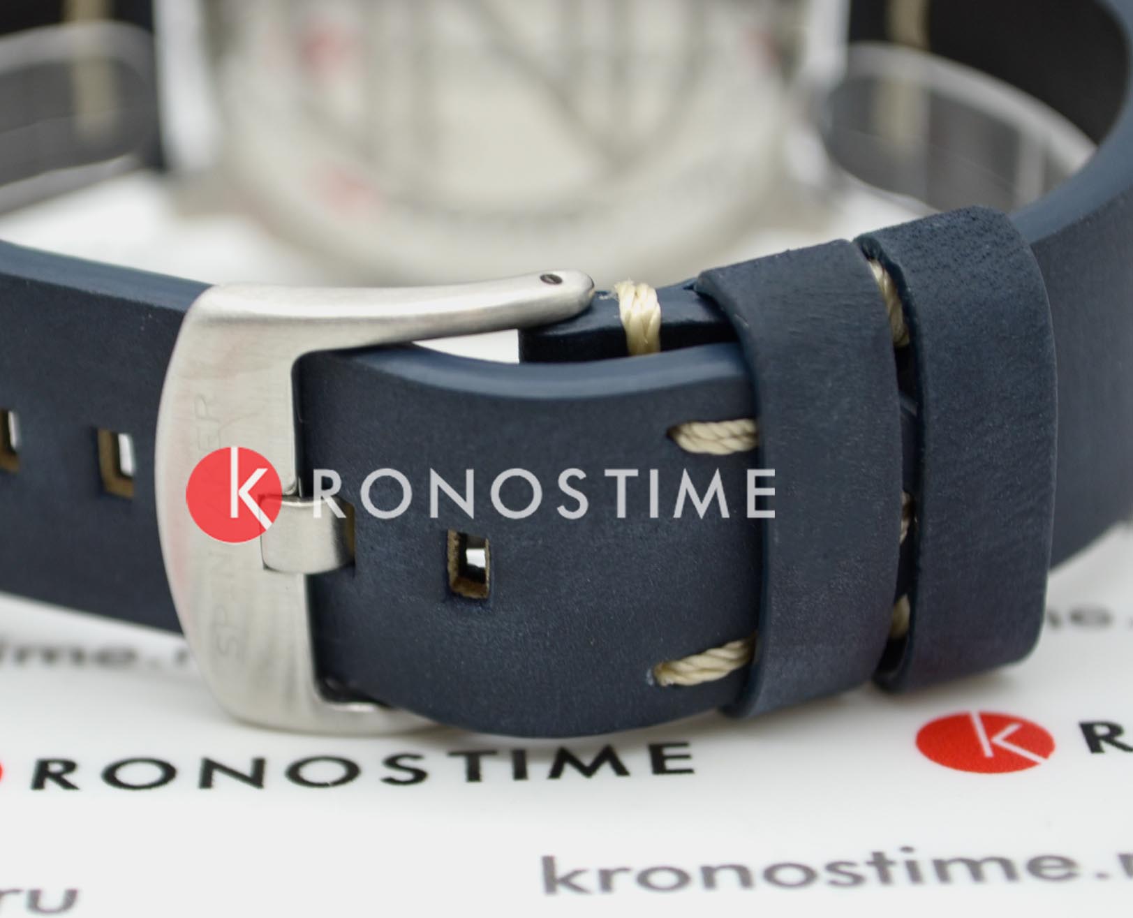 Мужской кварцевый хронографХронографФункция позволяет измерять отрезки времени с особой точностью: часы, минуты, секунды. Верным признаком хронографа является наличие на циферблате 3 дополнительных окошек-счётчиков. с секундомеромСекундомерСекундоме́р — прибор, способный измерять интервалы времени с точностью до долей секунды. и тахиметромТахиметрРазмеченная шкала, располагается на ободке или безеле часов. Тахиметр позволяет рассчитать скорость на определённом участке пути, расстояние измеряется в километрах или милях. Spinnaker Hull SP-5068-03. Калибр механизма TMI VK73. Центральные часовая и минутная стрелки, секундная стрелка вынесена на малый циферблат. Большая дата в позиции 12 часов. 12/24х часовой формат времени. Корпус выполнен из нержавеющей стали. Кожаный ремешок шириной 22 мм, стандартная застежка. Циферблат с люминесцентным покрытиемЛюминесцентное покрытиеПозволяет считывать показания времени в темноте. Производители наносят на стрелки, часовые индексы, безель или поверхность циферблата светонакопительный состав, дающий холодное свечение. стрелок и меток, дополнен выпуклым минеральным стекломМинеральное стеклоМинеральное стекло представляет собой искусственно выращенный минерал кварца. Такое стекло отличается особой устойчивостью к повреждениям и царапинам. Уступает по некоторым качествам сапфировому стеклу. , устойчивым к мелким механическим повреждениям. Водостойкость WR 100 (плавание без погружения).