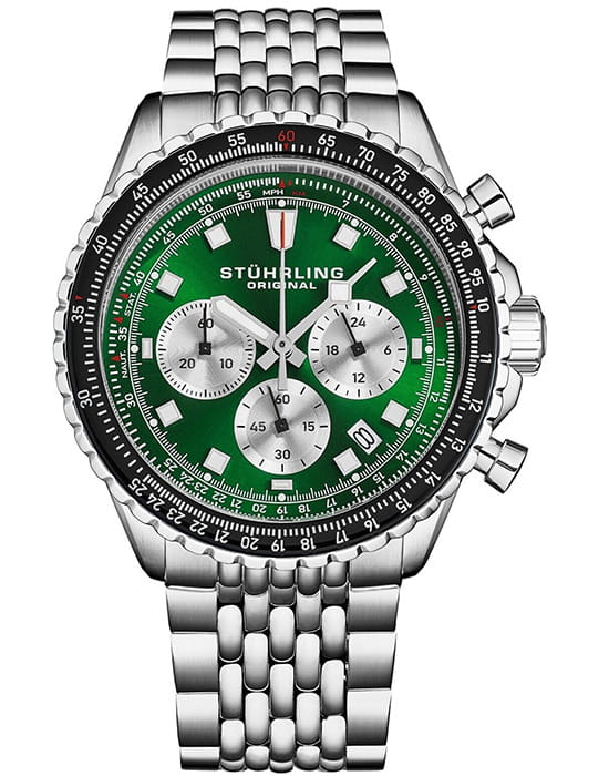 Stuhrling 1010.05 — мощные мужские часы с выразительным спортивным характером и динамичным дизайном. Корпус из нержавеющей стали гармонично сочетается с циферблатом, оформленным рельефным узором и контрастными счётчиками хронографаХронографФункция позволяет измерять отрезки времени с особой точностью: часы, минуты, секунды. Верным признаком хронографа является наличие на циферблате 3 дополнительных окошек-счётчиков.. Широкий безельБезельВнешний ободок, закрепляющий стекло. В спортивных часах так называется поворотное кольцо с делениями на циферблате, выполняет роль таймера – замеряет отрезки времени на шкале. Неподвижный безель – элемент декора. Однонаправленно вращающийся безель на дайверских часах позволяет фиксировать моменты погружения и выныривания на поверхность. с PVD-покрытиемPVDУльтратонкое покрытие наносится в технике вакуумного напыления, сочетает в себе нитрид титана особой прочности со слоем золота или оксида хрома. Несёт в себе декоративную или защитную функцию. подчёркивает брутальный стиль модели, а стрелки и метки с люминесцентным покрытиемЛюминесцентное покрытиеПозволяет считывать показания времени в темноте. Производители наносят на стрелки, часовые индексы, безель или поверхность циферблата светонакопительный состав, дающий холодное свечение. обеспечивают идеальную читаемость в любых условиях. Прочное стекло KrysternaKrysternaKrysterna — инновационное стекло для наручных часов. Благодаря уникальной структуре, Krysterna объединяет ключевые преимущества двух материалов: твердость сапфира, защищающую от царапин, и гибкость минерального стекла, обеспечивающую устойчивость к деформациям. Такая комбинация делает его идеальным решением для часов, подверженных экстремальным нагрузкам, сохраняя при этом оптическую прозрачность. устойчиво к царапинам, сохраняя прозрачность и блеск. Завершает образ стальной браслет с раскладной застёжкойРаскладная застёжкаТакой тип застёжки используется только на браслетах из металла. Она никогда не раскрывается полностью, происходит разделение на 2 и более частей. Раскладывающая застёжка снизит вероятность потери часов к минимуму., гарантирующий комфорт и надёжную фиксацию. Stuhrling — стильная и функциональная модель для уверенных мужчин, ценящих точность и энергию в каждой детали.