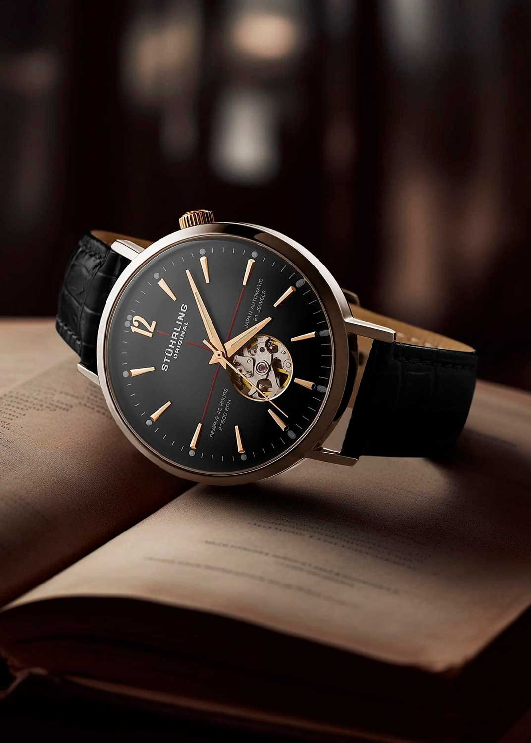 Stuhrling 1021.03 — элегантные механические мужские часы с выразительным дизайном и открытым сердцем, подчёркивающим красоту работы механизма. Глубокий чёрный циферблат с лаконичными метками и аккуратным окном open-heart создаёт гармоничный баланс между классикой и современной динамикой. Корпус из нержавеющей стали придаёт модели строгость и долговечность, а ремешок из натуральной кожи с фактурой крокодила обеспечивает комфорт и безупречный внешний вид. Прочное стекло KrysternaKrysternaKrysterna — инновационное стекло для наручных часов. Благодаря уникальной структуре, Krysterna объединяет ключевые преимущества двух материалов: твердость сапфира, защищающую от царапин, и гибкость минерального стекла, обеспечивающую устойчивость к деформациям. Такая комбинация делает его идеальным решением для часов, подверженных экстремальным нагрузкам, сохраняя при этом оптическую прозрачность. защищает циферблат от царапин и сохраняет прозрачность даже при активном использовании. Stuhrling — воплощение технической точности и утончённого стиля для мужчин, ценящих эстетику классических механических часов.