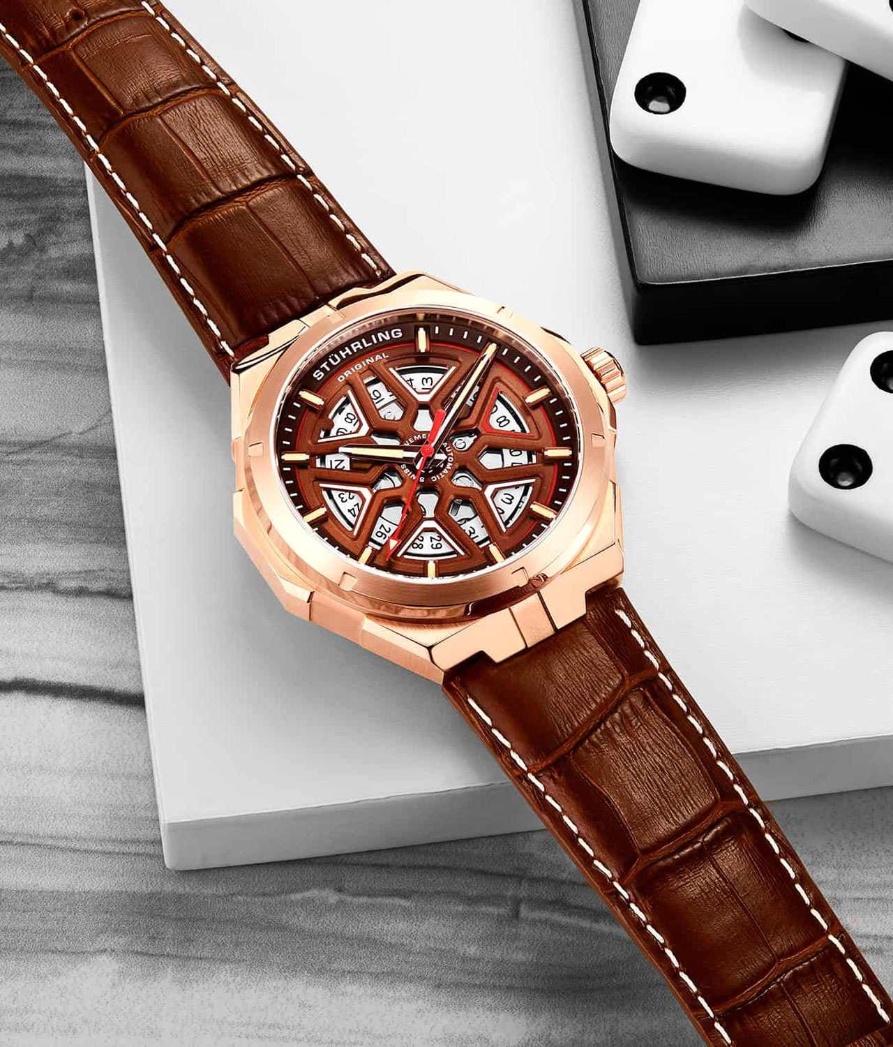 Stuhrling 379.05 — футуристические мужские часы, сочетающие смелый инженерный дизайн и надёжную механику. Архитектурный циферблат с многослойной структурой придаёт модели динамику и глубину. Стрелки и метки с люминесцентным покрытиемЛюминесцентное покрытиеПозволяет считывать показания времени в темноте. Производители наносят на стрелки, часовые индексы, безель или поверхность циферблата светонакопительный состав, дающий холодное свечение.. Корпус из нержавеющей стали с PVD-покрытиемPVDУльтратонкое покрытие наносится в технике вакуумного напыления, сочетает в себе нитрид титана особой прочности со слоем золота или оксида хрома. Несёт в себе декоративную или защитную функцию. выполнен с филигранной обработкой граней, подчёркивая технический характер часов. Прочное стекло KrysternaKrysternaKrysterna — инновационное стекло для наручных часов. Благодаря уникальной структуре, Krysterna объединяет ключевые преимущества двух материалов: твердость сапфира, защищающую от царапин, и гибкость минерального стекла, обеспечивающую устойчивость к деформациям. Такая комбинация делает его идеальным решением для часов, подверженных экстремальным нагрузкам, сохраняя при этом оптическую прозрачность. защищает сложную конструкцию от повреждений, сохраняя идеальную прозрачность. Кожаный ремень с контрастной строчкой и стандартной застежкой, обеспечивает комфорт и надёжную посадку. Stuhrling — выбор для тех, кто ценит оригинальность и технологичный стиль, где каждая деталь работает на впечатление.