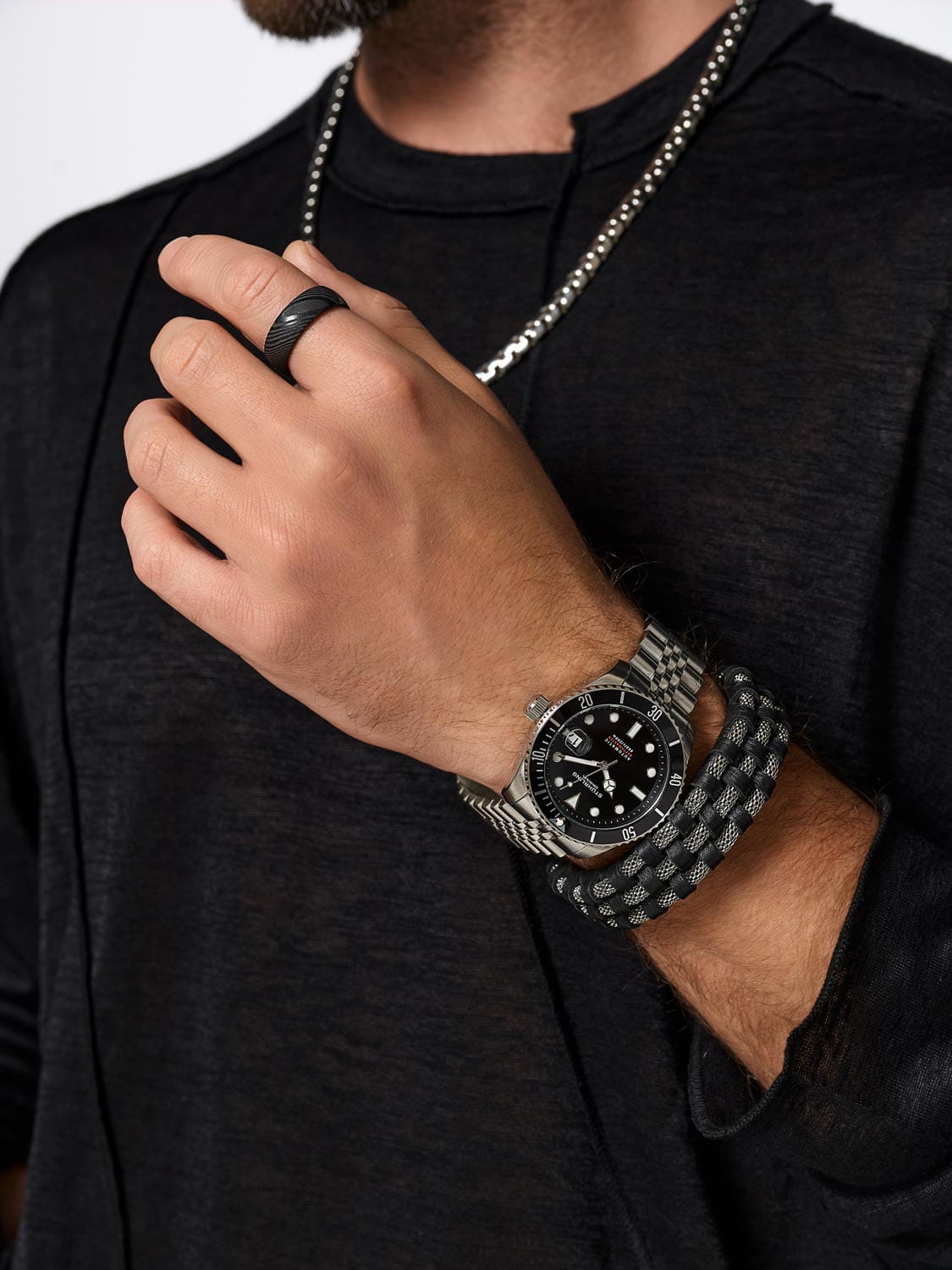 Stuhrling 4045.1 — надёжные мужские механические часы в стиле профессионального дайвера, сочетающие мощный дизайн и техническую точность. Корпус из нержавеющей стали с однонаправленным безелемБезельВнешний ободок, закрепляющий стекло. В спортивных часах так называется поворотное кольцо с делениями на циферблате, выполняет роль таймера – замеряет отрезки времени на шкале. Неподвижный безель – элемент декора. Однонаправленно вращающийся безель на дайверских часах позволяет фиксировать моменты погружения и выныривания на поверхность. с PVD-покрытиемPVDУльтратонкое покрытие наносится в технике вакуумного напыления, сочетает в себе нитрид титана особой прочности со слоем золота или оксида хрома. Несёт в себе декоративную или защитную функцию. и крупной заводной головкой подчёркивает инструментальный характер модели. Циферблат с контрастными стрелками и метками, покрытыми люминесцентным составомЛюминесцентное покрытиеПозволяет считывать показания времени в темноте. Производители наносят на стрелки, часовые индексы, безель или поверхность циферблата светонакопительный состав, дающий холодное свечение., обеспечивает отличную читаемость даже под водой. Прочное стекло KrysternaKrysternaKrysterna — инновационное стекло для наручных часов. Благодаря уникальной структуре, Krysterna объединяет ключевые преимущества двух материалов: твердость сапфира, защищающую от царапин, и гибкость минерального стекла, обеспечивающую устойчивость к деформациям. Такая комбинация делает его идеальным решением для часов, подверженных экстремальным нагрузкам, сохраняя при этом оптическую прозрачность. защищает от царапин, а стальной браслет с раскладной застёжкойРаскладная застёжкаТакой тип застёжки используется только на браслетах из металла. Она никогда не раскрывается полностью, происходит разделение на 2 и более частей. Раскладывающая застёжка снизит вероятность потери часов к минимуму. обеспечивает надёжную фиксацию и комфортное прилегание к запястью. Stuhrling — выбор для тех, кто ценит функциональность, стиль и уверенность в любой среде.