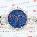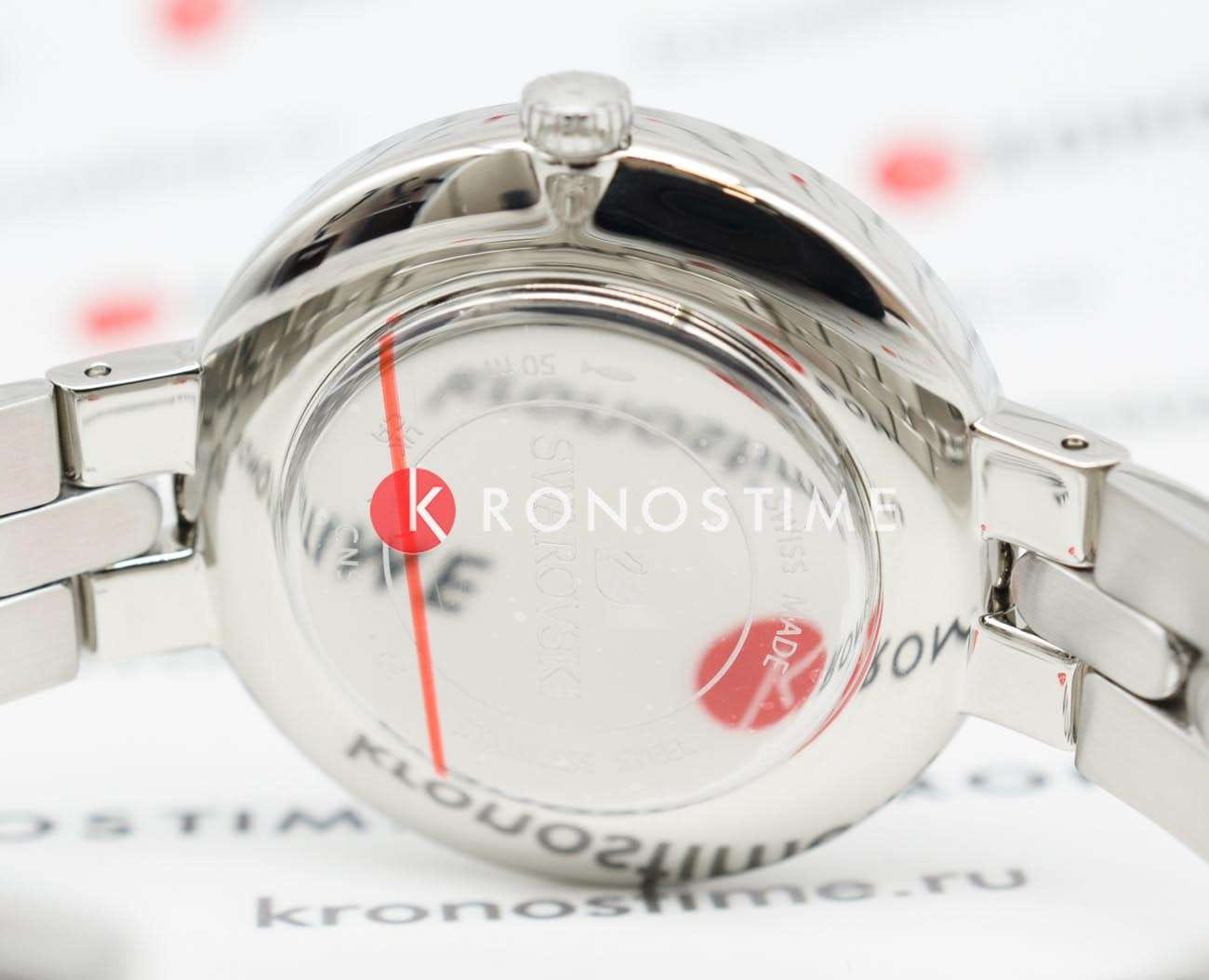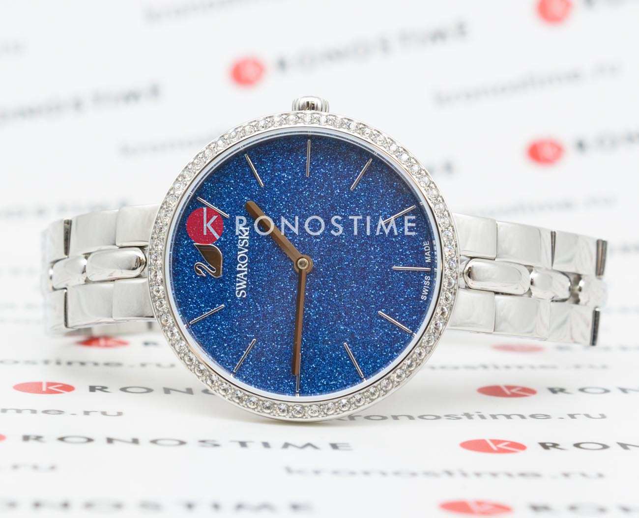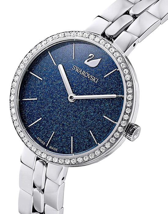 Синий циферблат с изящными серебристыми метками и стрелками подчёркивает элегантность часов. На отметке «12 часов» расположен логотип Swarovski в виде лебедя.