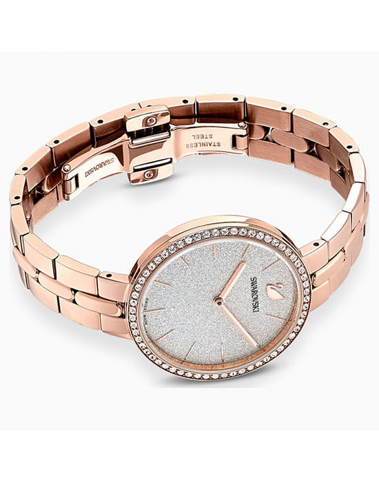 Swarovski 5517803 из коллекции Cosmopolitan — элегантные женские часы, сочетающие современный дизайн и высокое качество. Корпус диаметром 32 мм выполнен из нержавеющей стали с розовым PVD-покрытиемPVDУльтратонкое покрытие наносится в технике вакуумного напыления, сочетает в себе нитрид титана особой прочности со слоем золота или оксида хрома. Несёт в себе декоративную или защитную функцию., что придаёт часам долговечность и утончённый внешний вид. БезельБезельВнешний ободок, закрепляющий стекло. В спортивных часах так называется поворотное кольцо с делениями на циферблате, выполняет роль таймера – замеряет отрезки времени на шкале. Неподвижный безель – элемент декора. Однонаправленно вращающийся безель на дайверских часах позволяет фиксировать моменты погружения и выныривания на поверхность. украшен кристаллами Swarovski, создающими изысканный блеск. Минеральное стеклоМинеральное стеклоМинеральное стекло представляет собой искусственно выращенный минерал кварца. Такое стекло отличается особой устойчивостью к повреждениям и царапинам. Уступает по некоторым качествам сапфировому стеклу. защищает циферблат от царапин и повреждений. Циферблат серебристого цвета с изящными розово-золотистыми метками и стрелками подчёркивает элегантность дизайна. Логотип Swarovski в виде лебедя расположен на отметке «12 часов». Часы оснащены швейцарским кварцевым механизмом, обеспечивающим точный и надёжный ход. Водозащита до 5 ATM (50 метров) позволяет использовать часы в повседневной жизни, включая лёгкие контакты с водой. Браслет из нержавеющей стали с розовым PVD-покрытиемPVDУльтратонкое покрытие наносится в технике вакуумного напыления, сочетает в себе нитрид титана особой прочности со слоем золота или оксида хрома. Несёт в себе декоративную или защитную функцию. гарантирует комфортное ношение. Застёжка-бабочка с кнопкамиЗастёжка "бабочка"Такой вид застёжки дополняется предохранителями, помогающими избежать случайного раскрытия браслета. Обладают изящным исполнением. обеспечивает надёжную фиксацию на запястье. Swarovski 5517803 — это идеальный выбор для женщин, которые ценят стиль, утончённость и функциональность.