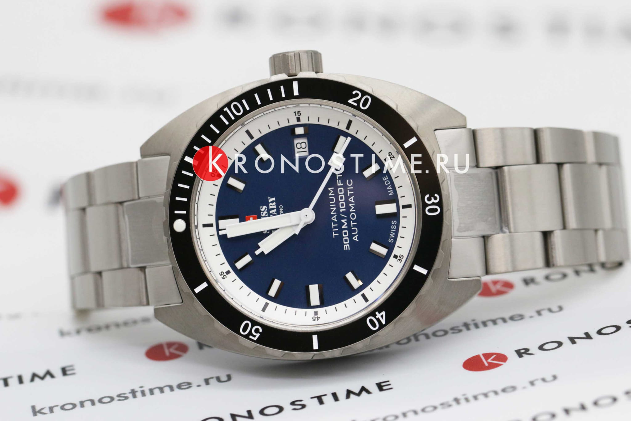 Мужские швейцарские механические часы с автоподзаводом Swiss Military by Chrono Titanium 300 SMA34100.03. Сапфировое стеклоСапфировое стеклоПрочный и надёжный материал из кристалла сапфира синтетического происхождения, характеризующийся особой твёрдостью и устойчивостью к царапинам и повреждениям. устойчивое к появлению царапин, обладающее высокой прозрачностью. Корпус часов изготовлен из титана. Вращающийся безельБезельВнешний ободок, закрепляющий стекло. В спортивных часах так называется поворотное кольцо с делениями на циферблате, выполняет роль таймера – замеряет отрезки времени на шкале. Неподвижный безель – элемент декора. Однонаправленно вращающийся безель на дайверских часах позволяет фиксировать моменты погружения и выныривания на поверхность. из высокотехнологичной керамикиВысокотехнологичная керамикаИнновационный запатентованный Rado материал с гладкой или матовой поверхностью. Керамика за счёт кристаллической структуры обладает повышенной устойчивостью от возникновения царапин. Материал способен принимать температуру тела человека, обеспечивая невероятный комфорт при ношении.. Индикация даты на позиции трех часов. Стрелки и метки с люминесцентной подсветкойЛюминесцентное покрытиеПозволяет считывать показания времени в темноте. Производители наносят на стрелки, часовые индексы, безель или поверхность циферблата светонакопительный состав, дающий холодное свечение.. Класс водозащиты: 300 метров, позволит плавать, нырять и заниматься другими водными видами спорта. Титановый браслет на раскладной застёжкеРаскладная застёжкаТакой тип застёжки используется только на браслетах из металла. Она никогда не раскрывается полностью, происходит разделение на 2 и более частей. Раскладывающая застёжка снизит вероятность потери часов к минимуму..