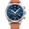 Часы-хронографХронографФункция позволяет измерять отрезки времени с особой точностью: часы, минуты, секунды. Верным признаком хронографа является наличие на циферблате 3 дополнительных окошек-счётчиков.. Кварцевый механизм с высокой точностью. Минеральное стеклоМинеральное стеклоМинеральное стекло представляет собой искусственно выращенный минерал кварца. Такое стекло отличается особой устойчивостью к повреждениям и царапинам. Уступает по некоторым качествам сапфировому стеклу. устойчивое к появлению царапин, обладающее высокой прозрачностью. Стрелки с люминесцентным покрытиемЛюминесцентное покрытиеПозволяет считывать показания времени в темноте. Производители наносят на стрелки, часовые индексы, безель или поверхность циферблата светонакопительный состав, дающий холодное свечение.. Класс водозащиты: 100 метров, позволит плавать, нырять и заниматься другими водными видами спорта. Корпус часов изготовлен из нержавеющей стали. Кожаный ремешок с классической застежкой.