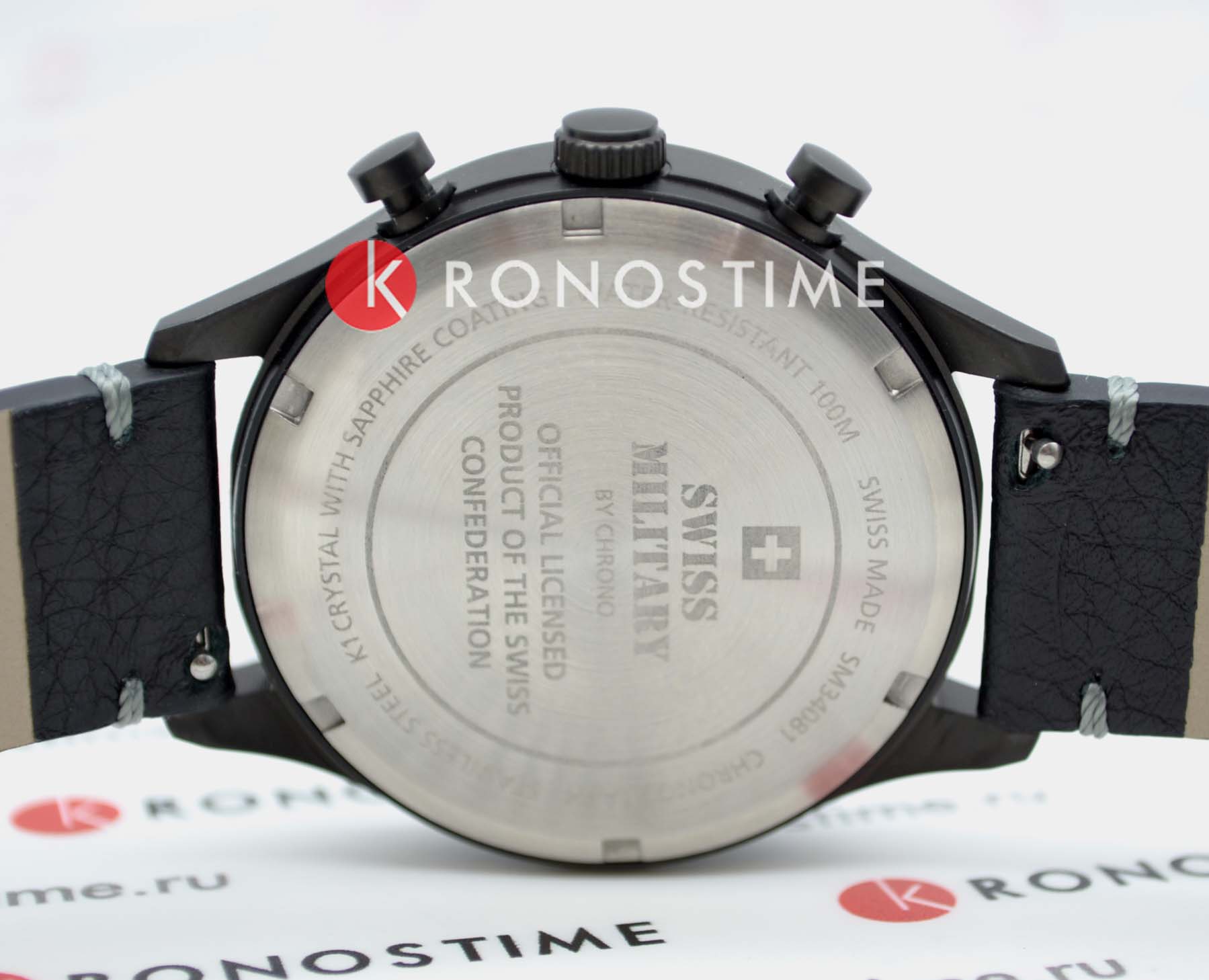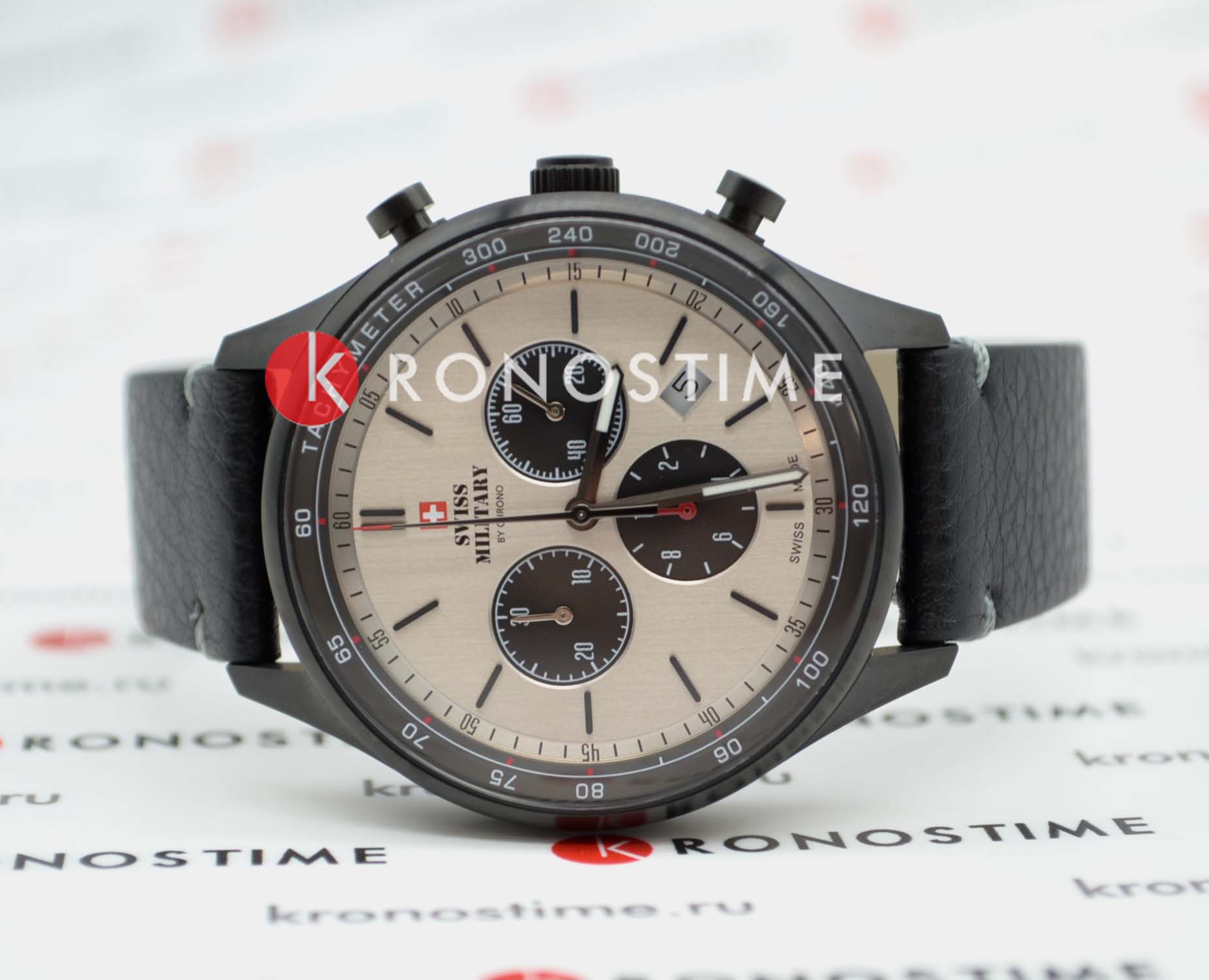 Мужские швейцарские наручные часы-хронографХронографФункция позволяет измерять отрезки времени с особой точностью: часы, минуты, секунды. Верным признаком хронографа является наличие на циферблате 3 дополнительных окошек-счётчиков. Swiss Military by Chrono SM34013.11, кварцевый механизм с высокой точностью. Класс водозащиты: 100 метров, позволит плавать, нырять и заниматься другими водными видами спорта. Стрелки с люминесцентным покрытиемЛюминесцентное покрытиеПозволяет считывать показания времени в темноте. Производители наносят на стрелки, часовые индексы, безель или поверхность циферблата светонакопительный состав, дающий холодное свечение.. Корпус часов изготовлен из стали с PVD-покрытиемPVDУльтратонкое покрытие наносится в технике вакуумного напыления, сочетает в себе нитрид титана особой прочности со слоем золота или оксида хрома. Несёт в себе декоративную или защитную функцию.. Минеральное стеклоМинеральное стеклоМинеральное стекло представляет собой искусственно выращенный минерал кварца. Такое стекло отличается особой устойчивостью к повреждениям и царапинам. Уступает по некоторым качествам сапфировому стеклу.. Ремешок с классической застежкой.