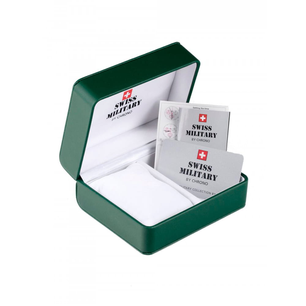 Мужские швейцарские наручные часы Swiss Military by Chrono SM34097.02, Кварцевый механизм с высокой точностью. Класс водозащиты: 50 метров, позволит защитить корпус от случайных брызг или капель дождя. Стрелки и метки с люминесцентным покрытиемЛюминесцентное покрытиеПозволяет считывать показания времени в темноте. Производители наносят на стрелки, часовые индексы, безель или поверхность циферблата светонакопительный состав, дающий холодное свечение.. Корпус выполнен из нержавеющей стали. Устойчивое к возникновению царапин минеральное стеклоМинеральное стеклоМинеральное стекло представляет собой искусственно выращенный минерал кварца. Такое стекло отличается особой устойчивостью к повреждениям и царапинам. Уступает по некоторым качествам сапфировому стеклу.. Браслет выполнен из нержавеющей стали.