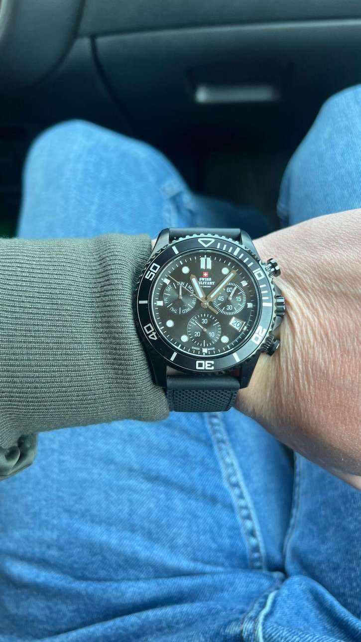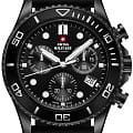 Часы Swiss Military SM34101.07 — это стильный мужской хронограф, который сочетает швейцарское качество и функциональность. Корпус диаметром 46 мм выполнен из нержавеющей стали с чёрным PVD-покрытиемPVDУльтратонкое покрытие наносится в технике вакуумного напыления, сочетает в себе нитрид титана особой прочности со слоем золота или оксида хрома. Несёт в себе декоративную или защитную функцию., что придаёт часам современный и прочный вид. Чёрный циферблат с люминесцентными стрелкамиЛюминесцентное покрытиеПозволяет считывать показания времени в темноте. Производители наносят на стрелки, часовые индексы, безель или поверхность циферблата светонакопительный состав, дающий холодное свечение. и метками обеспечивает превосходную читаемость даже в условиях низкой освещённости. Циферблат защищён сапфировым стекломСапфировое стеклоПрочный и надёжный материал из кристалла сапфира синтетического происхождения, характеризующийся особой твёрдостью и устойчивостью к царапинам и повреждениям., устойчивым к царапинам.