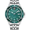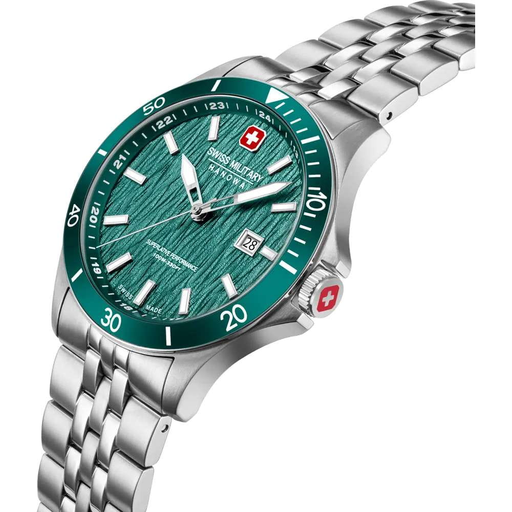 Мужские кварцевые часы Swiss Military Hanowa — швейцарская надёжность в классическом исполнении. Корпус круглый, из нержавеющей стали, диаметром 42 мм. Циферблат — зелёный с серебристыми стрелками. Стекло — сапфировоеСапфировое стеклоПрочный и надёжный материал из кристалла сапфира синтетического происхождения, характеризующийся особой твёрдостью и устойчивостью к царапинам и повреждениям.. Механизм — швейцарский кварцевый Ronda 505 с функцией (остановка секундной стрелки для точной настройки). БезельБезельВнешний ободок, закрепляющий стекло. В спортивных часах так называется поворотное кольцо с делениями на циферблате, выполняет роль таймера – замеряет отрезки времени на шкале. Неподвижный безель – элемент декора. Однонаправленно вращающийся безель на дайверских часах позволяет фиксировать моменты погружения и выныривания на поверхность. — неподвижный, из нержавеющей стали с IP-покрытиемIP-покрытиеМетод ионного напыления. Демонстрирует повышенную устойчивость к истиранию, окислению и химическим веществам. Под воздействием высокого давления и температуры около 1500°C молекулы металла надёжно соединяются с частицами корпуса часов.. Задняя крышка — завинчивающаяся. Водонепроницаемость 100 м. Браслет — стальной, на раскладной застёжке с кнопками и фиксаторомРаскладная застёжкаТакой тип застёжки используется только на браслетах из металла. Она никогда не раскрывается полностью, происходит разделение на 2 и более частей. Раскладывающая застёжка снизит вероятность потери часов к минимуму.. Идеальный выбор для тех, кто ценит швейцарское качество и классический стиль.