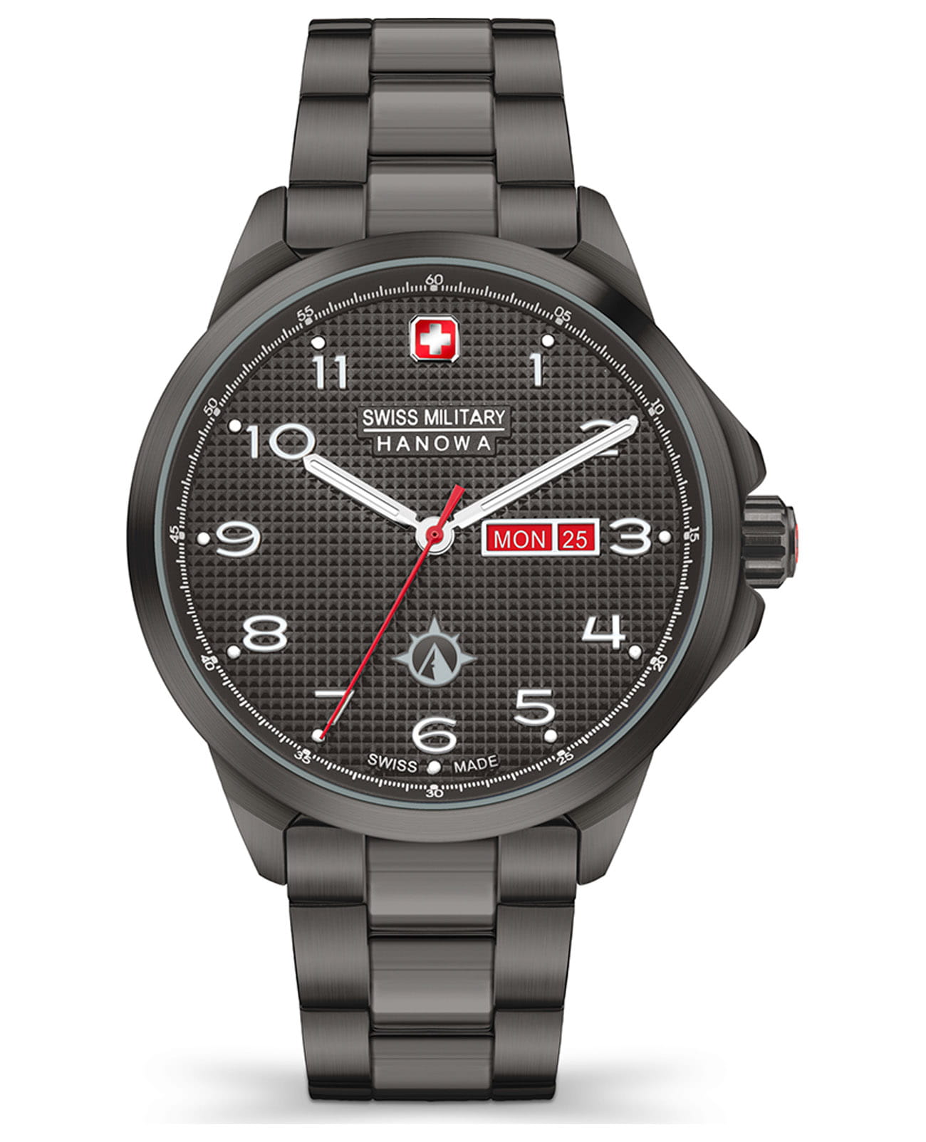 Швейцарские мужские часы Swiss Military Hanowa SMWGH2100341, кварцевый механизм с высокой точностью. Сапфировое стеклоСапфировое стеклоПрочный и надёжный материал из кристалла сапфира синтетического происхождения, характеризующийся особой твёрдостью и устойчивостью к царапинам и повреждениям. устойчивое к появлению царапин, обладающее высокой прозрачностью. Циферблат украшен декоративным узором Clous de Paris (Парижские гвозди). Часовая и минутная стрелки с люминесцентным покрытиемЛюминесцентное покрытиеПозволяет считывать показания времени в темноте. Производители наносят на стрелки, часовые индексы, безель или поверхность циферблата светонакопительный состав, дающий холодное свечение., которое светится в темноте после непродолжительной зарядки на свету. Класс водозащиты: 100 метров, позволит плавать, нырять и заниматься другими водными видами спорта. Корпус и браслет часов изготовлены из стали с IP-покрытиемIP-покрытиеМетод ионного напыления. Демонстрирует повышенную устойчивость к истиранию, окислению и химическим веществам. Под воздействием высокого давления и температуры около 1500°C молекулы металла надёжно соединяются с частицами корпуса часов. черного цвета. Окошки дня недели и даты находятся в положении 3 часа. Метки в виде арабских цифр, 12-ти часовая метка в виде фирменного логотипа. Рифленая заводная головка с защитой. Завинчивающаяся задняя крышка. Браслет с раскладной застёжкойРаскладная застёжкаТакой тип застёжки используется только на браслетах из металла. Она никогда не раскрывается полностью, происходит разделение на 2 и более частей. Раскладывающая застёжка снизит вероятность потери часов к минимуму.. Застежка с системой блокировки.