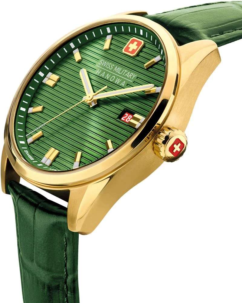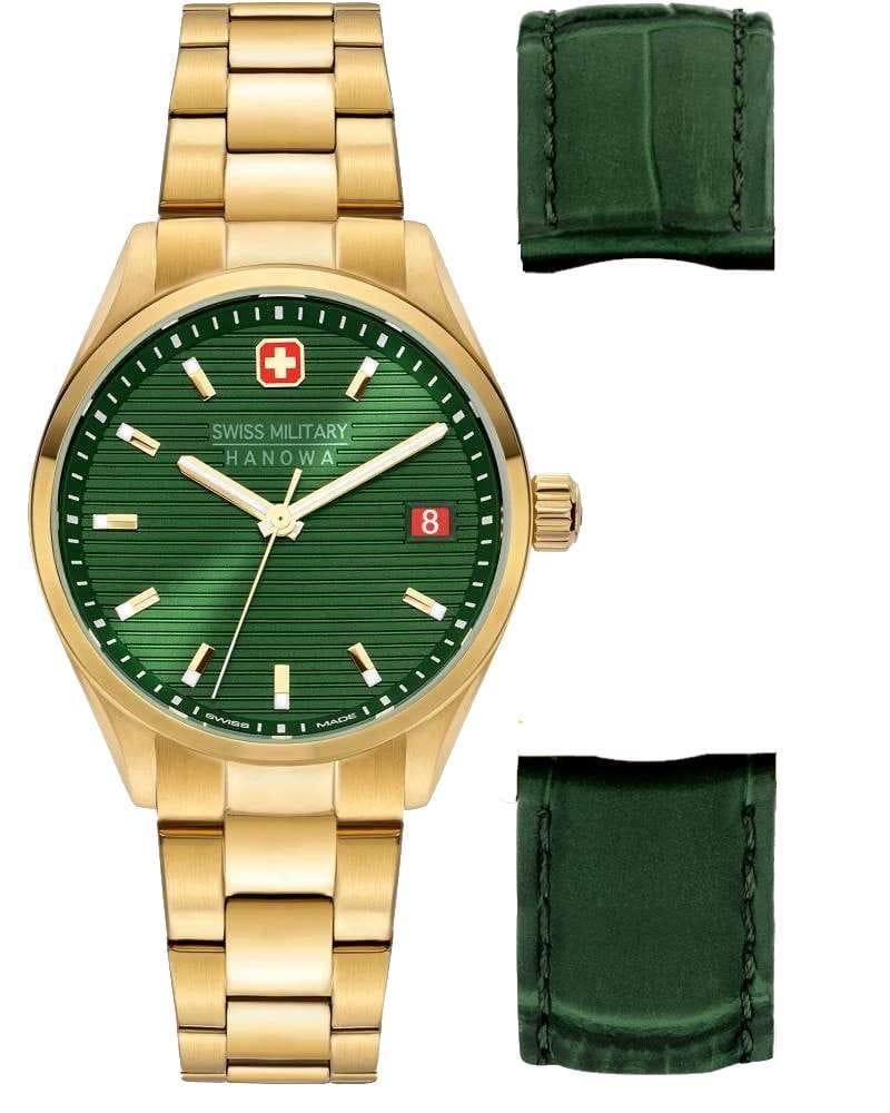 Мужские швейцарские часы Swiss Military Hanowa SMWGH2200112-SET – это элегантные часы, сочетающие в себе классический дизайн и современную функциональность. Корпус из нержавеющей стали с PVD-покрытиемPVDУльтратонкое покрытие наносится в технике вакуумного напыления, сочетает в себе нитрид титана особой прочности со слоем золота или оксида хрома. Несёт в себе декоративную или защитную функцию. диаметром 43 мм сбалансирован и элегантен. Сапфировое стеклоСапфировое стеклоПрочный и надёжный материал из кристалла сапфира синтетического происхождения, характеризующийся особой твёрдостью и устойчивостью к царапинам и повреждениям. с антибликовым покрытием защищает циферблат от царапин и обеспечивает отличную читаемость при любом освещении. Браслет с раскладной застёжкойРаскладная застёжкаТакой тип застёжки используется только на браслетах из металла. Она никогда не раскрывается полностью, происходит разделение на 2 и более частей. Раскладывающая застёжка снизит вероятность потери часов к минимуму. идеально дополняют дизайн часов, обеспечивая комфортное ношение. Люминесцентное покрытиеЛюминесцентное покрытиеПозволяет считывать показания времени в темноте. Производители наносят на стрелки, часовые индексы, безель или поверхность циферблата светонакопительный состав, дающий холодное свечение. стрелок и меток позволит вам следить за временем даже в полной темноте. Индикатор даты в положении 3 часа. Водонепроницаемость до 100 метров хорошо подходят для повседневного ношения и занятий водными видами спорта.