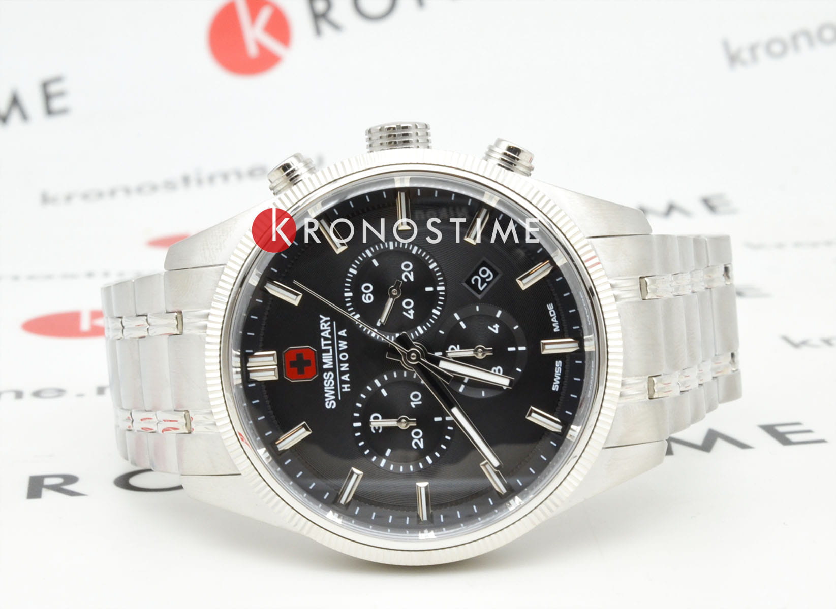 Мужские швейцарские часы-хронографХронографФункция позволяет измерять отрезки времени с особой точностью: часы, минуты, секунды. Верным признаком хронографа является наличие на циферблате 3 дополнительных окошек-счётчиков. Swiss Military Hanowa SMWGI0003102, кварцевый механизм с высокой точностью. Сапфировое стеклоСапфировое стеклоПрочный и надёжный материал из кристалла сапфира синтетического происхождения, характеризующийся особой твёрдостью и устойчивостью к царапинам и повреждениям. устойчивое к появлению царапин, обладающее высокой прозрачностью. Окошко даты находится в положении между 4 и 5 часами. Класс водозащиты: 100 метров, позволит плавать, нырять и заниматься другими водными видами спорта. Корпус часов изготовлен из стали. Стальной браслет на раскладной застёжкеРаскладная застёжкаТакой тип застёжки используется только на браслетах из металла. Она никогда не раскрывается полностью, происходит разделение на 2 и более частей. Раскладывающая застёжка снизит вероятность потери часов к минимуму.. Стрелки и метки с люминесцентным покрытиемЛюминесцентное покрытиеПозволяет считывать показания времени в темноте. Производители наносят на стрелки, часовые индексы, безель или поверхность циферблата светонакопительный состав, дающий холодное свечение..