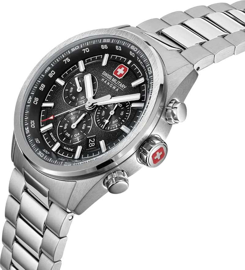 Мужские швейцарские часы Swiss Military Hanowa SMWGI0004204 – это элегантные часы, сочетающие в себе классический дизайн и современную функциональность. Корпус из нержавеющей стали диаметром 43 мм сбалансирован и элегантен. Сапфировое стеклоСапфировое стеклоПрочный и надёжный материал из кристалла сапфира синтетического происхождения, характеризующийся особой твёрдостью и устойчивостью к царапинам и повреждениям. с антибликовым покрытием защищает циферблат от царапин и обеспечивает отличную читаемость при любом освещении. Браслет с раскладной застёжкойРаскладная застёжкаТакой тип застёжки используется только на браслетах из металла. Она никогда не раскрывается полностью, происходит разделение на 2 и более частей. Раскладывающая застёжка снизит вероятность потери часов к минимуму. идеально дополняют дизайн часов, обеспечивая комфортное ношение. Люминесцентное покрытиеЛюминесцентное покрытиеПозволяет считывать показания времени в темноте. Производители наносят на стрелки, часовые индексы, безель или поверхность циферблата светонакопительный состав, дающий холодное свечение. стрелок и меток позволит вам следить за временем даже в полной темноте. Циферблат с точным механизмом хронографаХронографФункция позволяет измерять отрезки времени с особой точностью: часы, минуты, секунды. Верным признаком хронографа является наличие на циферблате 3 дополнительных окошек-счётчиков. и хорошо заметным индикатором даты в положении между 4 и 5 часов. ТахиметрТахиметрРазмеченная шкала, располагается на ободке или безеле часов. Тахиметр позволяет рассчитать скорость на определённом участке пути, расстояние измеряется в километрах или милях. по внешнему краю. Водонепроницаемость до 100 метров хорошо подходят для повседневного ношения и занятий водными видами спорта.