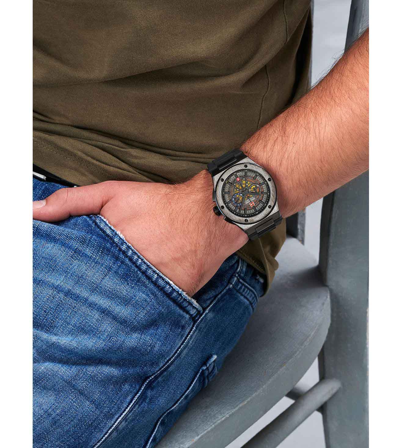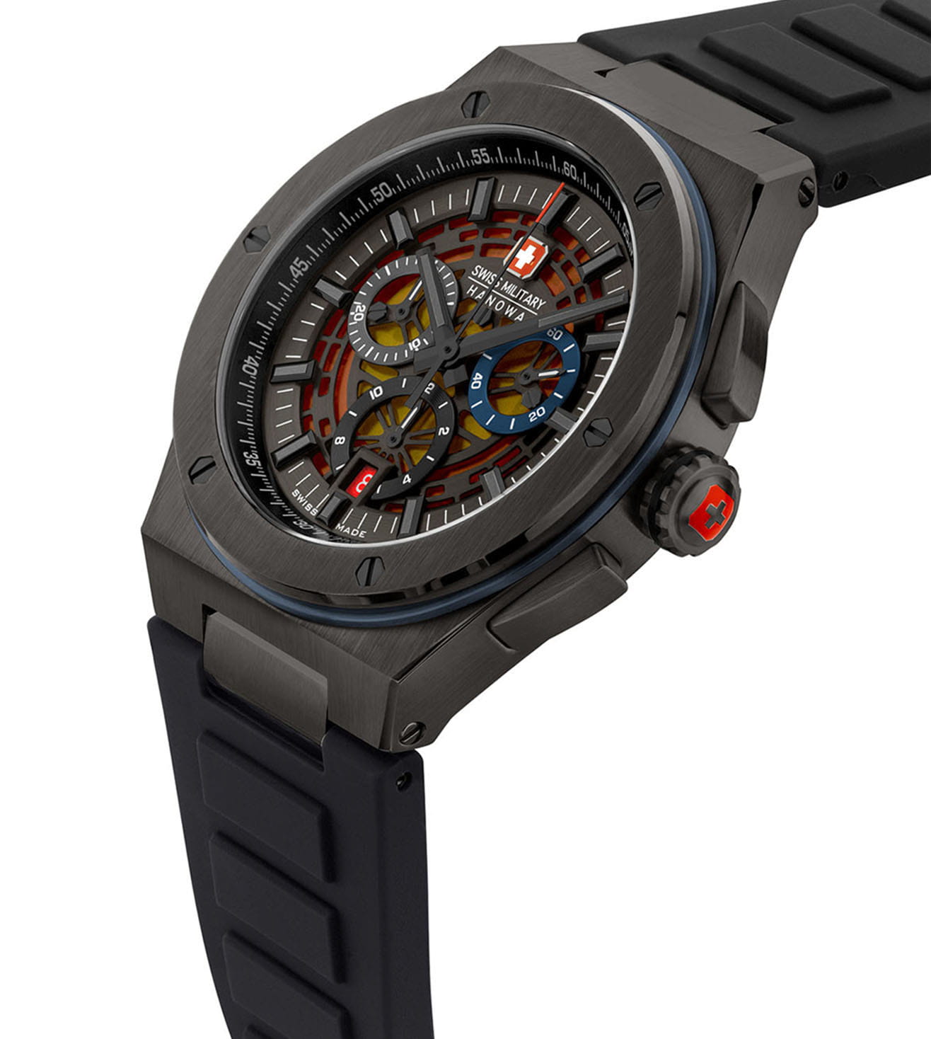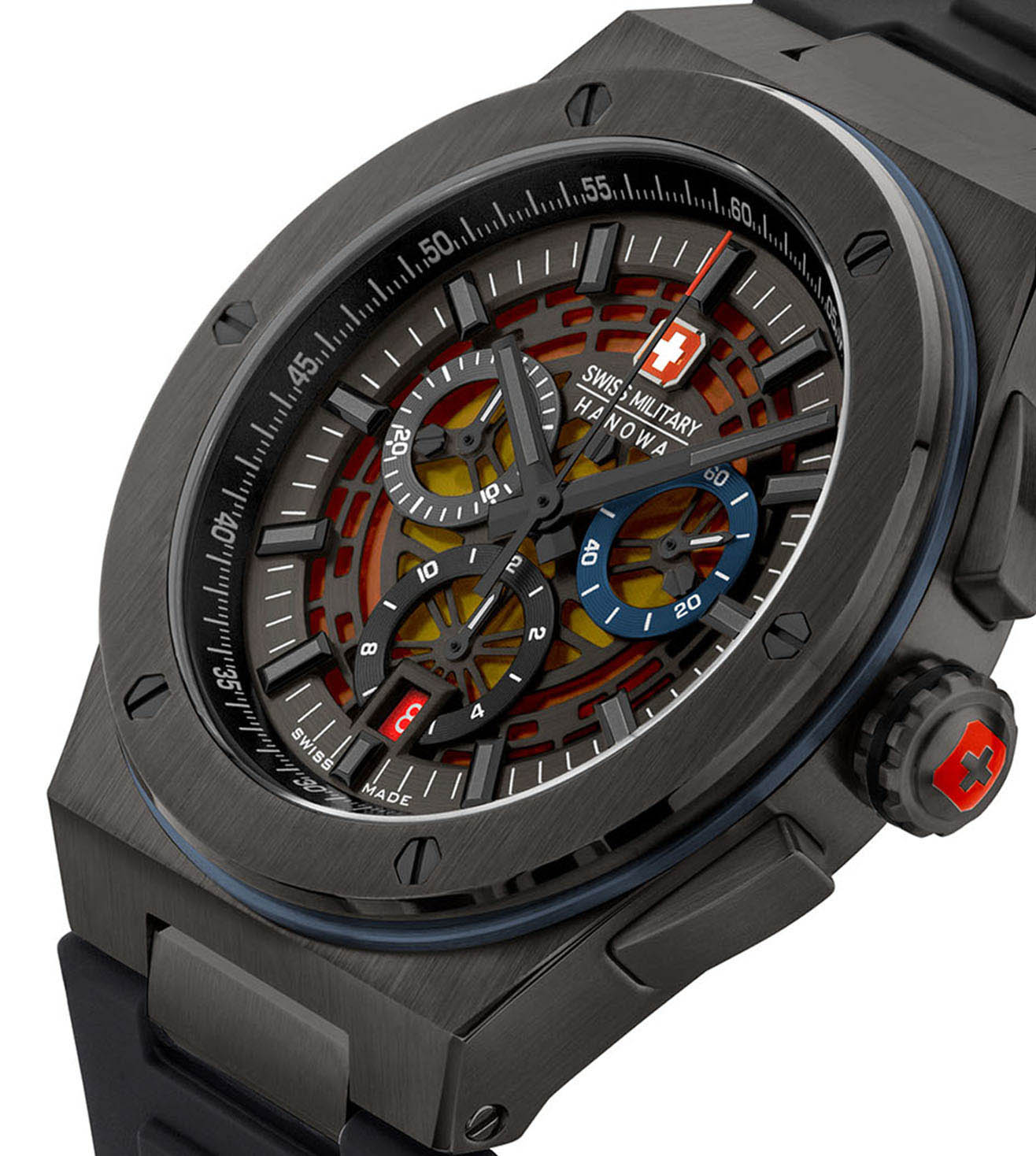 Мужские швейцарские часы-хронографХронографФункция позволяет измерять отрезки времени с особой точностью: часы, минуты, секунды. Верным признаком хронографа является наличие на циферблате 3 дополнительных окошек-счётчиков. Swiss Military Hanowa SMWGO0000940, кварцевый механизм с высокой точностью. Сапфировое стеклоСапфировое стеклоПрочный и надёжный материал из кристалла сапфира синтетического происхождения, характеризующийся особой твёрдостью и устойчивостью к царапинам и повреждениям. устойчивое к появлению царапин, обладающее высокой прозрачностью. Корпус часов изготовлен из нержавеющей стали с PVDPVDУльтратонкое покрытие наносится в технике вакуумного напыления, сочетает в себе нитрид титана особой прочности со слоем золота или оксида хрома. Несёт в себе декоративную или защитную функцию. покрытием. Скелетонизированный циферблат. Стрелки с люминесцентным покрытиемЛюминесцентное покрытиеПозволяет считывать показания времени в темноте. Производители наносят на стрелки, часовые индексы, безель или поверхность циферблата светонакопительный состав, дающий холодное свечение.. Окошко даты в положении 6 часов. Класс водозащиты: 100 метров, позволит плавать, нырять и заниматься другими водными видами спорта. Каучуковый ремешок на стандартной застежке.