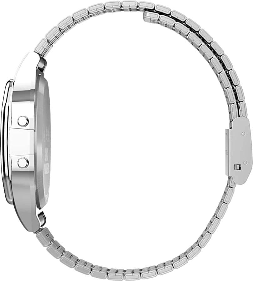 Часы Timex TW2V30000 представляют собой современный электронный аксессуар с уникальным дизайном, вдохновленным классической видеоигрой Space Invaders. Эти часы, произведенные в США, оснащены кварцевым механизмом и предназначены для активного образа жизни. Корпус часов выполнен из латуни, а акриловое пластиковое стекло защищает зеленый ЖК-циферблат, на котором отображается время, дата, день недели и месяц. Специальная серия часов украшена аутентичной пиксельной графикой, изображающей пришельцев и лазерные шутеры, что придает им оригинальный вид. Одной из ключевых особенностей является фирменная подсветка Indiglo, которая обеспечивает удобное считывание информации в темное время суток. Часы также оснащены электронным SPLIT-хронографомХронографФункция позволяет измерять отрезки времени с особой точностью: часы, минуты, секунды. Верным признаком хронографа является наличие на циферблате 3 дополнительных окошек-счётчиков. с точностью до 1/100 секунды, с секундомеромСекундомерСекундоме́р — прибор, способный измерять интервалы времени с точностью до долей секунды. и функцией ежедневного будильникаБудильникБуди́льник — часы, в заданный момент времени подающие звуковой, световой и/или в редких случаях другой сигнал., что делает их функциональным аксессуаром для повседневного использования. Стальной браслет с раскладным замкомРаскладной замокДанный вариант застежки используется только на часах с металлическим браслетом. Отличительная особенность такого крепления в том, что длина браслета становится универсальной и вы можете самостоятельно отрегулировать нужный вам размер – застежка просто двигается по браслету часов. обеспечивает надежную фиксацию на запястье и комфорт в ношении. Габаритные размеры часов составляют 34x29 мм, толщина — 10 мм, а ширина браслета — 18 мм. Водозащита 30WR обеспечивает защиту от случайных брызг. Сзади корпус украшен гравировкой и крепится на четырех винтах, что подчеркивает внимание к деталям и долговечность. Часы поставляются в специальной упаковке, что делает их отличным выбором для подарка или личного использования.