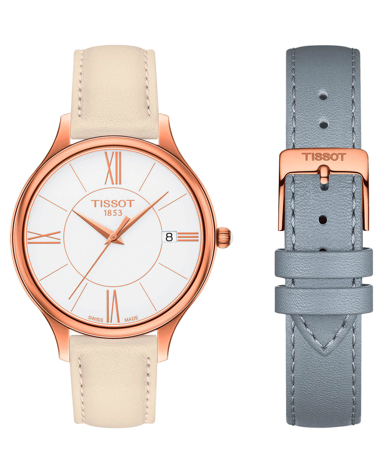 Уникальность этой модели заключается в наличии дополнительного ремешка серого цвета, благодаря чему вы получаете 2 аксессуара в 1. Лаконичный белый циферблат дополнен золотистыми римскими цифрами, что придаёт часам ещё больше очарования. Кварцевый швейцарский калибр ETA F06.111 с высокой точностью хода. Корпус с PVD-покрытиемPVDУльтратонкое покрытие наносится в технике вакуумного напыления, сочетает в себе нитрид титана особой прочности со слоем золота или оксида хрома. Несёт в себе декоративную или защитную функцию. цвета розового золота. Стекло из сапфира. Индикатор EOLEOLПредставляет собой систему, уведомляющую владельца часов о необходимости замены элемента питания. За 2 недели до полного разряда батарейки секундная стрелка перестаёт ходить чётко и начинает перепрыгивать на 3-4 деления.. Габариты: 38 x 38 x 7,1 мм.