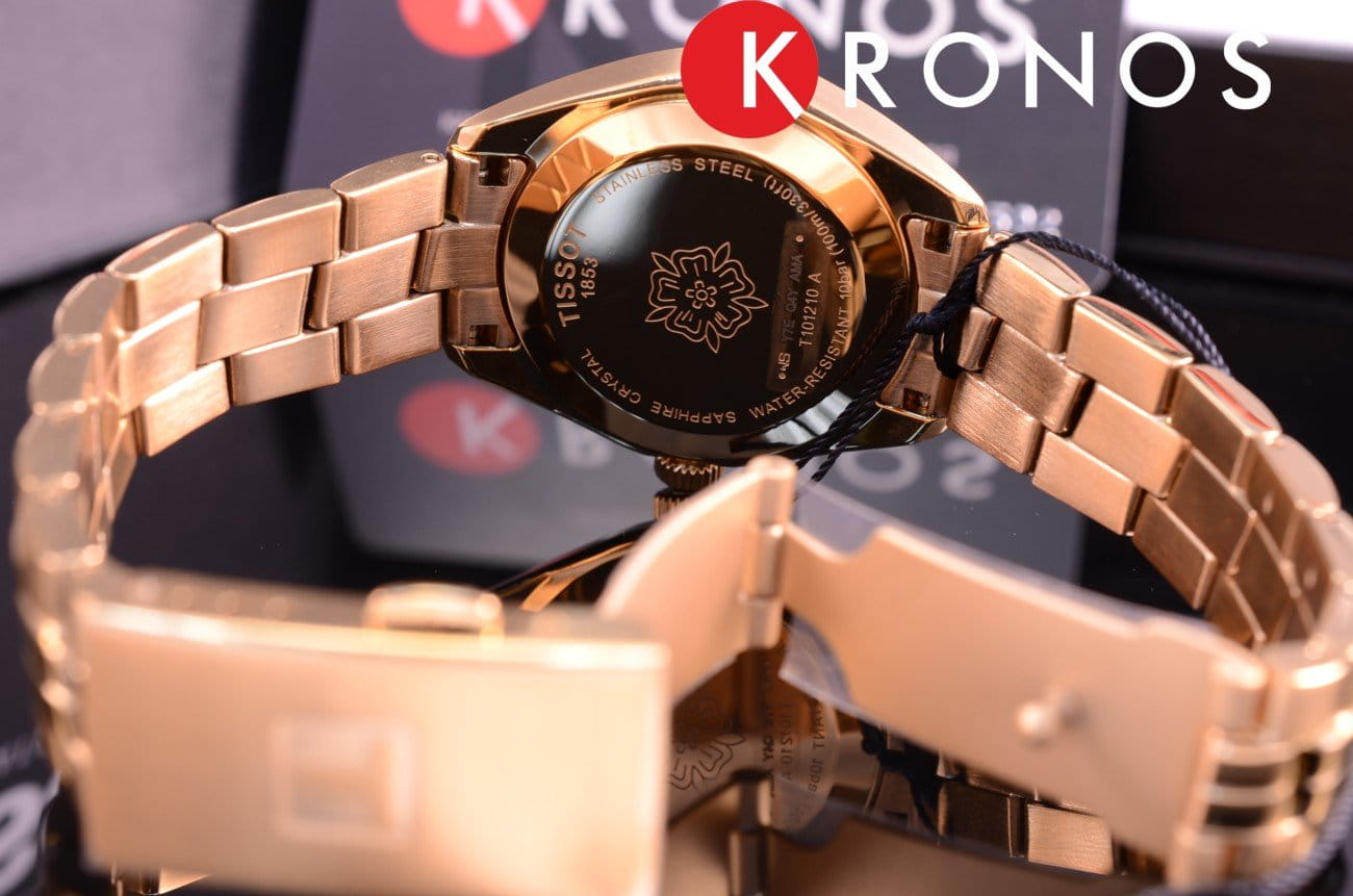 Часы являются воплощением традиций Tissot и элегантности, модель в цвете розового золота будет уместна на любом мероприятии. Такой оттенок образуется благодаря PVD-покрытиюPVDУльтратонкое покрытие наносится в технике вакуумного напыления, сочетает в себе нитрид титана особой прочности со слоем золота или оксида хрома. Несёт в себе декоративную или защитную функцию., устойчивому к царапинам и повреждениям. Кварцевый высокоточный калибр ETA F04.111. Сапфировое стекло. Люминесцентное покрытиеЛюминесцентное покрытиеПозволяет считывать показания времени в темноте. Производители наносят на стрелки, часовые индексы, безель или поверхность циферблата светонакопительный состав, дающий холодное свечение. стрелок. Водостойкость 100 метров. Застёжка бабочка с кнопками. Функционал: EOLEOLПредставляет собой систему, уведомляющую владельца часов о необходимости замены элемента питания. За 2 недели до полного разряда батарейки секундная стрелка перестаёт ходить чётко и начинает перепрыгивать на 3-4 деления., индикация даты. Габариты: 33 x 33 x 9 мм.