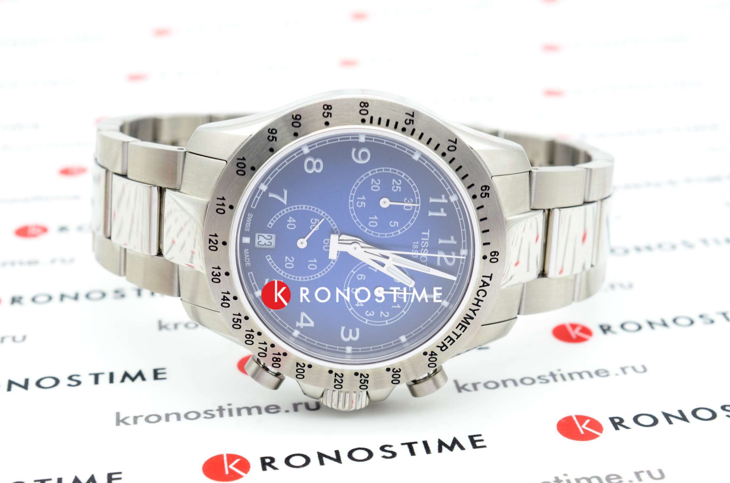 Сдержанный тёмно-синий циферблат со счётчиками хронографаХронографФункция позволяет измерять отрезки времени с особой точностью: часы, минуты, секунды. Верным признаком хронографа является наличие на циферблате 3 дополнительных окошек-счётчиков. акцентирует всё внимание на себе. Стрелки имеют люминесцентную подсветкуЛюминесцентное покрытиеПозволяет считывать показания времени в темноте. Производители наносят на стрелки, часовые индексы, безель или поверхность циферблата светонакопительный состав, дающий холодное свечение., чтобы использование часов в темноте не вызывало затруднений. Привлекательный внешний вид. Кварцевый механизм ETA G10.212. Хирургическая сталь устойчива к повреждениям и ударам. Водозащита до 10 бар. . Секундомер, тахиметрТахиметрРазмеченная шкала, располагается на ободке или безеле часов. Тахиметр позволяет рассчитать скорость на определённом участке пути, расстояние измеряется в километрах или милях., календарь. Габариты: 42,5 x 42,5 x 11,2 мм.