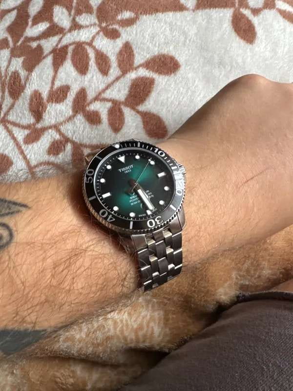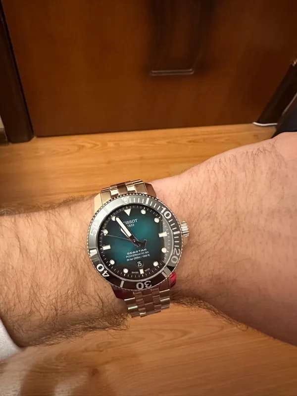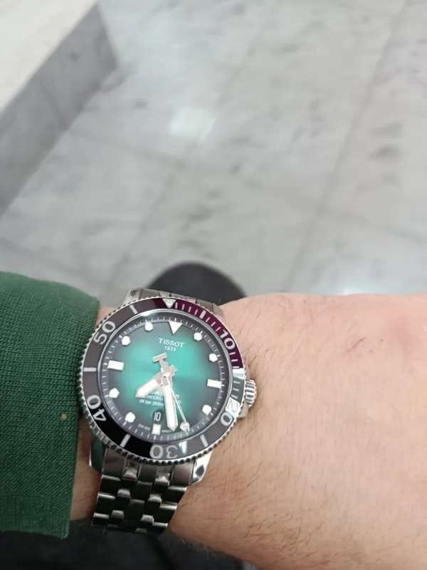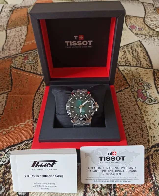 Это превосходная модель с запоминающимся дизайном, основанная на точном и надёжном механизме. Часы оснащены сапфировым стеклом, керамической вставкой на безеле и обладают серьёзным уровнем водозащиты. За первые 24 часа наблюдения точность хода составила +1 секунду. Среди всей линейки Seastar этот вариант с градиентным зелёным циферблатом очень выделяется. Экземпляр пришёл в заводских защитных плёнках, без малейших следов носки или постороннего вмешательства. Серийный номер на крышке не повреждён, и часы успешно прошли регистрацию на официальном сайте Tissot. Комплект полный: фирменная коробка, инструкция и гарантийный талон.