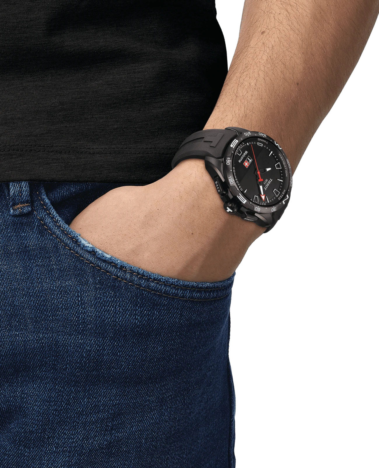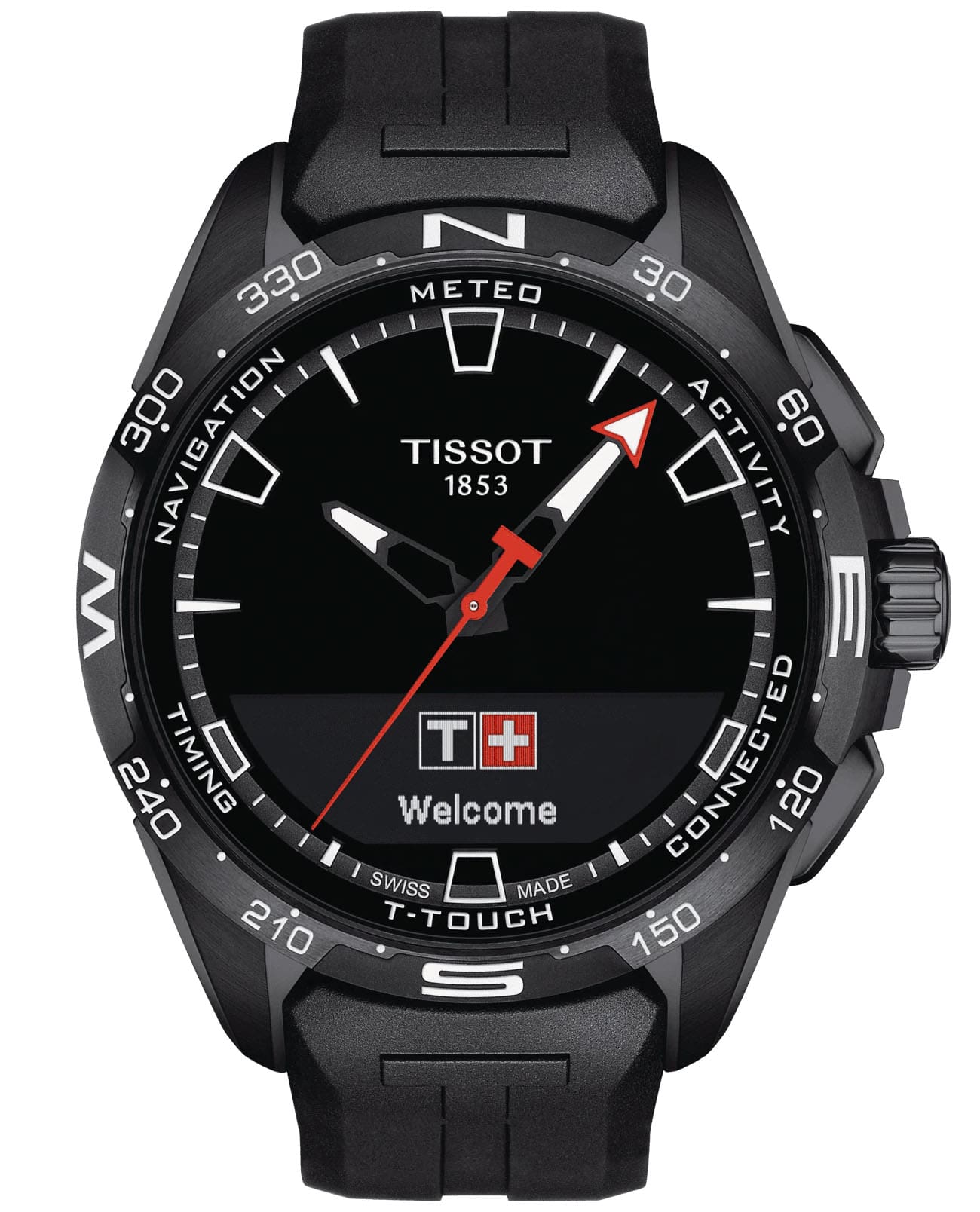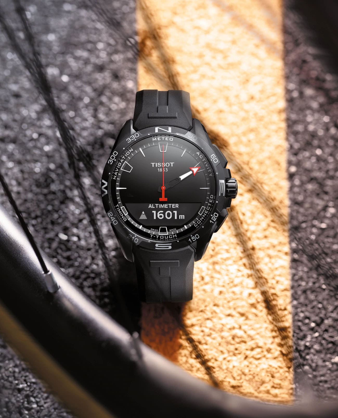 Модель оснащена сапфировым сенсорным стеклом. В основе работы часов находится ПО Swiss Autonomous Low Power System (SwALPS) со сверхнизким потреблением энергии. За счёт технологии аксессуар получил увеличенное до 6 месяцев время работы без необходимости подзарядки. Швейцарский кварцевый механизм ETA E32.001 отличается высокой точностью хода. Корпус выполнен из титана с PVD-покрытиемPVDУльтратонкое покрытие наносится в технике вакуумного напыления, сочетает в себе нитрид титана особой прочности со слоем золота или оксида хрома. Несёт в себе декоративную или защитную функцию., безельБезельВнешний ободок, закрепляющий стекло. В спортивных часах так называется поворотное кольцо с делениями на циферблате, выполняет роль таймера – замеряет отрезки времени на шкале. Неподвижный безель – элемент декора. Однонаправленно вращающийся безель на дайверских часах позволяет фиксировать моменты погружения и выныривания на поверхность. из керамики, ремешок изготовлен из каучука. Функции: будильник, хронографХронографФункция позволяет измерять отрезки времени с особой точностью: часы, минуты, секунды. Верным признаком хронографа является наличие на циферблате 3 дополнительных окошек-счётчиков., барометр, метеопрогноз, высотомер.