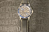 Ремешок выполнен из натуральной кожи чёрного цвета и дополнен классической застёжкой-пряжкой. Модель обладает водонепроницаемостью до 100 метров, что делает её подходящей для активного повседневного использования.