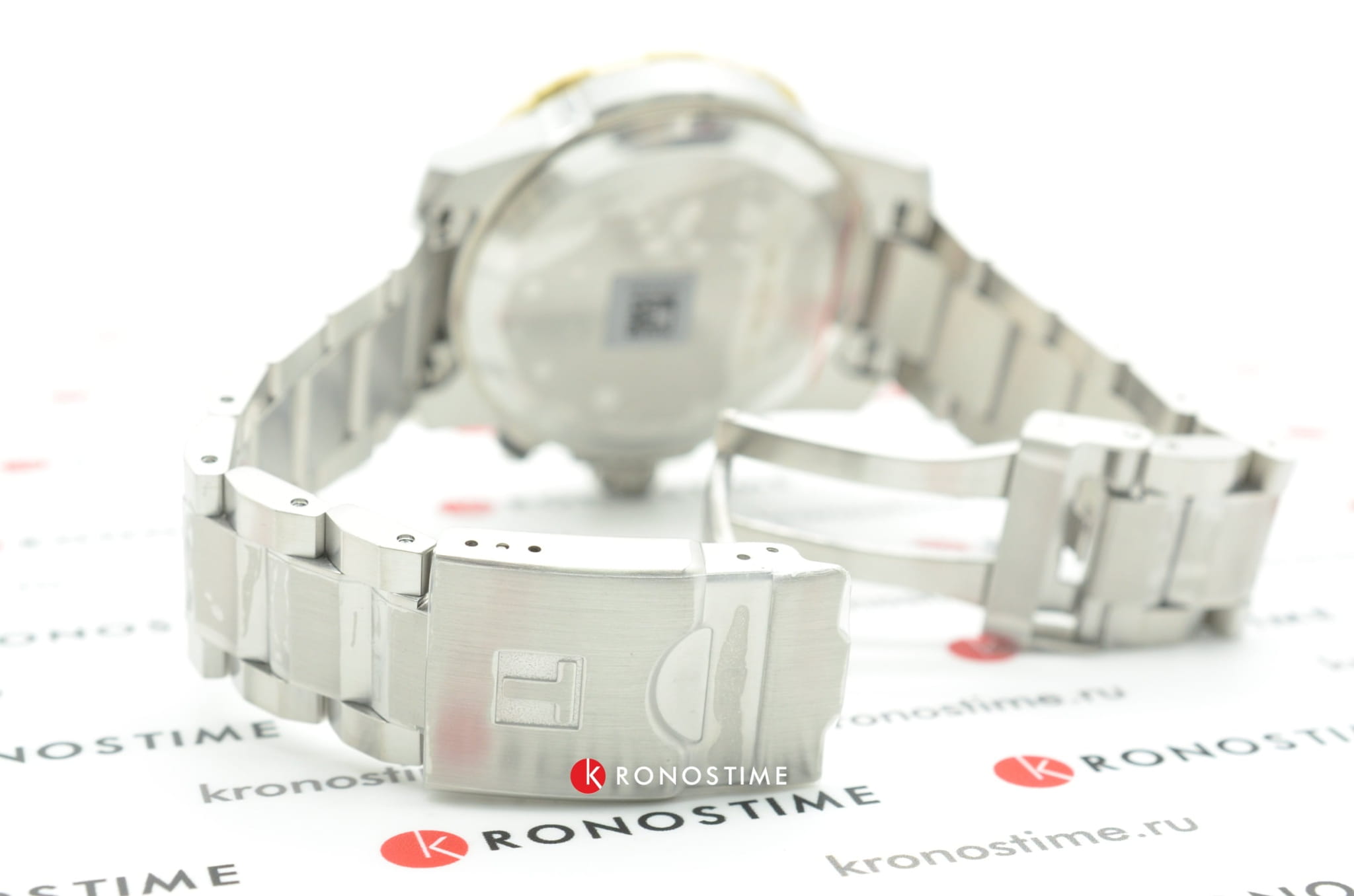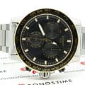 Современный хронографХронографФункция позволяет измерять отрезки времени с особой точностью: часы, минуты, секунды. Верным признаком хронографа является наличие на циферблате 3 дополнительных окошек-счётчиков. поможет подчеркнуть продуманный образ делового мужчины. Модель выполнена в спокойной серебристо-чёрной расцветке. Наручные часы функционируют благодаря швейцарскому кварцевому механизму ETA G10.212. Калибр отличается максимальной точностью хода. Стекло из сапфира. Водостойкость 100 метров. Надёжный корпус из антикоррозионной стали 316L с жёлтым PVD-покрытиемPVDУльтратонкое покрытие наносится в технике вакуумного напыления, сочетает в себе нитрид титана особой прочности со слоем золота или оксида хрома. Несёт в себе декоративную или защитную функцию.. Люминесцентная подсветкаЛюминесцентное покрытиеПозволяет считывать показания времени в темноте. Производители наносят на стрелки, часовые индексы, безель или поверхность циферблата светонакопительный состав, дающий холодное свечение. стрелок и индексов. Секундомер, отображение даты. Диаметр корпуса: 45,5 мм.