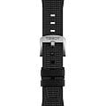 Корпус часов изготовлен из нержавеющей стали марки 316 серебристого цвета. Устойчивое к появлению царапин сапфировое стеклоСапфировое стеклоПрочный и надёжный материал из кристалла сапфира синтетического происхождения, характеризующийся особой твёрдостью и устойчивостью к царапинам и повреждениям. с антибликовым покрытием. Класс водозащиты: 100 метров, позволит плавать, нырять и заниматься другими водными видами спорта. Стрелки и метки покрыты люминесцентным покрытиемЛюминесцентное покрытиеПозволяет считывать показания времени в темноте. Производители наносят на стрелки, часовые индексы, безель или поверхность циферблата светонакопительный состав, дающий холодное свечение. Силиконовый ремешок черного цвета с классической застежкой.
