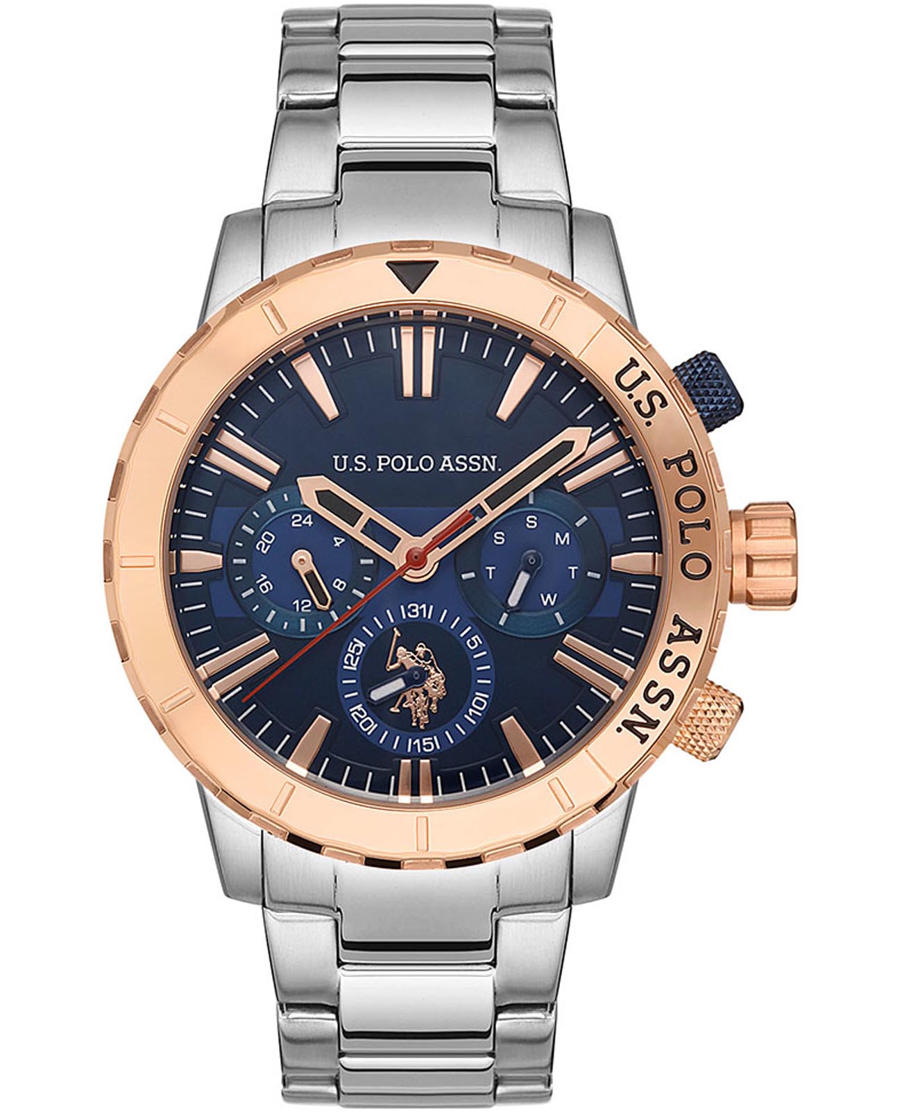 Мужские часы U.S. Polo Assn. Crossing USPA1026-01, кварцевый механизм с высокой точностью. Минеральное стеклоМинеральное стеклоМинеральное стекло представляет собой искусственно выращенный минерал кварца. Такое стекло отличается особой устойчивостью к повреждениям и царапинам. Уступает по некоторым качествам сапфировому стеклу. устойчивое к появлению царапин, обладающее высокой прозрачностью. Корпус и браслет изготовлены из нержавеющей стали. На циферблате три дополнительных индикатора. БезельБезельВнешний ободок, закрепляющий стекло. В спортивных часах так называется поворотное кольцо с делениями на циферблате, выполняет роль таймера – замеряет отрезки времени на шкале. Неподвижный безель – элемент декора. Однонаправленно вращающийся безель на дайверских часах позволяет фиксировать моменты погружения и выныривания на поверхность. из нержавеющей стали с IP-покрытиемIP-покрытиеМетод ионного напыления. Демонстрирует повышенную устойчивость к истиранию, окислению и химическим веществам. Под воздействием высокого давления и температуры около 1500°C молекулы металла надёжно соединяются с частицами корпуса часов.. Центральные часовая, минутная и секундная стрелки. Индикация даты и дня недели. 12/24х часовой формат времени. Стрелки с люминесцентным покрытиемЛюминесцентное покрытиеПозволяет считывать показания времени в темноте. Производители наносят на стрелки, часовые индексы, безель или поверхность циферблата светонакопительный состав, дающий холодное свечение.. Класс водозащиты: 50 метров, позволит защитить корпус от случайных брызг или капель дождя. Стальной браслет на раскладной застёжкеРаскладная застёжкаТакой тип застёжки используется только на браслетах из металла. Она никогда не раскрывается полностью, происходит разделение на 2 и более частей. Раскладывающая застёжка снизит вероятность потери часов к минимуму..