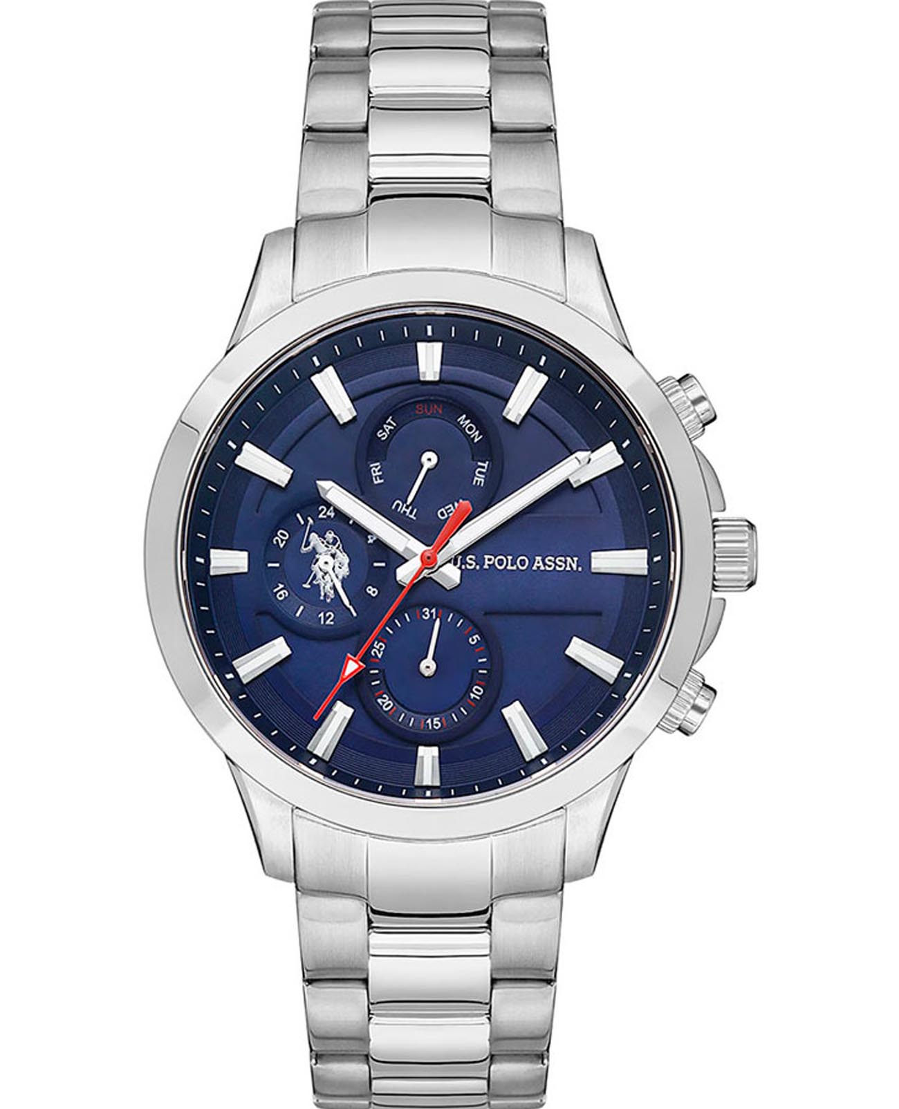 Мужские часы U.S. Polo Assn. Crossing USPA1035-02, кварцевый механизм с высокой точностью. Минеральное стеклоМинеральное стеклоМинеральное стекло представляет собой искусственно выращенный минерал кварца. Такое стекло отличается особой устойчивостью к повреждениям и царапинам. Уступает по некоторым качествам сапфировому стеклу. устойчивое к появлению царапин, обладающее высокой прозрачностью. Центральные часовая, минутная и секундная стрелки. Индикация даты и дня недели. 12/24х часовой формат времени. Корпус и браслет изготовлены из нержавеющей стали. На циферблате три дополнительных индикатора. Стрелки и метки с люминесцентным покрытиемЛюминесцентное покрытиеПозволяет считывать показания времени в темноте. Производители наносят на стрелки, часовые индексы, безель или поверхность циферблата светонакопительный состав, дающий холодное свечение.. Класс водозащиты: 50 метров, позволит защитить корпус от случайных брызг или капель дождя. Стальной браслет на раскладной застёжкеРаскладная застёжкаТакой тип застёжки используется только на браслетах из металла. Она никогда не раскрывается полностью, происходит разделение на 2 и более частей. Раскладывающая застёжка снизит вероятность потери часов к минимуму..